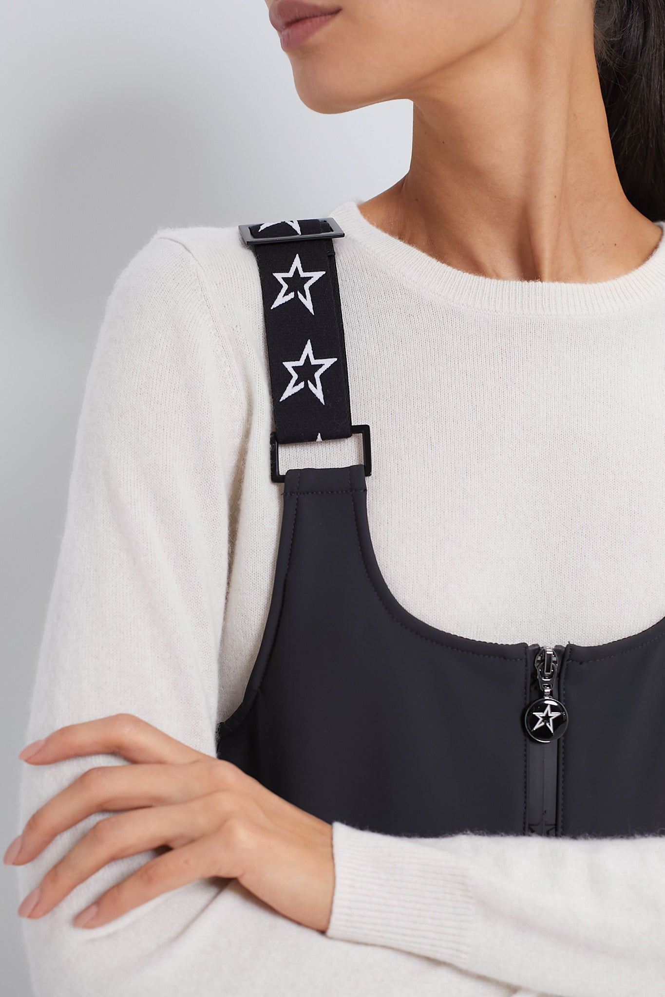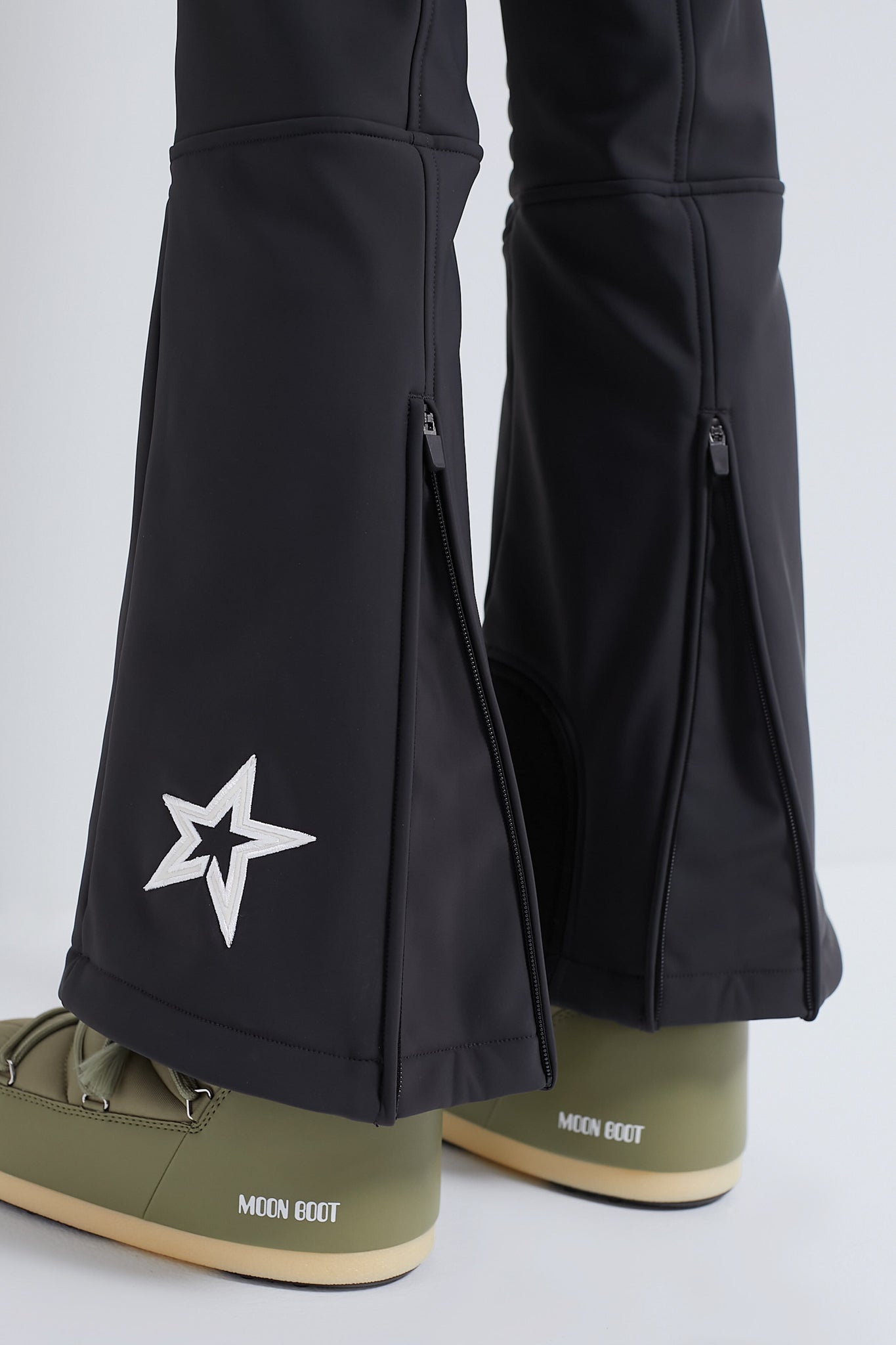 Crafted with Toray Dermizax technology, these bib ski pants ensure water-resistant breathability, while the 4-way stretch guarantees movement. The flared silhouette and ski-bib-inspired design offer a flattering fit, while the snow gaiters and extendable leg offer added versatility. With fleece lining for warmth, you can pair with just a base layer underneath or add a thicker sweater for colder days.