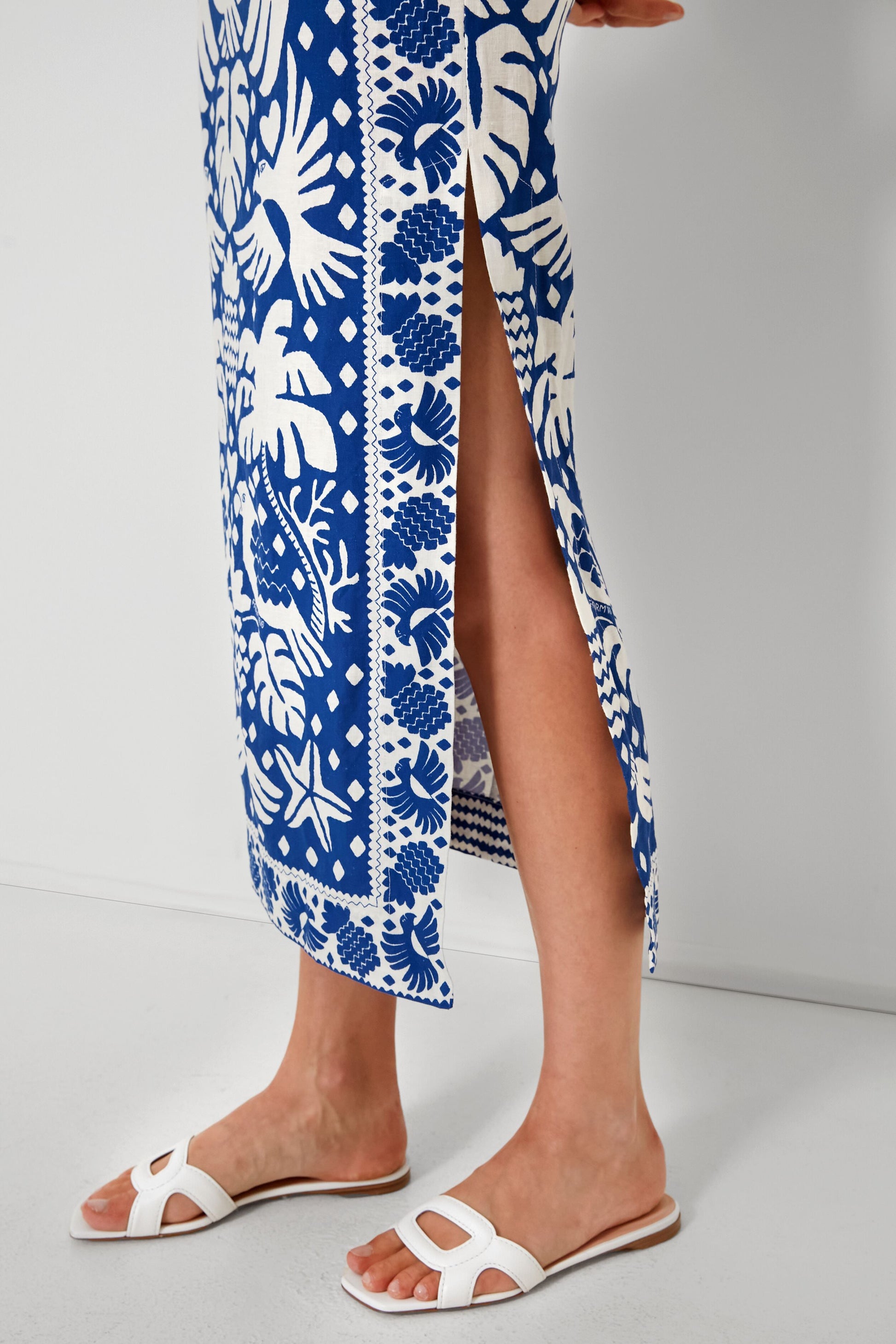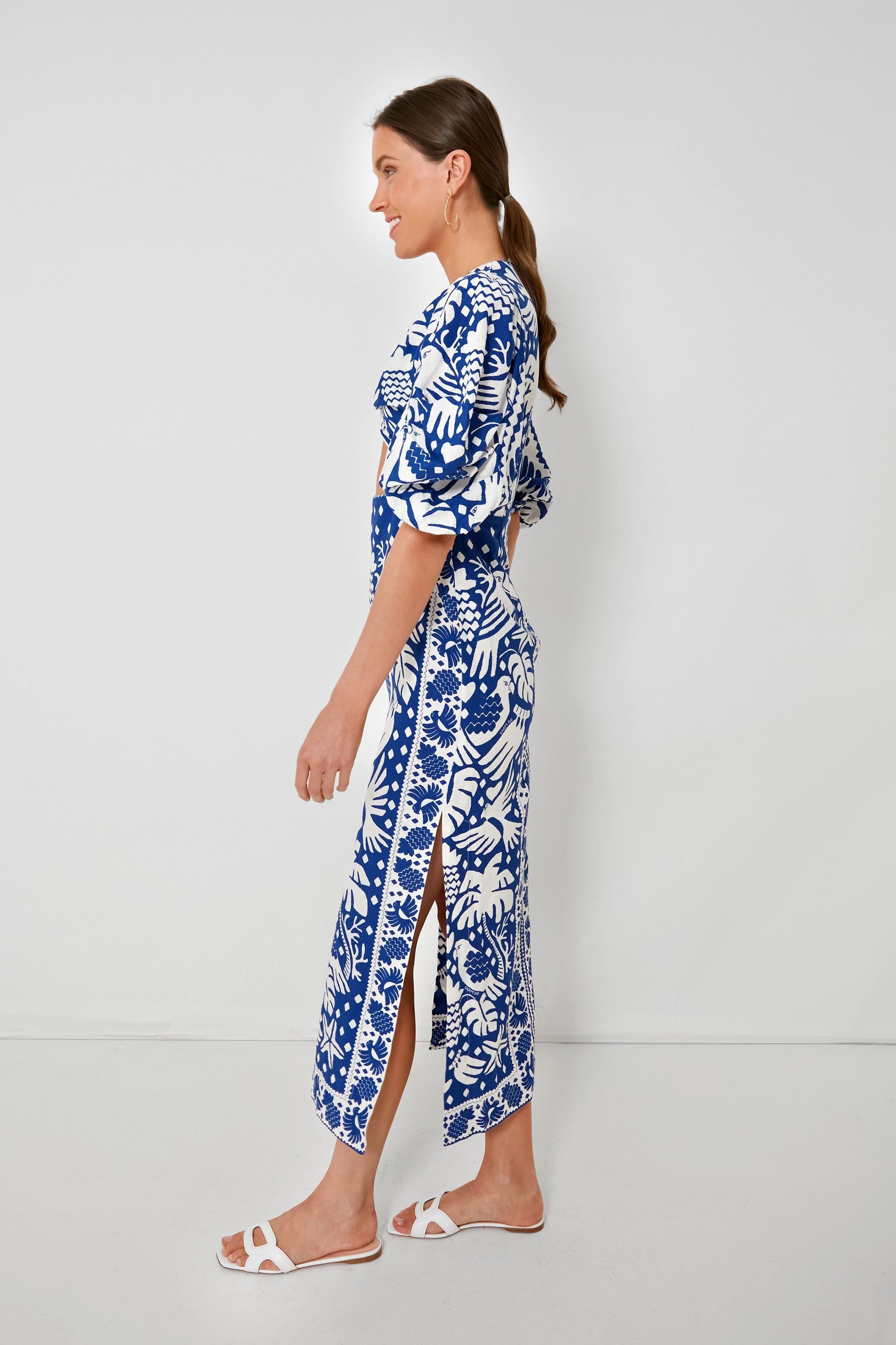 Dramatic puff sleeves frame the boldly patterned Jungle Scarf Navy Dress to create something incredible. In stunning shades of cobalt blue and bright white, this midi is all kinds of eye-catching and jaw-dropping — like, come on, look at that deep V-neckline and knotted bodice with a sleek cutout! Complete with side slits at the hem to promote easy movement so you can dance around in it (and we know you'll want to!), this is the perfect event-ready silhouette when paired with heels and a clutch.