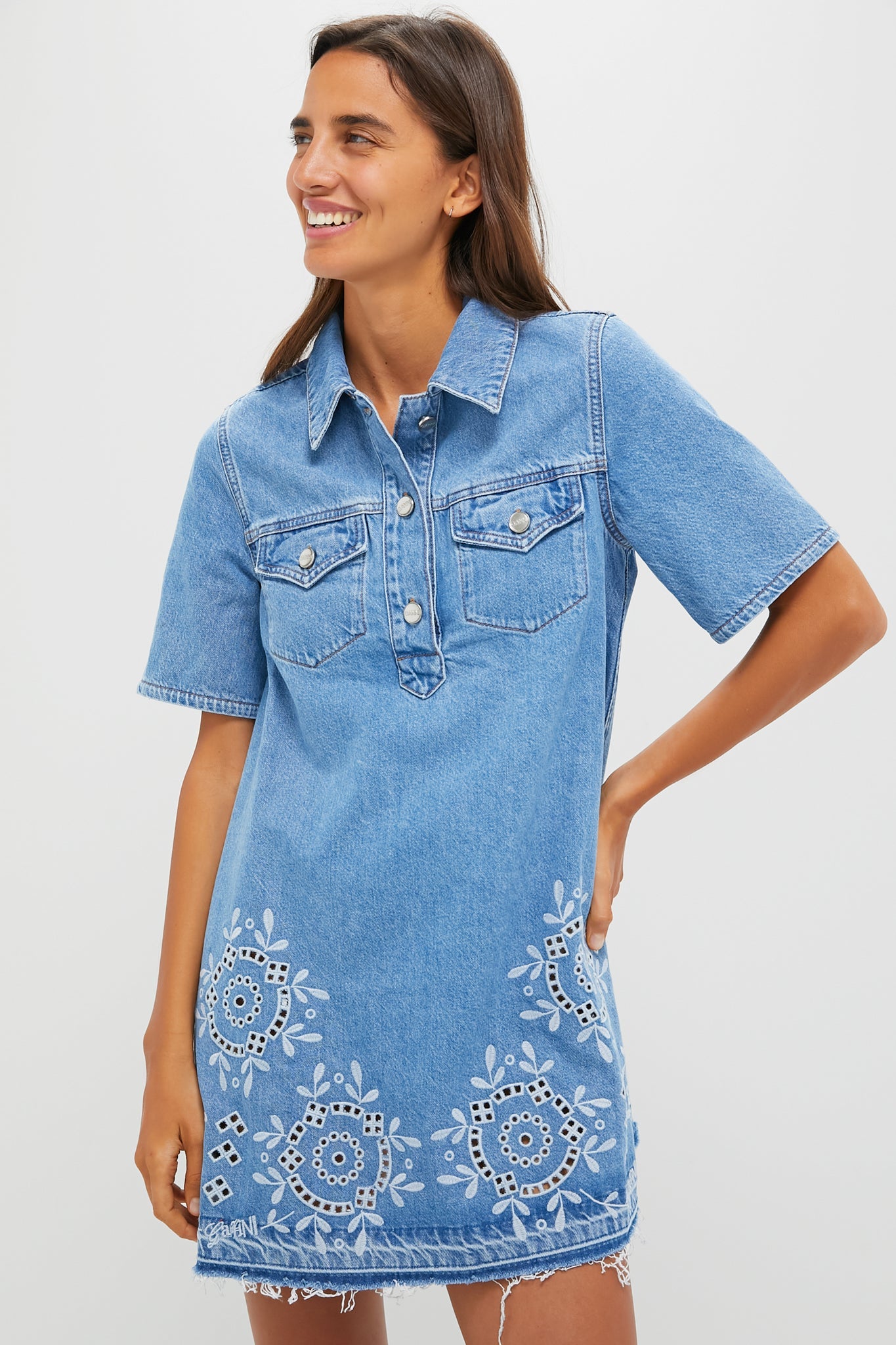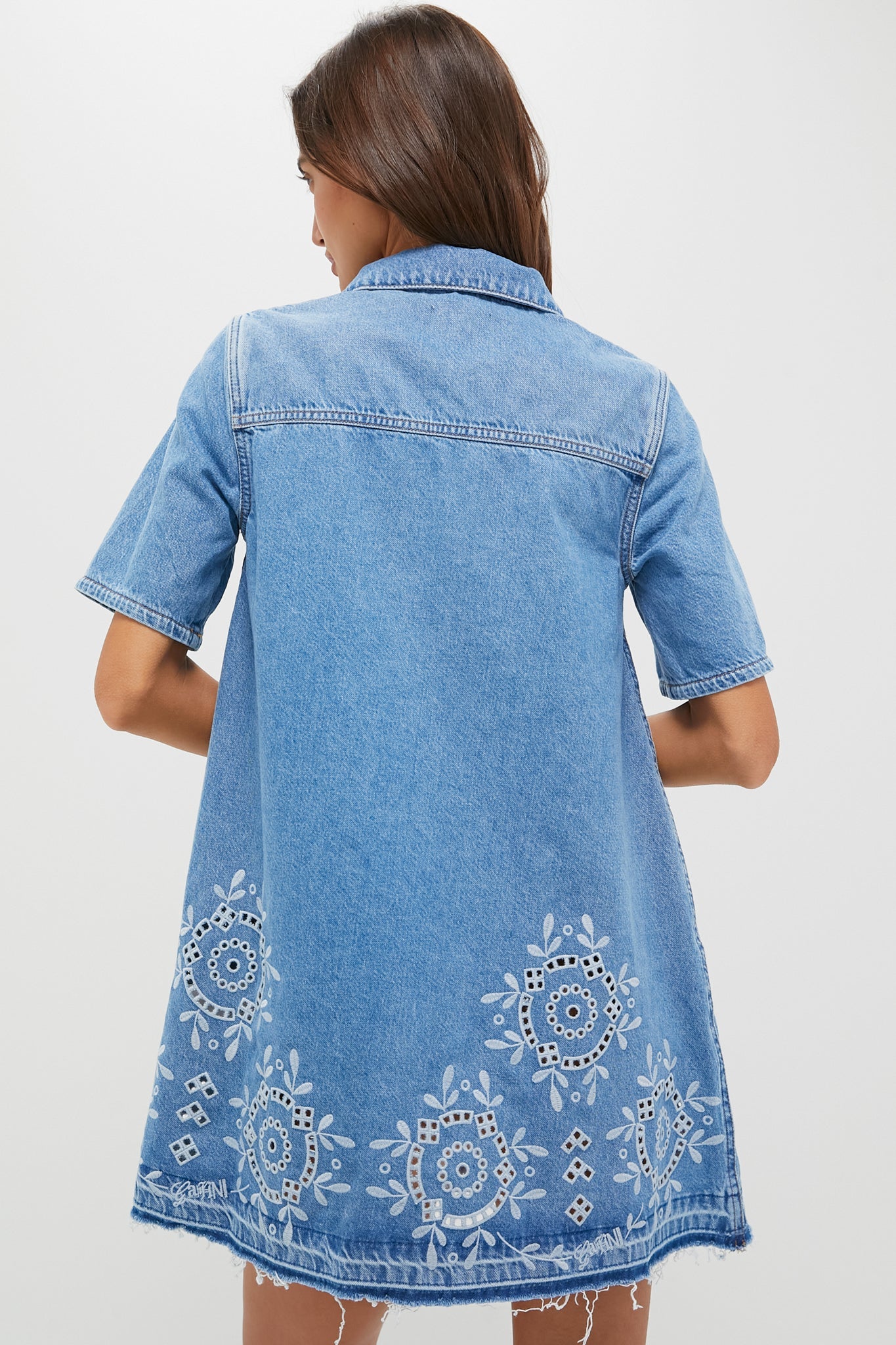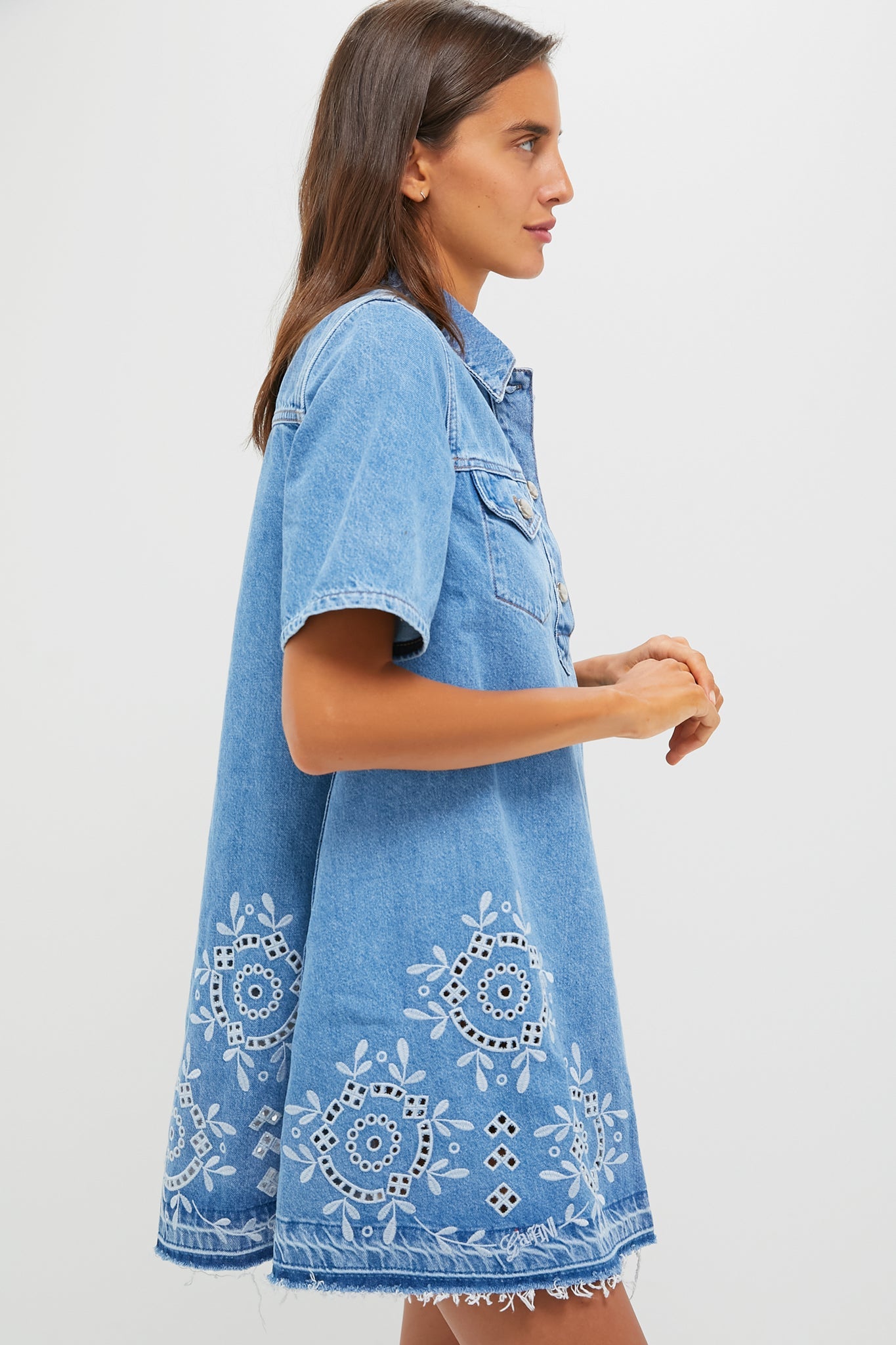 The Light Blue Stone Broderie Anglaise Dress strikes a balance of casual and refined. With a collar, button closure, front pockets, A-line silhouette, and beautiful embroidered details - it's perfect for effortless weekend vibes. Pair it with sandals for daytime outings or dress it up with heels for an elevated touch.