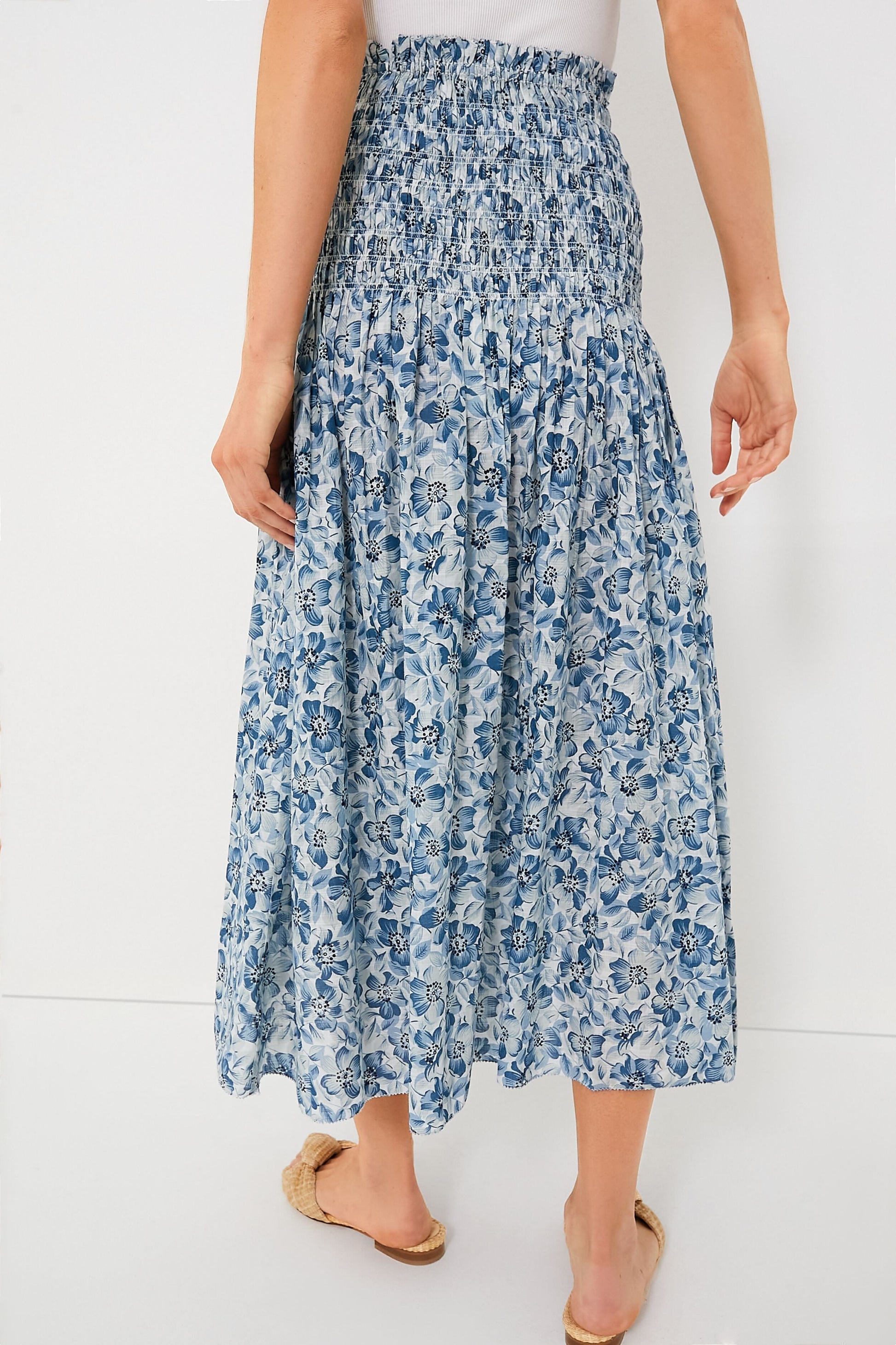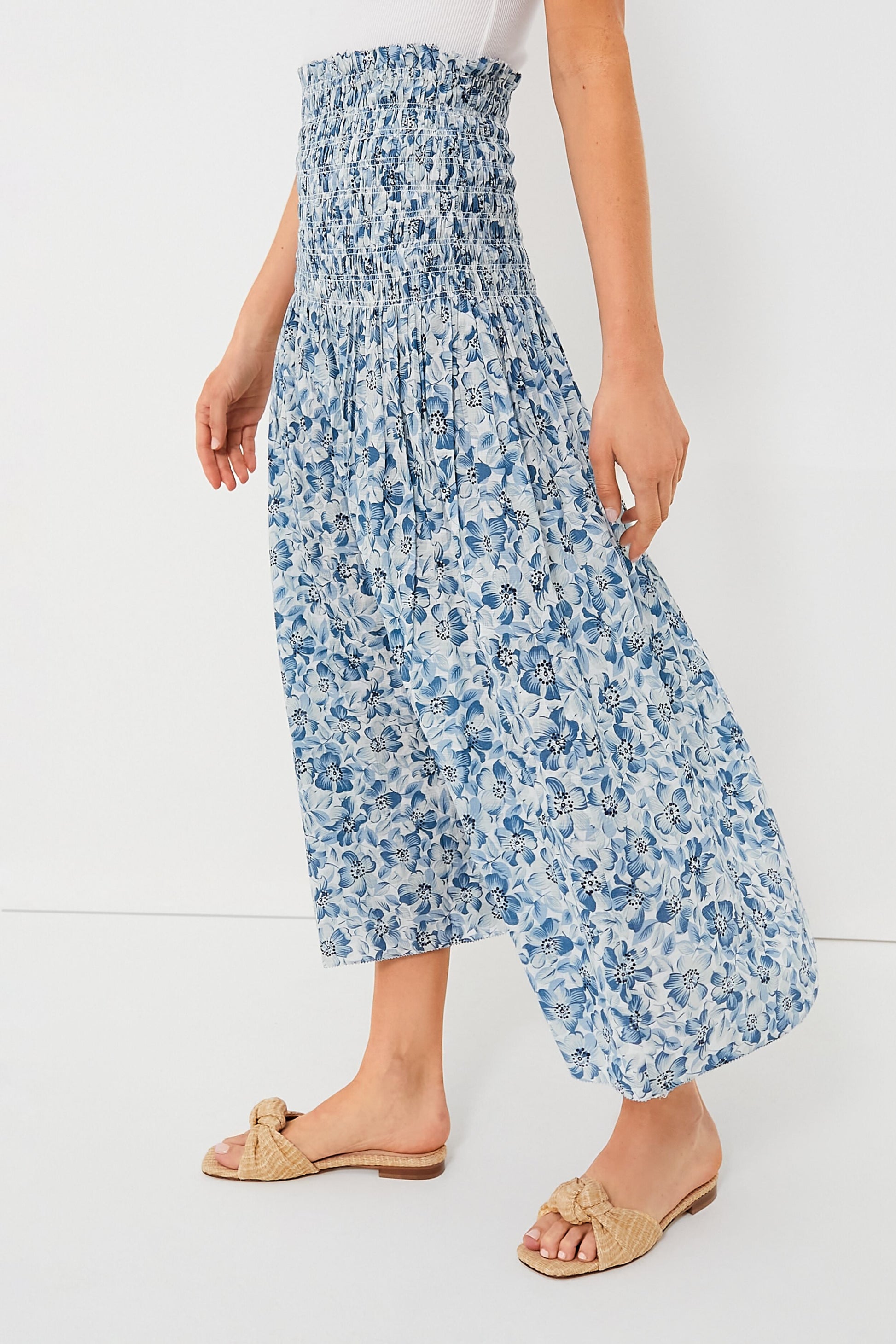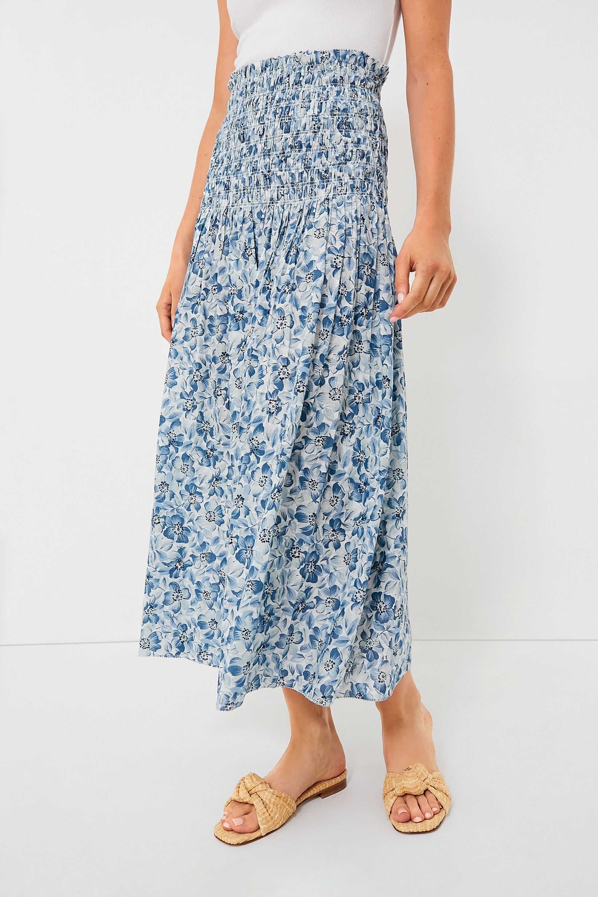 Introducing The Knoll Skirt—a pull-on style featuring an elegant, wide smocked waistband for a snug fit that releases into a sweeping hemline just above the ankle. The delicate ruffled waist edge is adorned with a picot embroidery stitch for added detail and charm. We are pairing this with a white tank or with the matching Light Sky Pressed Floral Print The Wren Top for a seamless set.