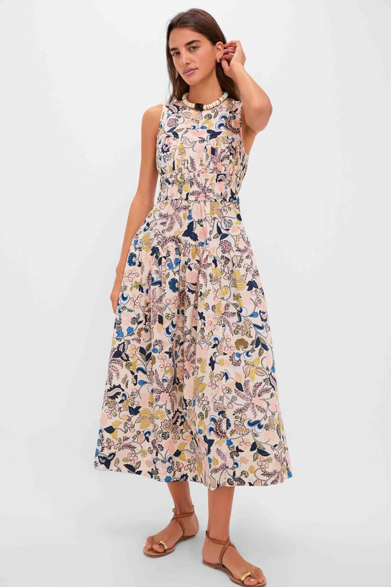 The Magnolia Elenora Sleeveless Midi Dress is a stunning summer frock. With a high neckline, comfortable elastic band at the waistline, side seam pockets, and botanical print all over, this midi is sure to please. Pair with sandals and a handbag, for everyday wear or add wedges when you just need a little something extra!