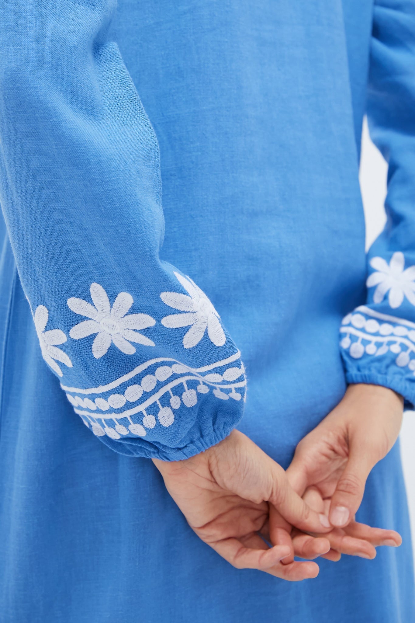 The Marina and White Embroidered Caftan will give your wardrobe the ultimate resort treatment. Featuring intricate embroidery, elastic cinched cuffs, and side slits for easy movement, this effortless silhouette is perfect for throwing on over a bathing suit with sandals to meet up with friends or paired with wedges and a clutch for an afternoon lunch date!