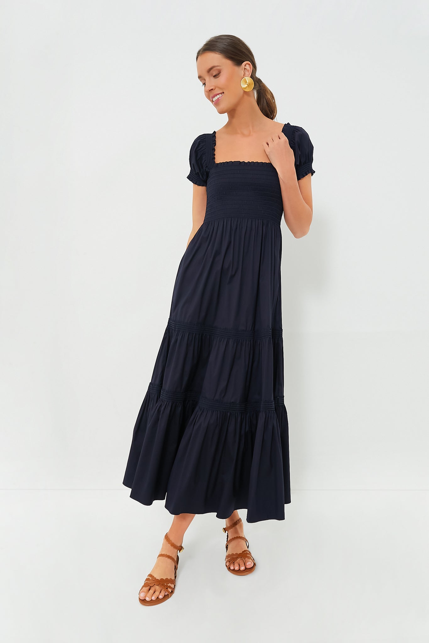 The Medium Navy Cotton Dress is sure to earn you some compliments. Full of feminine details like a smocked bodice, tiered skirt, square neck with short puff sleeves that can be worn on or off the shoulders, this midi is about to become your best friend for all special occasions from holiday parties to summertime event dressing. Dress it up or down, wear it with heels or sandals, the possibilities are endless for this timeless number.