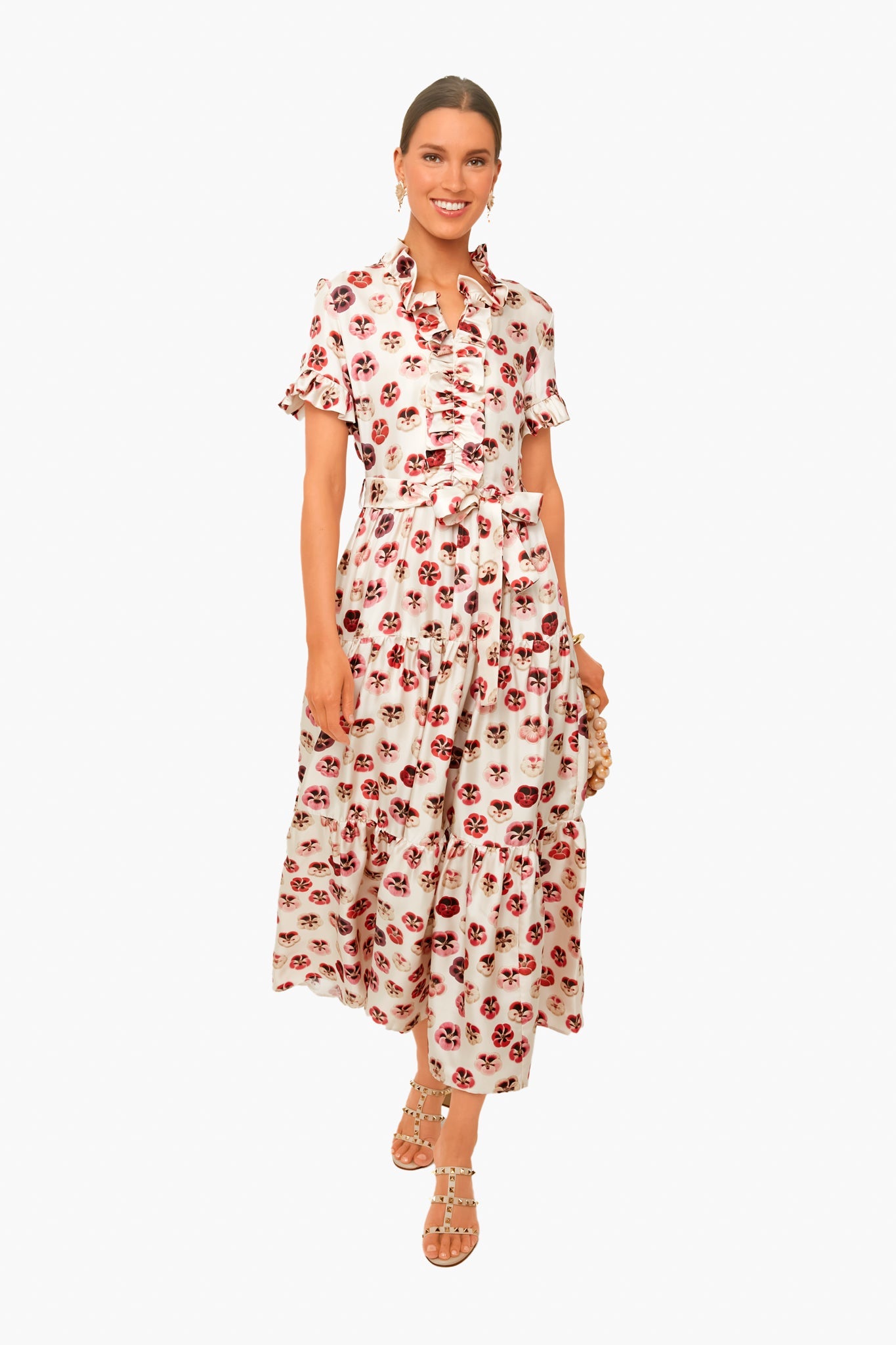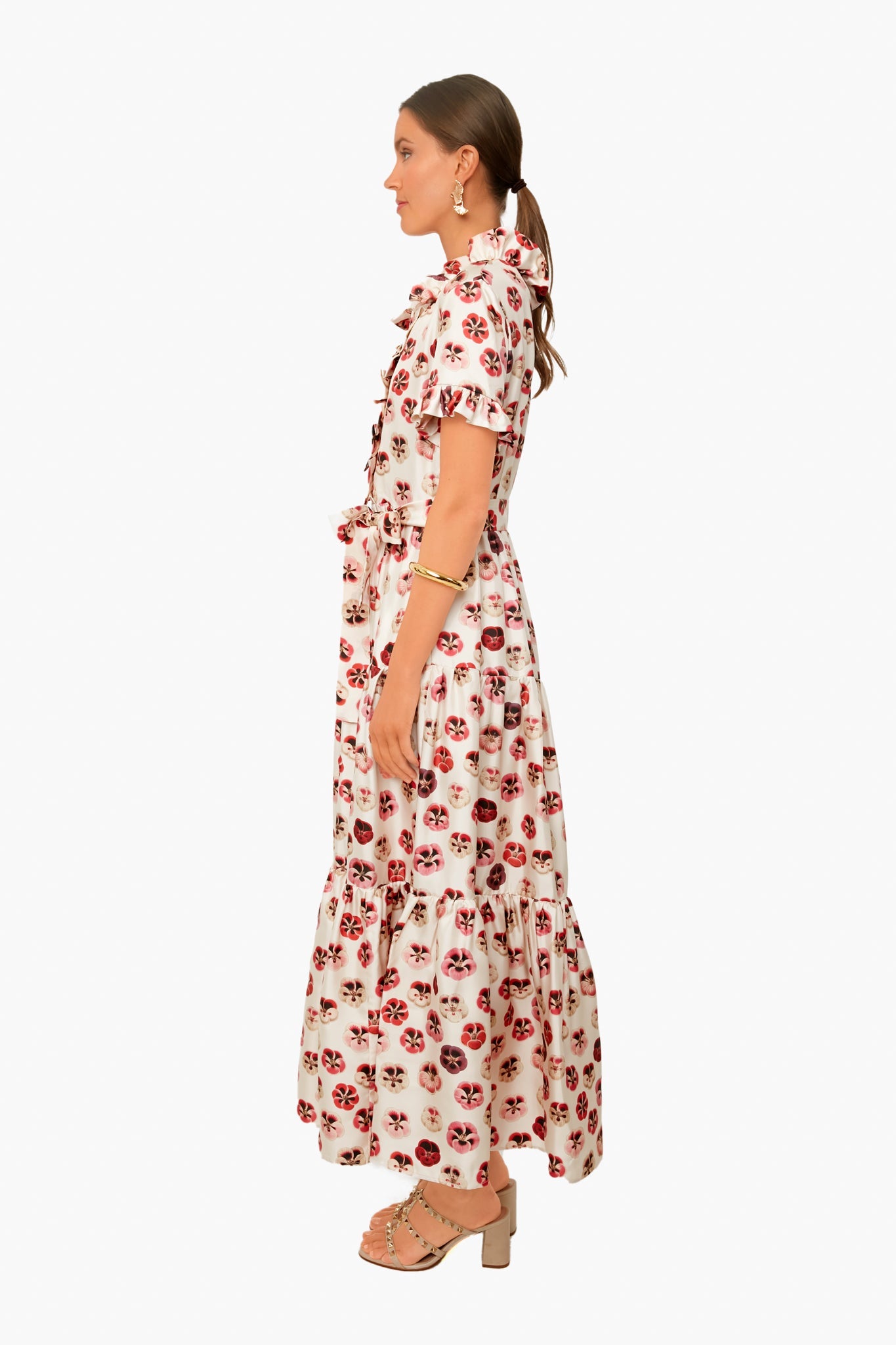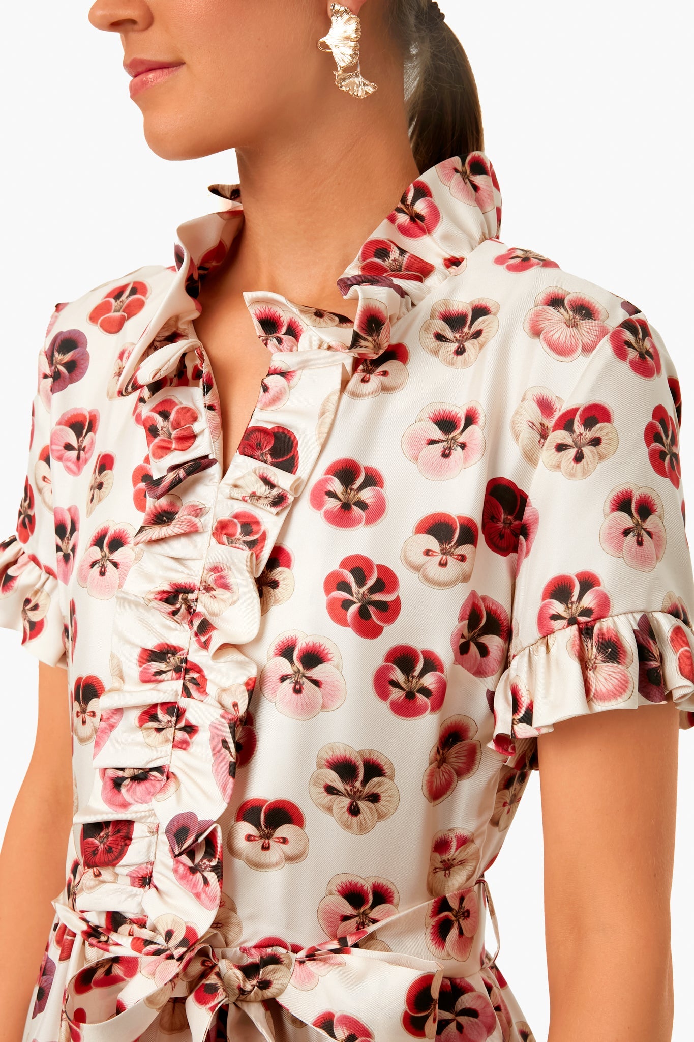The Micro Pansy Long and Sassy Dress is sure to make you the best-dressed guest. Made from luxe silk with a stunning print, this style features a beautifully pleated collar, ruffled cap sleeves, self-tie belt, and a floor sweeping tiered skirt. Stand out from the crowd by adding gold jewelry and heels!