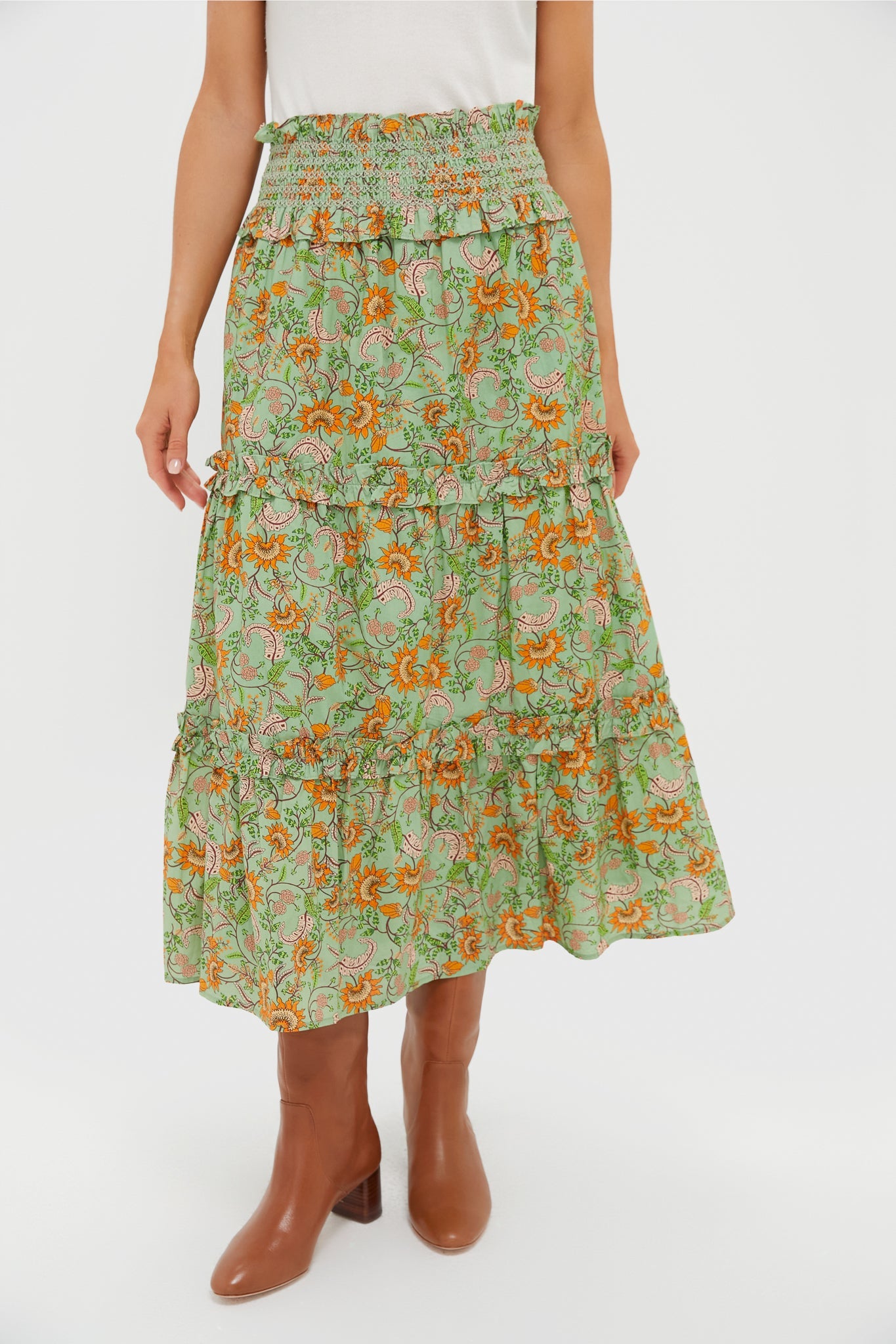 Mint and Orange Floral Smocked Odette Midi Skirt