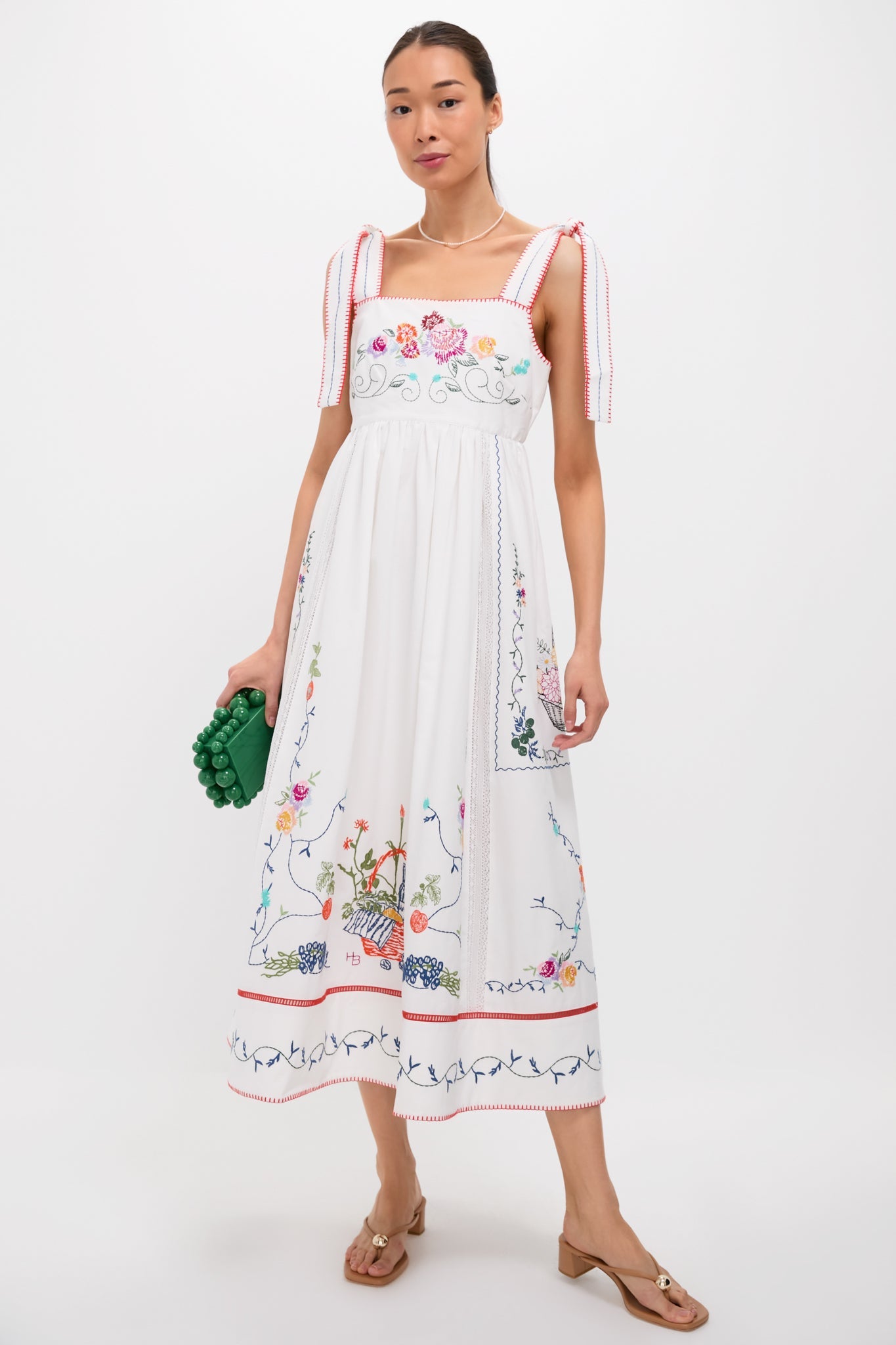 The Stefy Dress is a summer showstopper, combining artisanal detail with breezy elegance. Designed with tie straps, a flattering empire waist, and a full midi skirt, it's finished with vibrant multicolor embroidery, ladder lace trim, and blanket stitch edging for a handcrafted feel. Made from cotton canvas with a structured bodice and back zip closure, it's equal parts polished and playful—ready for everything from garden parties to getaways.