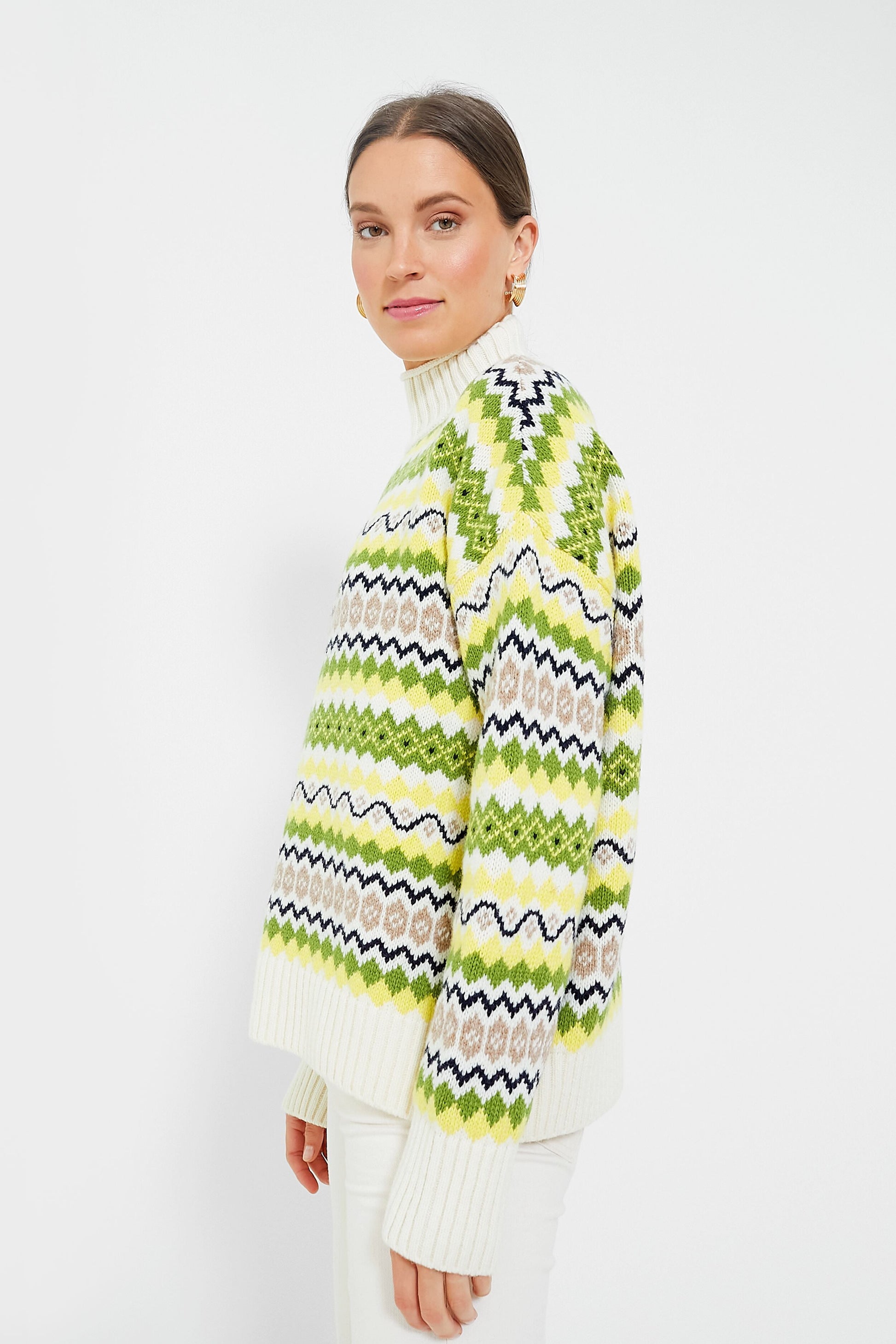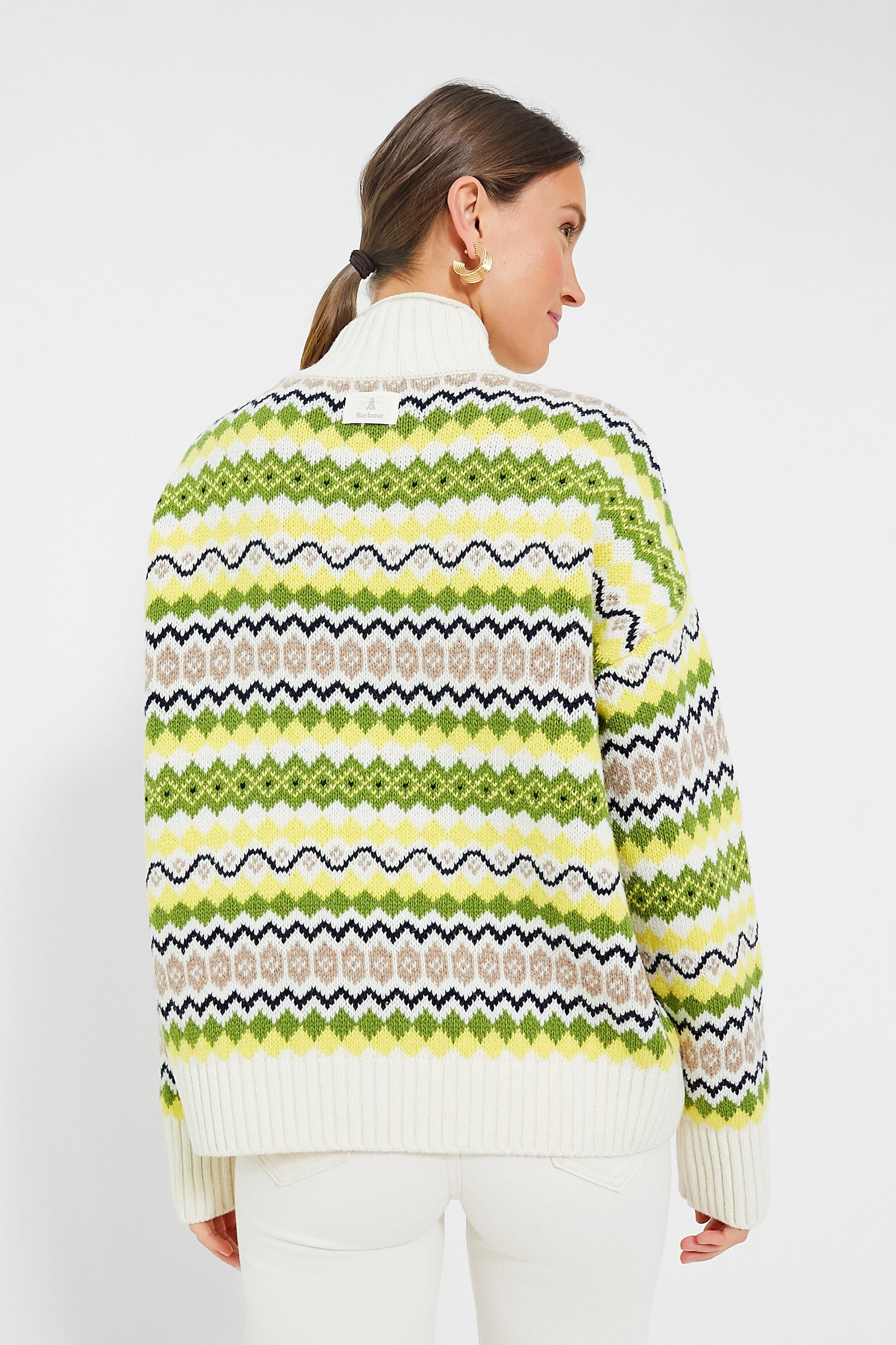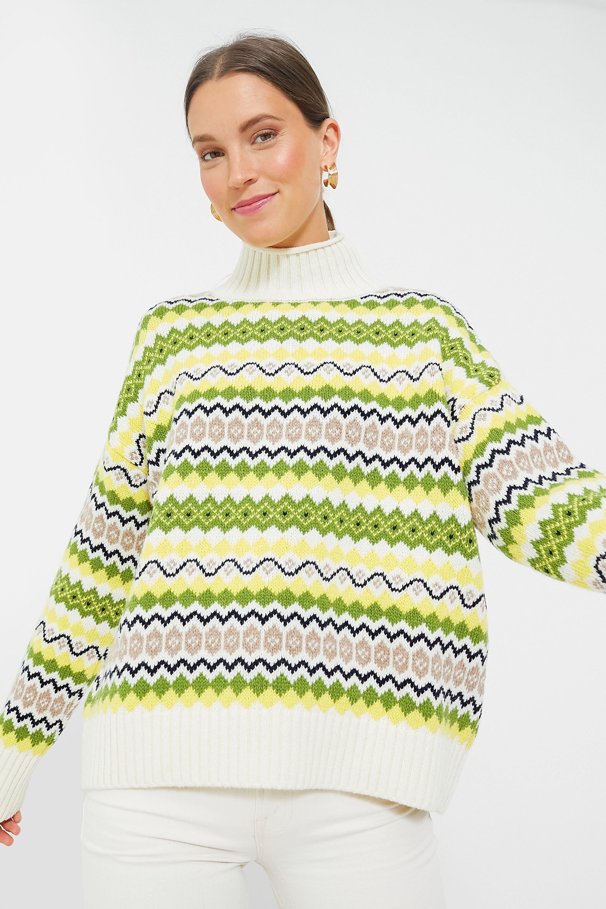 For those looking for a bit of color to brighten grey days, the Multi Holkham Knit has all the sassy and spunky energy you could ever want. This cozy turtleneck features dropped shoulders for a relaxed feel, ribbed cuffs, and a bold Fair Isle motif in shades of lemon yellow and chartreuse that will have you looking your best. Style with denim and boots to watch the leaves change color or chill by the fire, and layer under your go-to jacket for outdoor adventures this season!