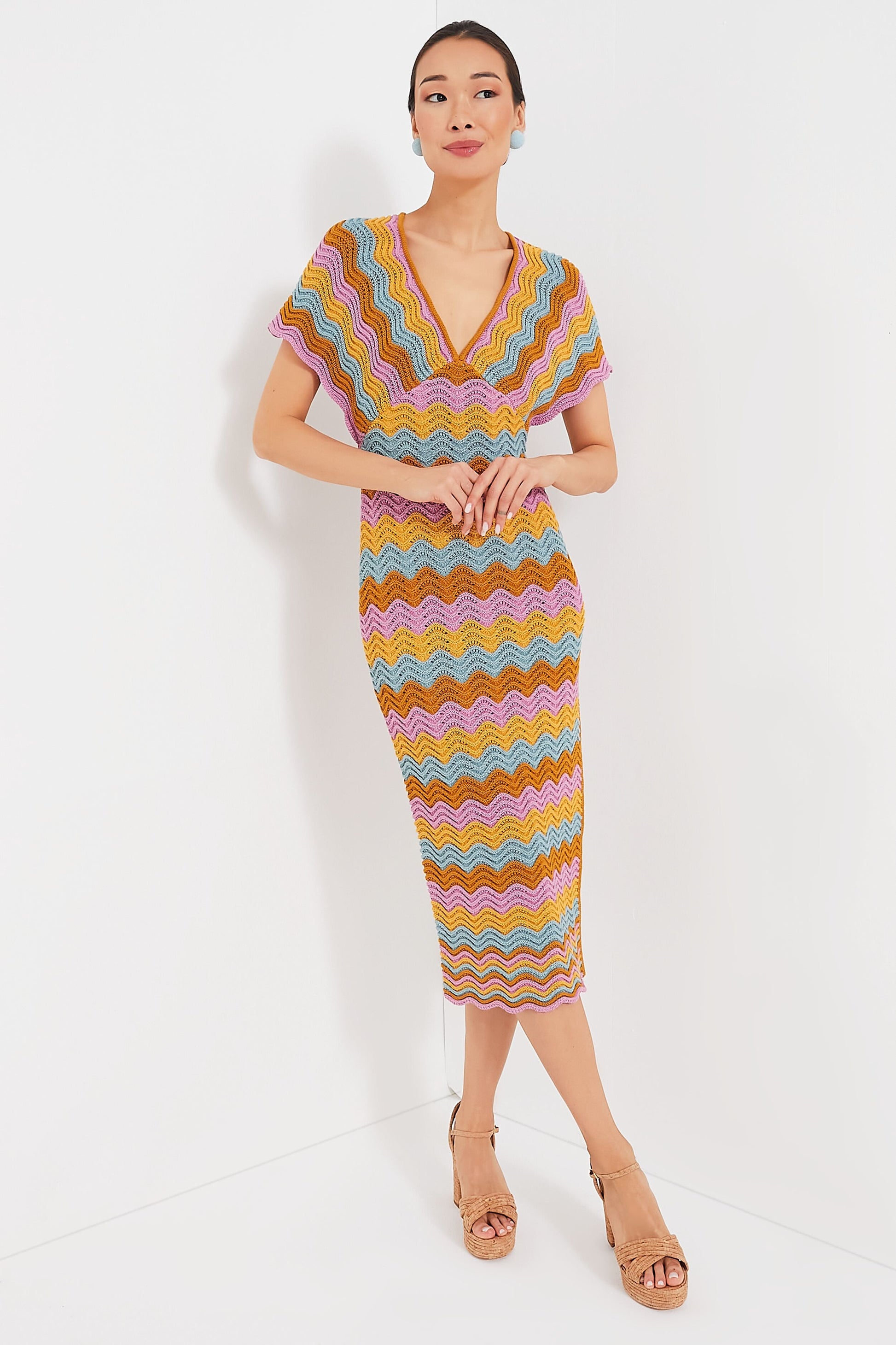 The ultimate mood-booster, the Multi Mindi Dress boasts colorful scallop stripes for a fresh and fun take on summer dressing. Made from soft cotton blend, this maxi has a deep-v neck that can be accessorized with a necklace or two, and alluring side slits gives a flattering fit to any body type. Pair with sandals and a sunhat to relax and enjoy a drink by the pool, or with sneakers and a tote for seeing the sites on vacation!