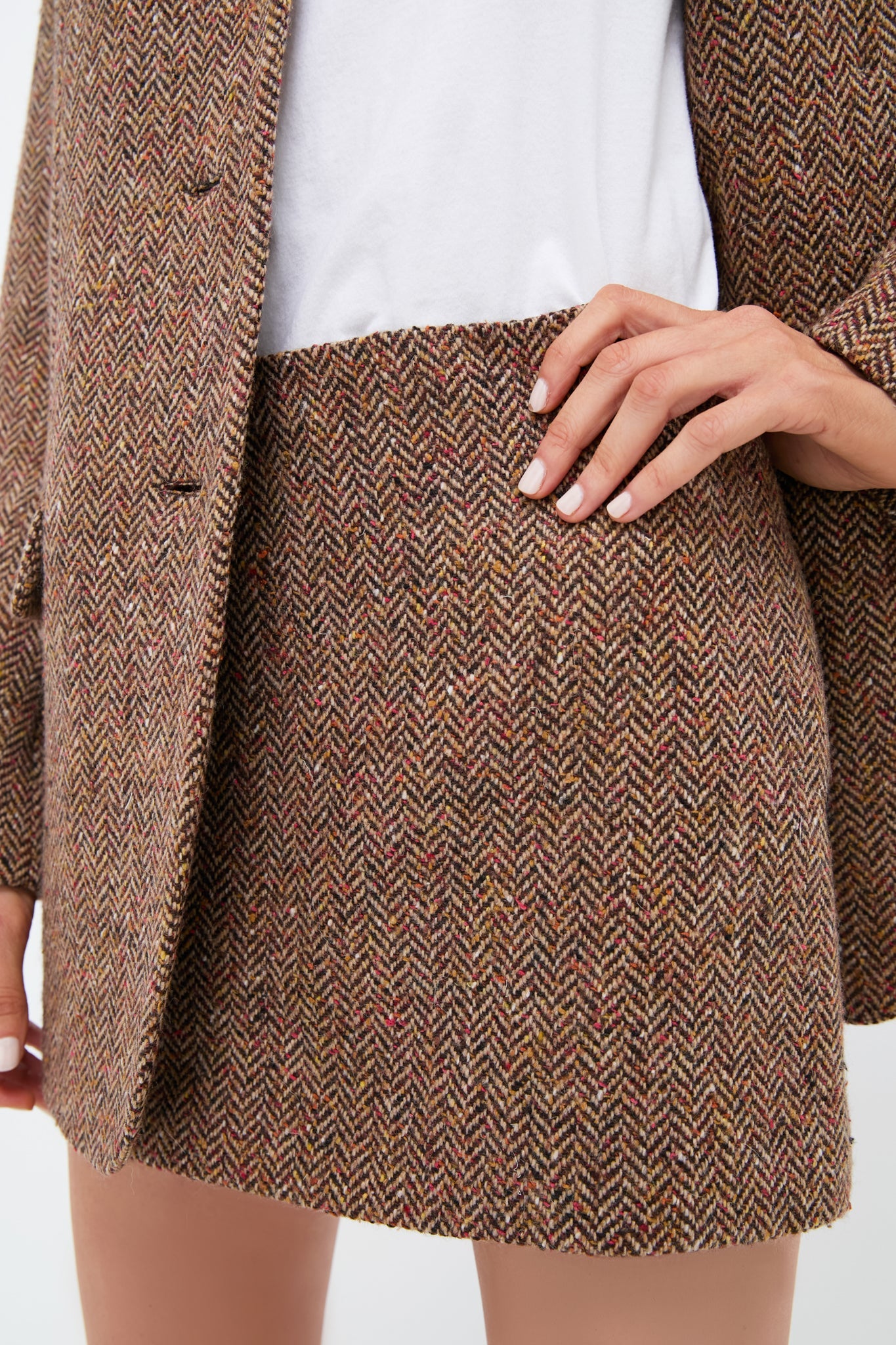 With a classic straight silhouette, the Tolmia mini skirt perfectly pairs with the Jovanka Blazer. Just add flats or heels, a tee or blouse, and gold jewels for a chic and coordinated look.