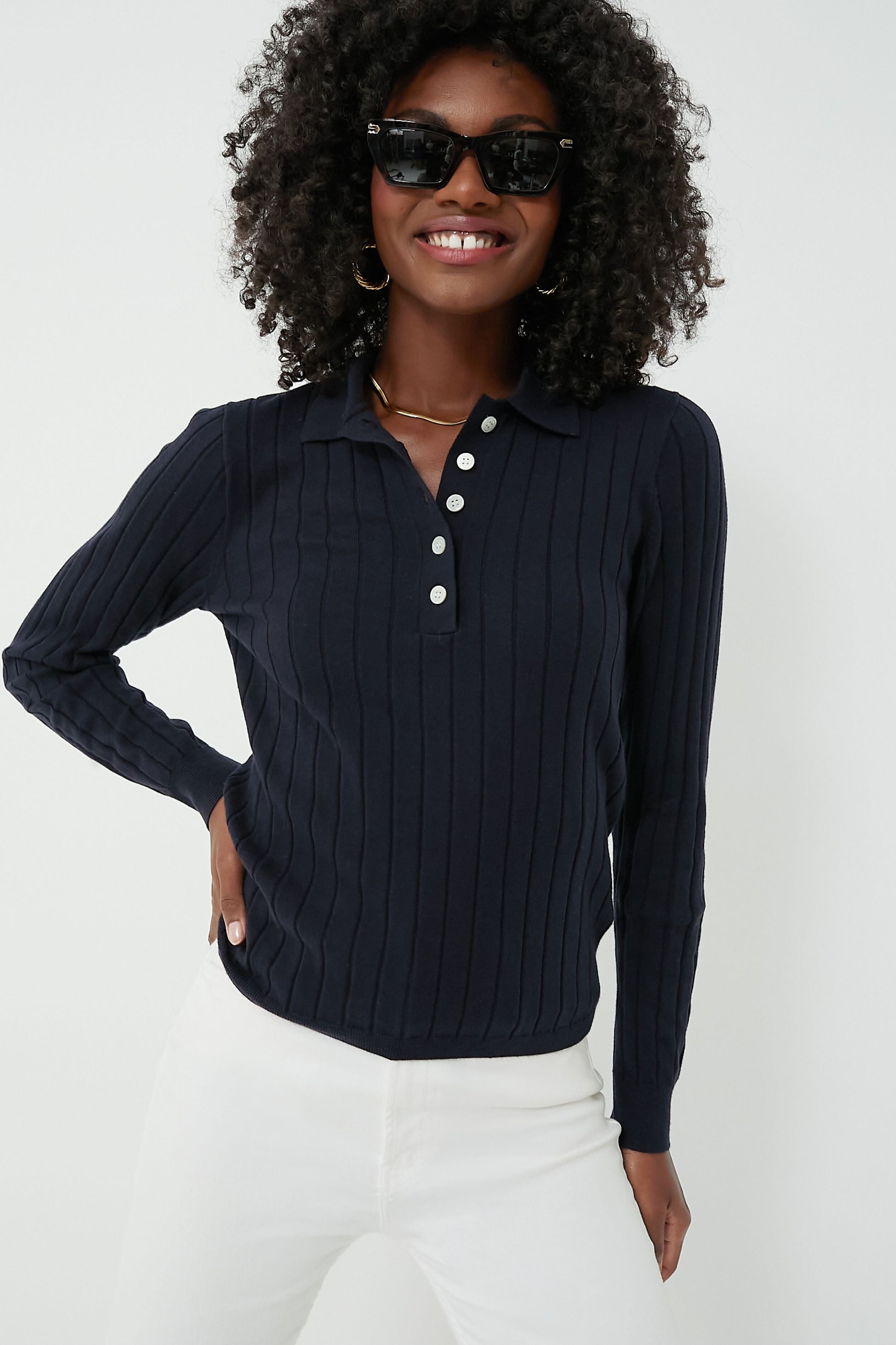 This cozy style staple is a true must-have! The Navy Amanda Polo is as classic as it gets — it features a spread collar, a partial button front placket, and a luxe ribbed texture. Perfect for layering, this solid top is a seamless option for all your styling needs. Pair with your favorite denim and flats for an easy ensemble that's great for everyday, or add a jacket and boots when the weather calls for it!