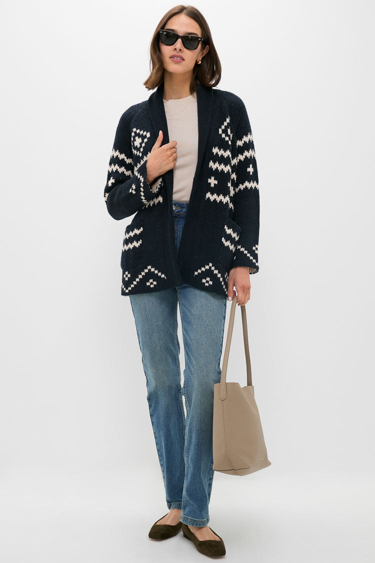 The Reversible Shepherd Cardigan is a longer-length shawl style spun from alpaca in a double jacquard technique for full reversibility. With raglan sleeves, no front closure, and a removable waist tie, it’s easy to wear two ways—on the cream side or navy side.