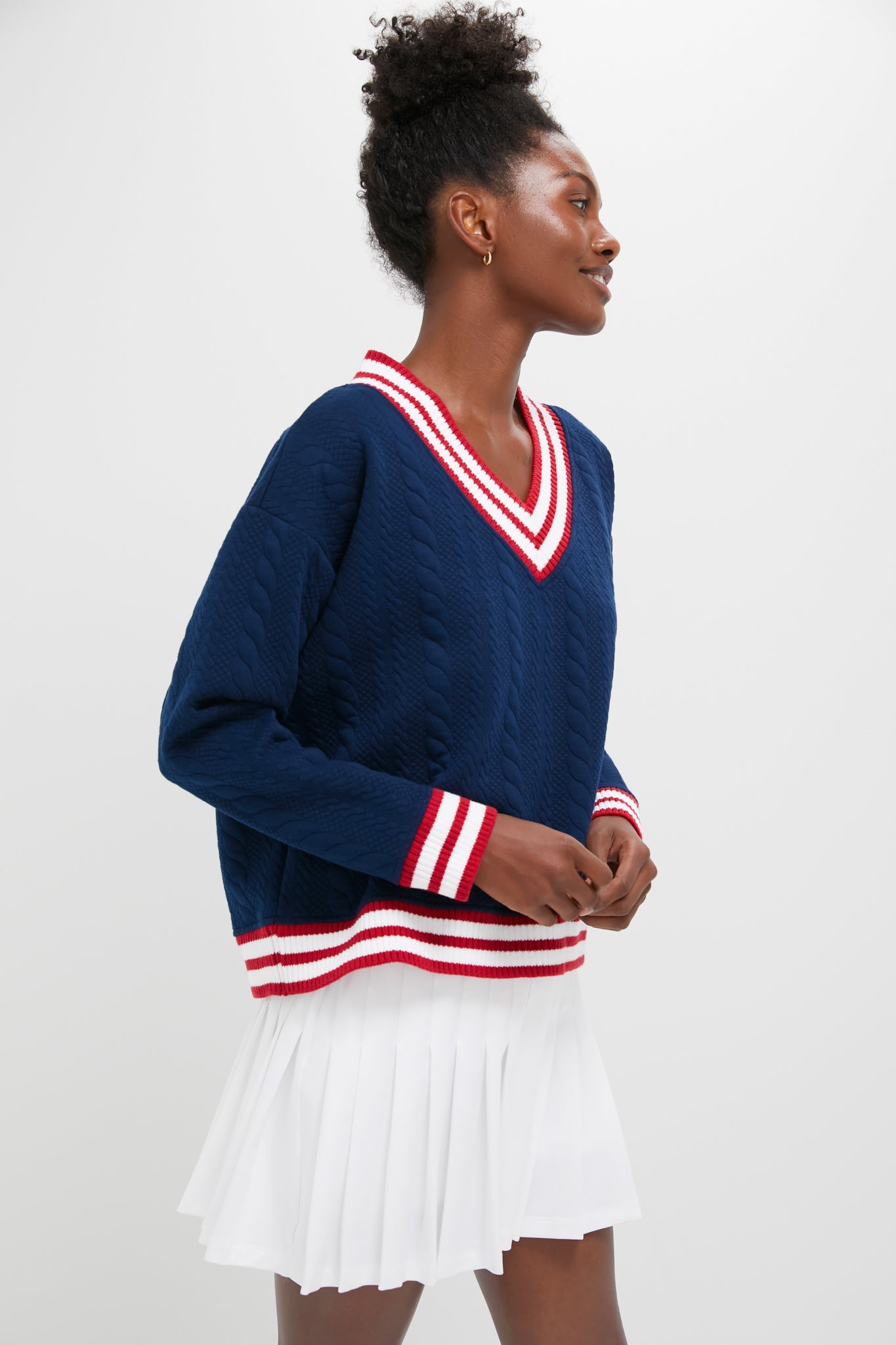 With a relaxed fit, cable-knit texture, and contrast ribbed trim, this easy style is sure to get lots of wear this season. Pair with a tennis skirt and sneakers for morning coffee walks, or with denim shorts and sandals for watching the fireworks.