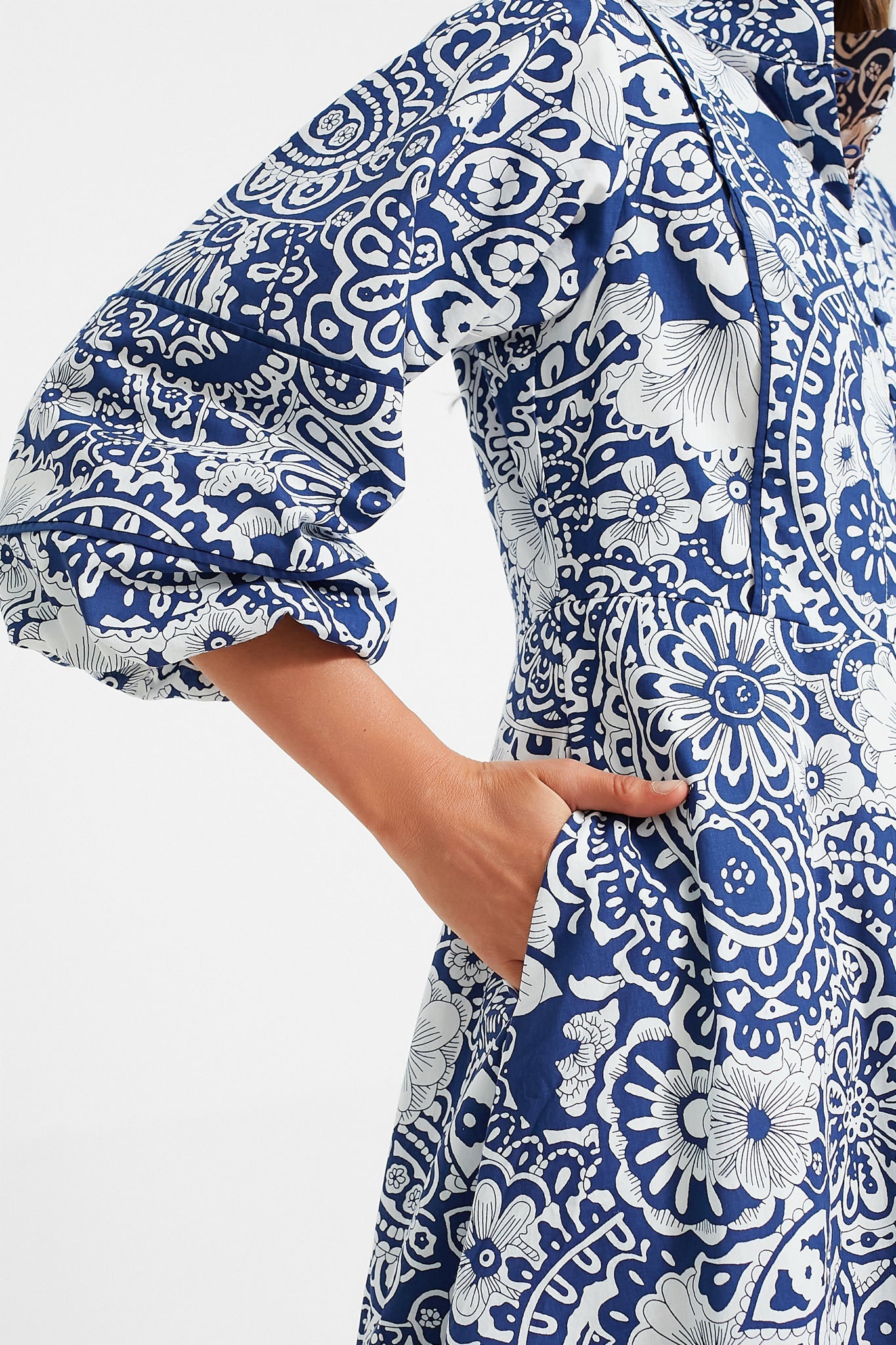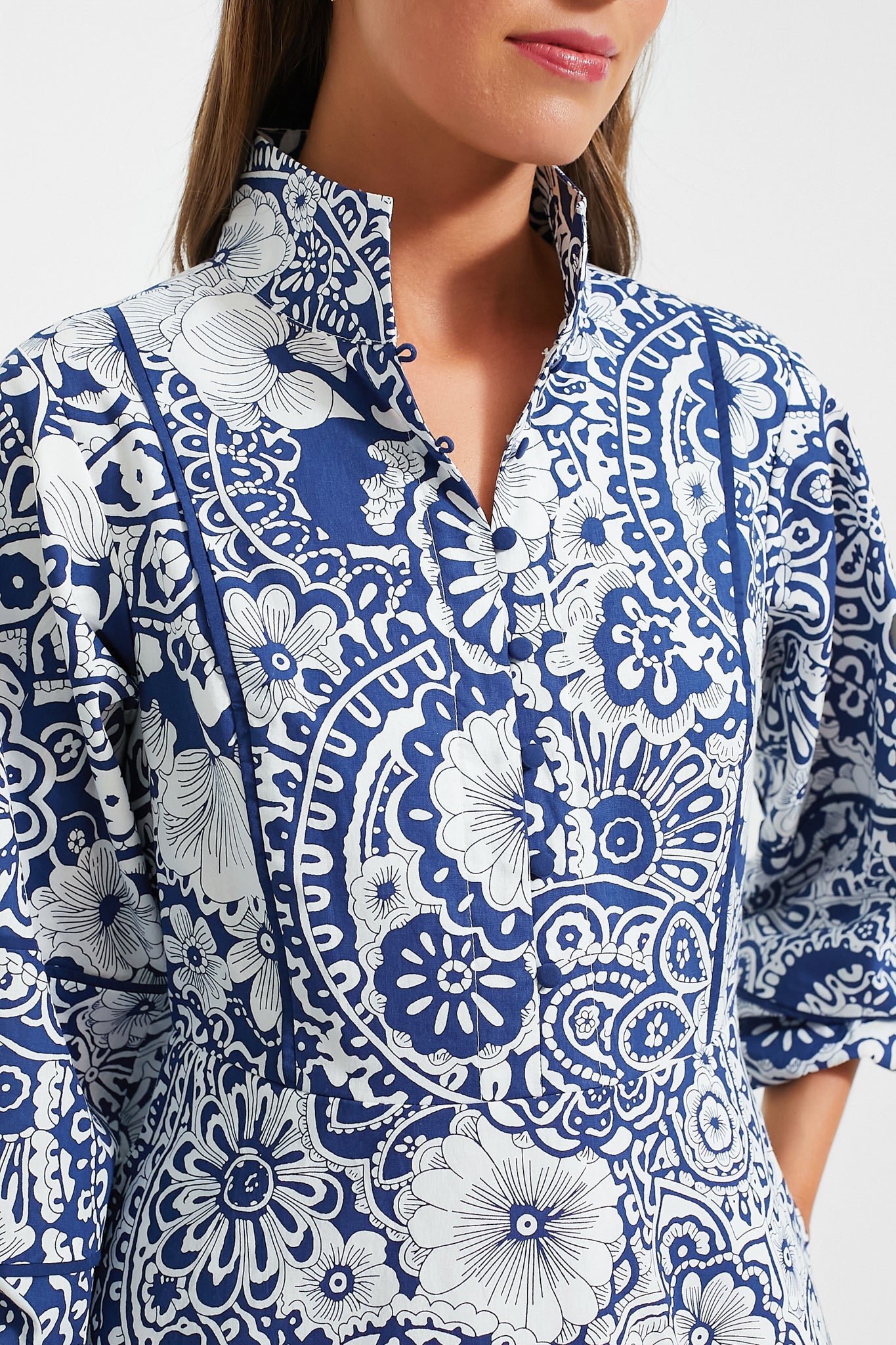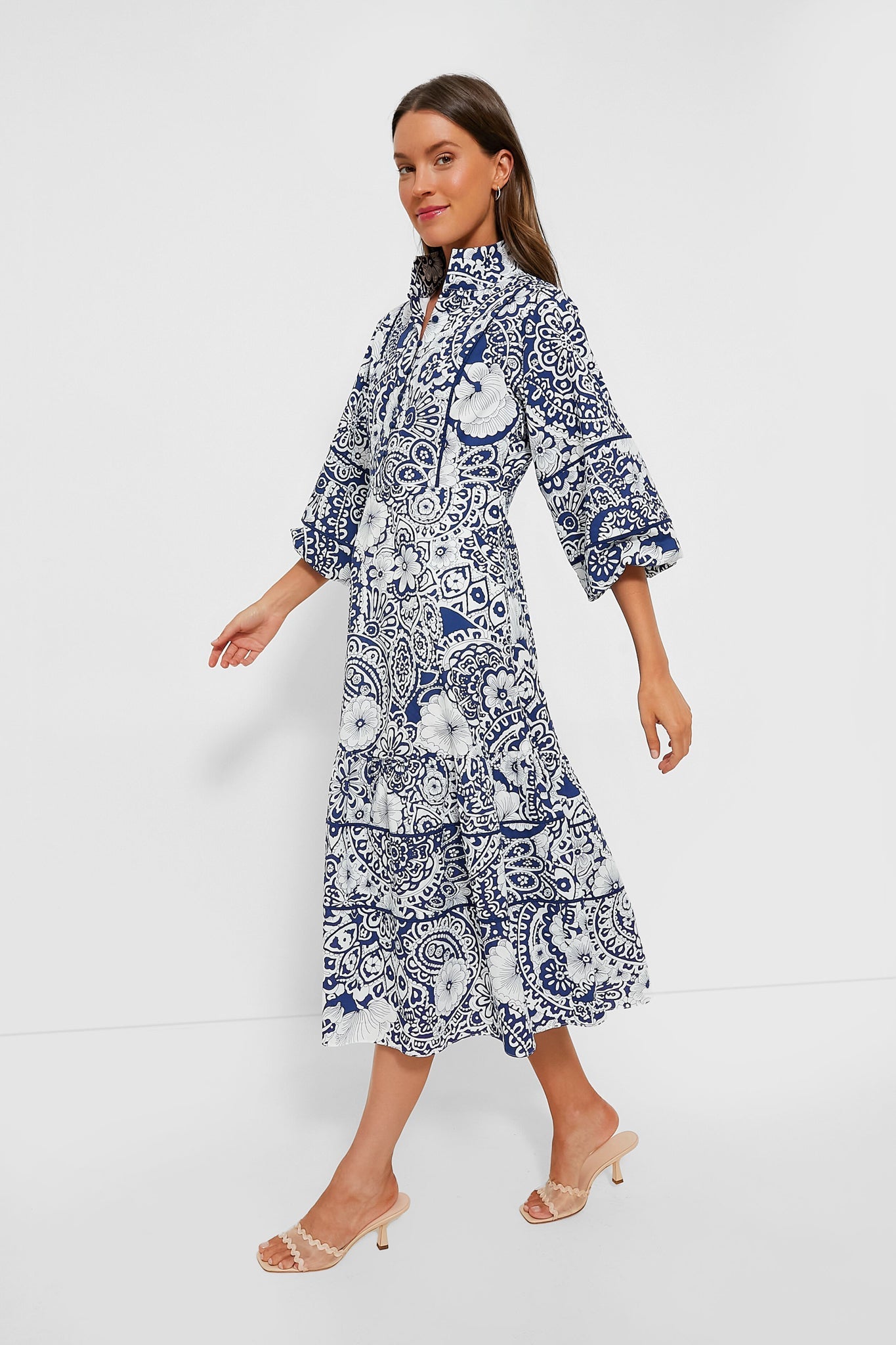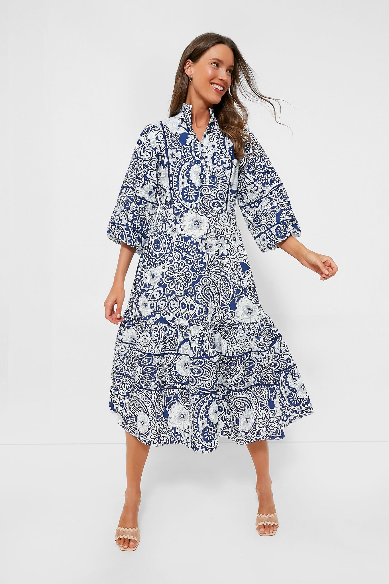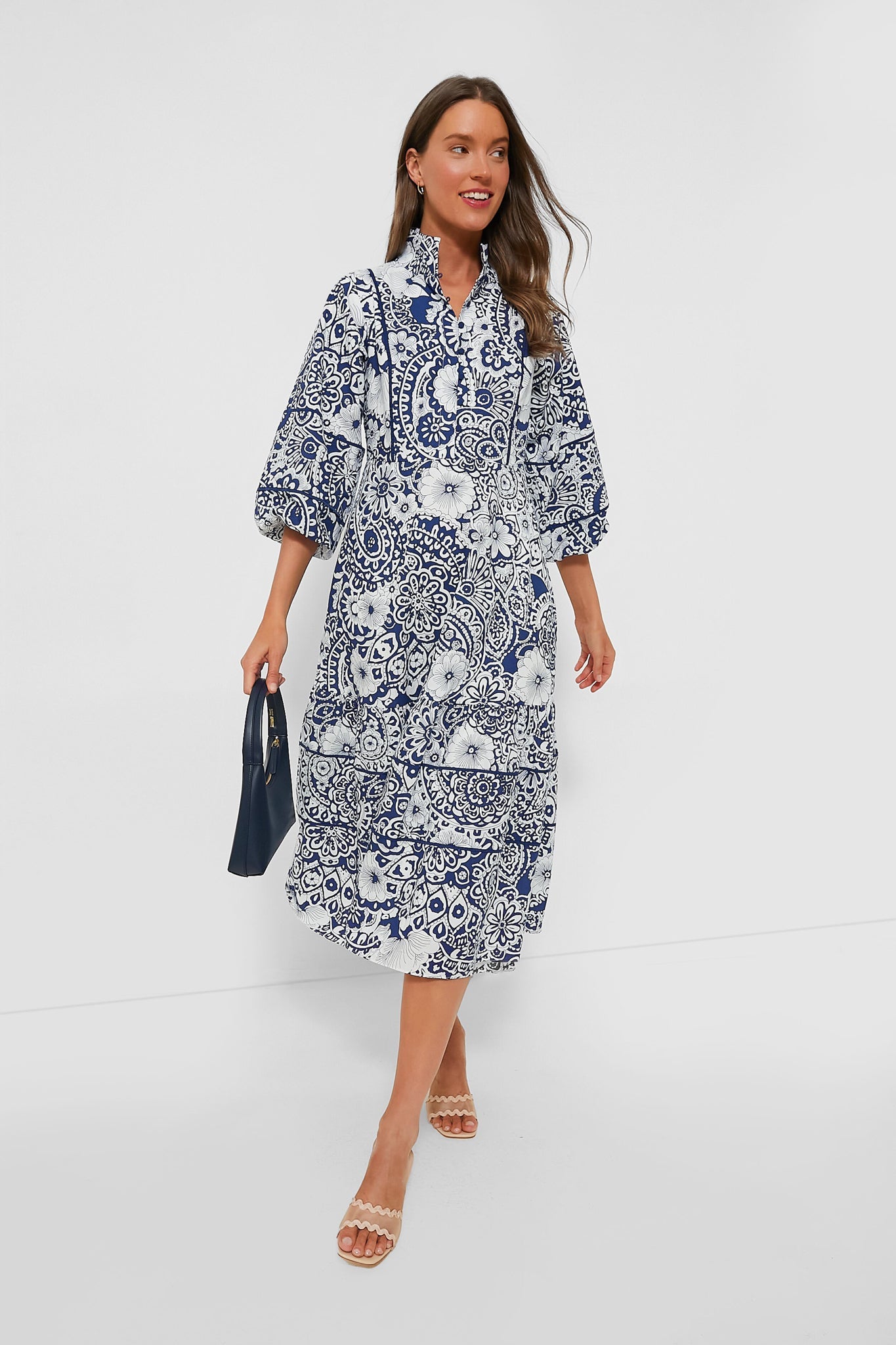 The Navy and White Floral Hillsborough Dress is perfect for warm, breezy days lounging by the beach or going to lunch with friends. This midi boasts three-quarter length puff sleeves, a fit and flare silhouette, and a tiered skirt with piping panels. The eye-catching design is the cherry on top, creating an enchanting swirl of patterns and shapes. Pair with heels and a clutch, or simple sandals and gold jewelry.