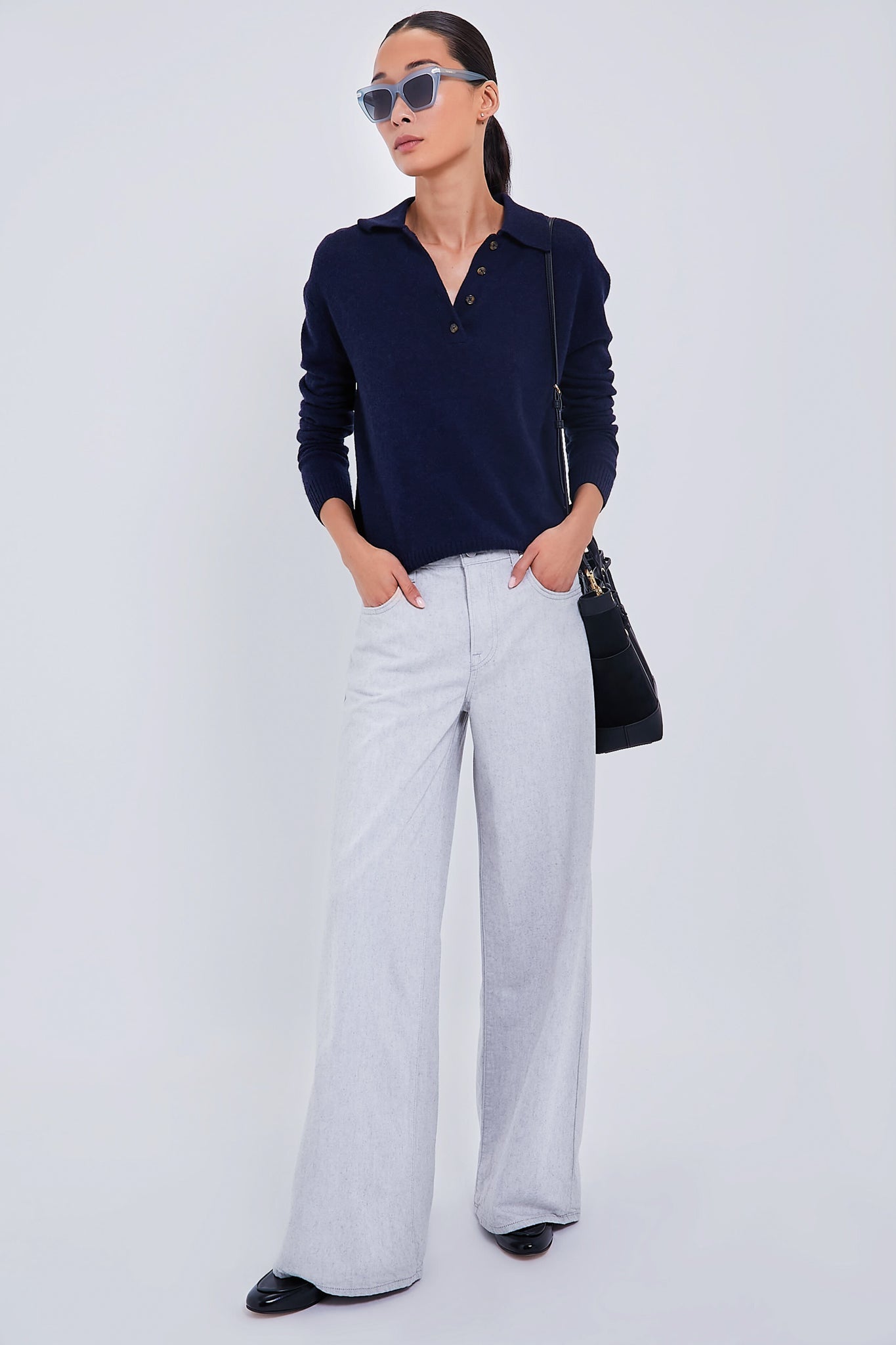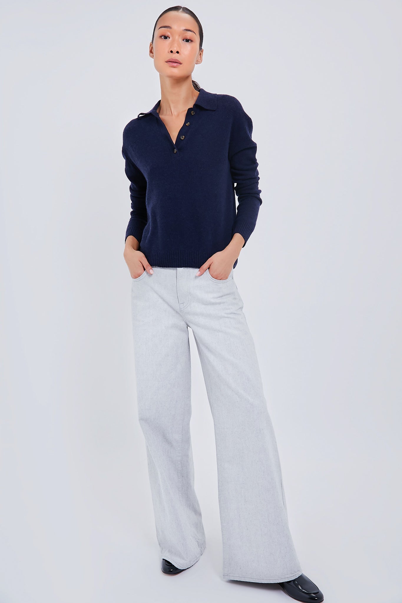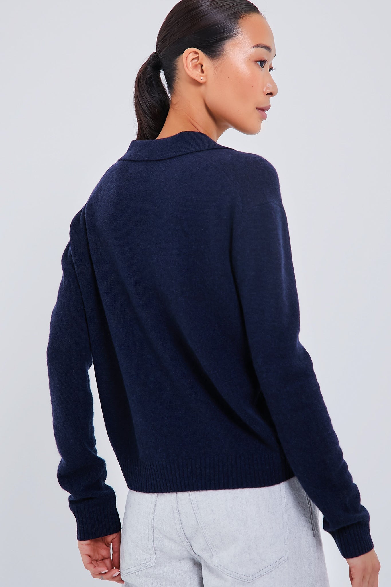 Beautifully crafted from lux cashmere, the Navy Cashmere Cassidy Polo Sweater is made for ultimate style and comfort. An essential for your wardrobe, this clean yet chic top features on-trend notched collar neckline, ribbed cuffs and hem, and a relaxed fit. We are styling this silhouette with denim, trousers, skirts — it's perfect for slow weekend getaways, chilly afternoon strolls, lunch dates, and more.