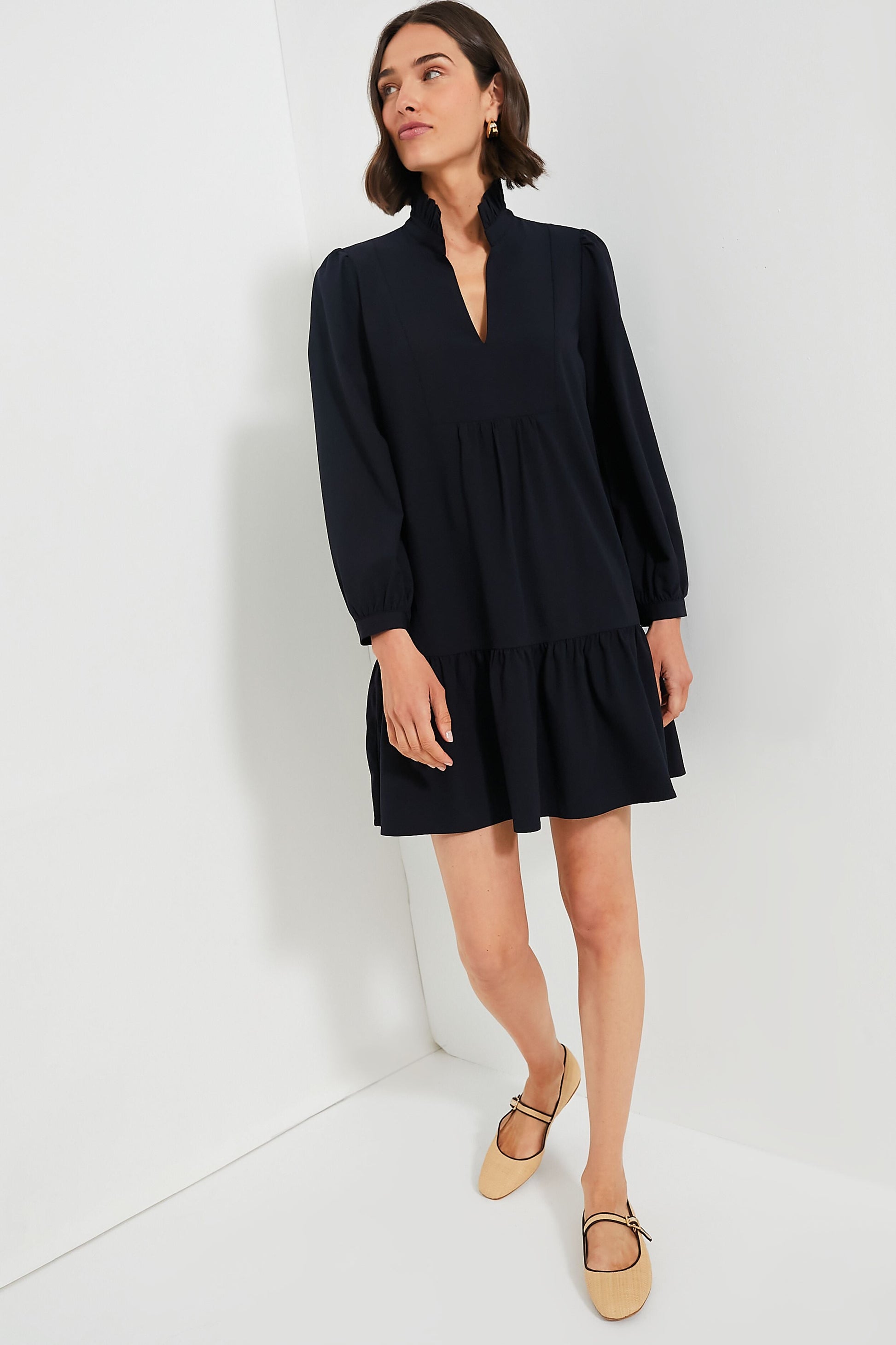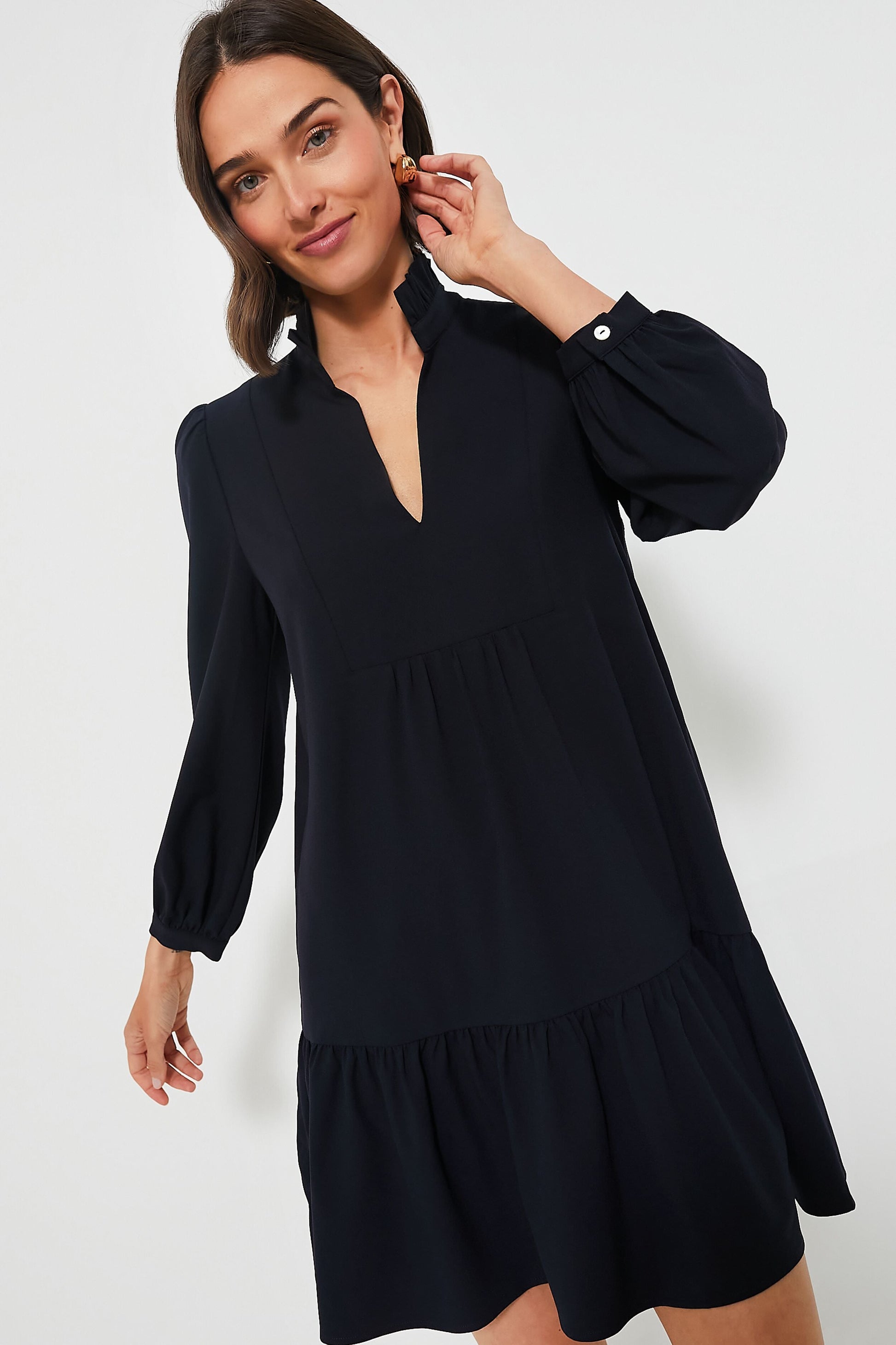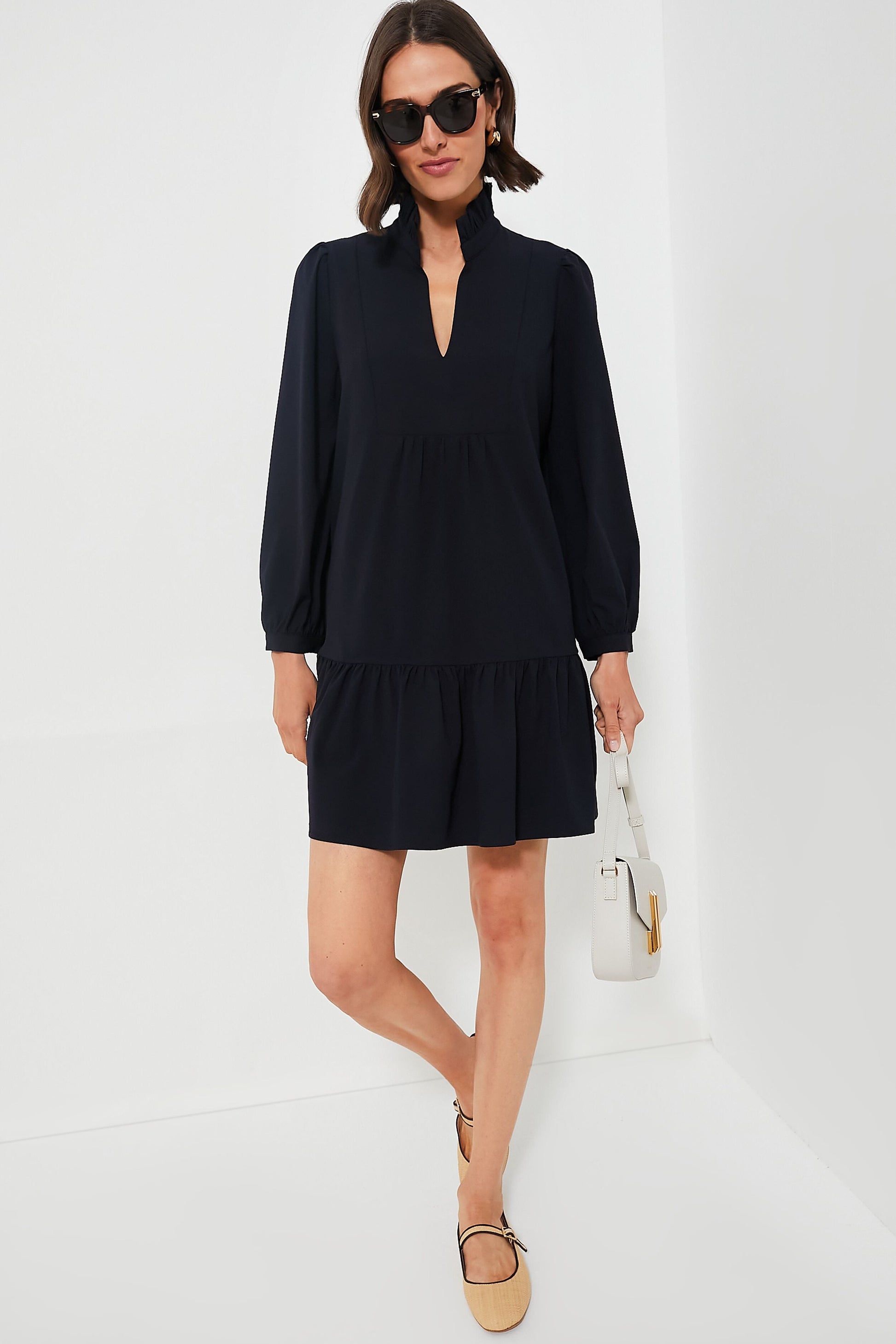 A modern silhouette with a feminine feel, the Navy Palmerston Dress is really all that. A ruffled collar and long sleeves play for a sophisticated feel while the beautiful crepe fabric makes us want to twirl all night long. Book dinner at that new restaurant you’ve been wanting to try and add gold heels to this classic with a twist mini for date night and dancing afterwards.