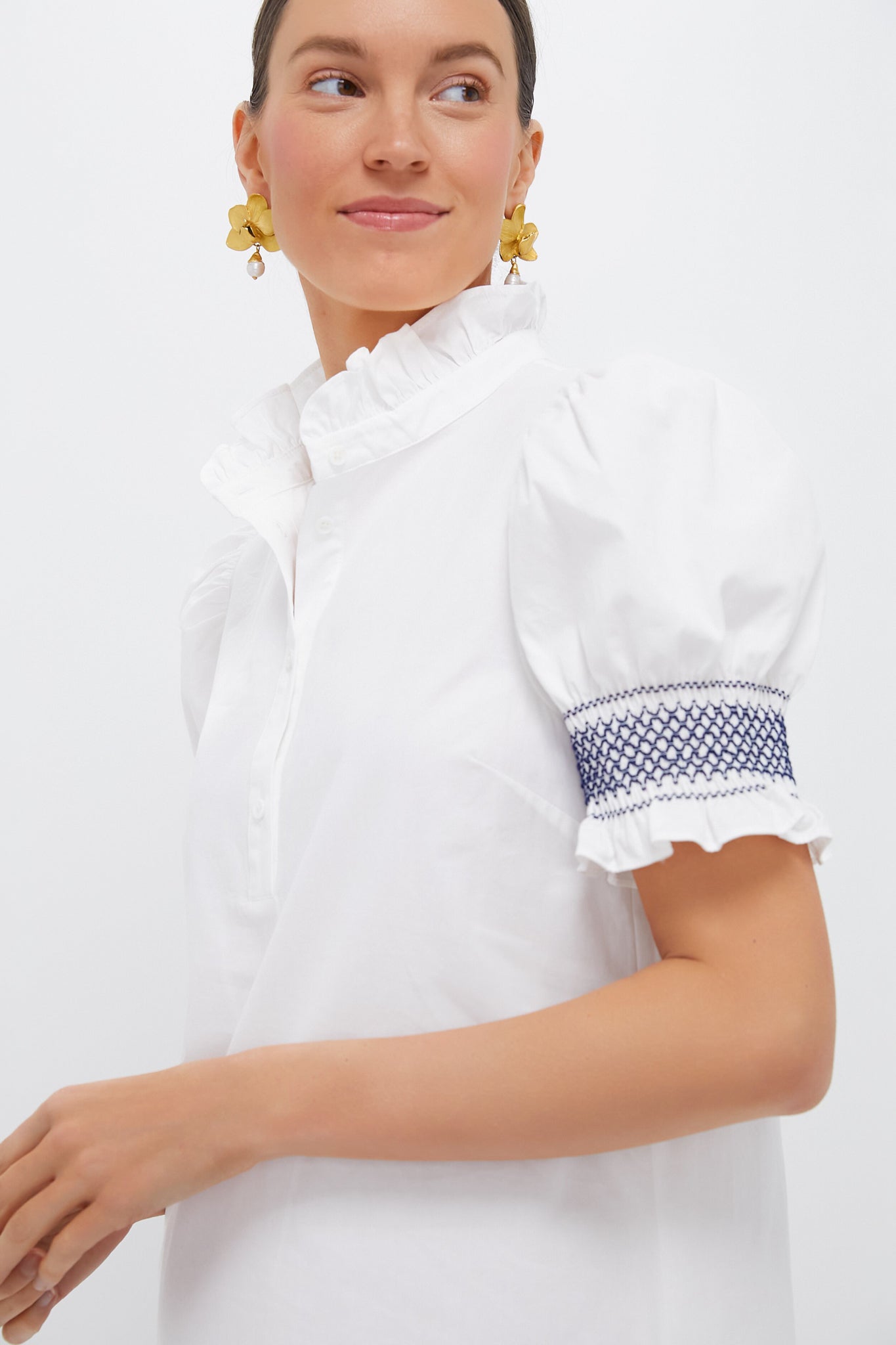 A chic, sophisticated style, we are loving the Navy Embroidery Eliza Midi Dress. Boasting a stand ruffle collar, short puff sleeves with an elastic smocked cuff, and intricate embroidery along the hem, this midi is easy yet elevated. Pair with white sneakers for running around town, or with sandals for a brunch date.