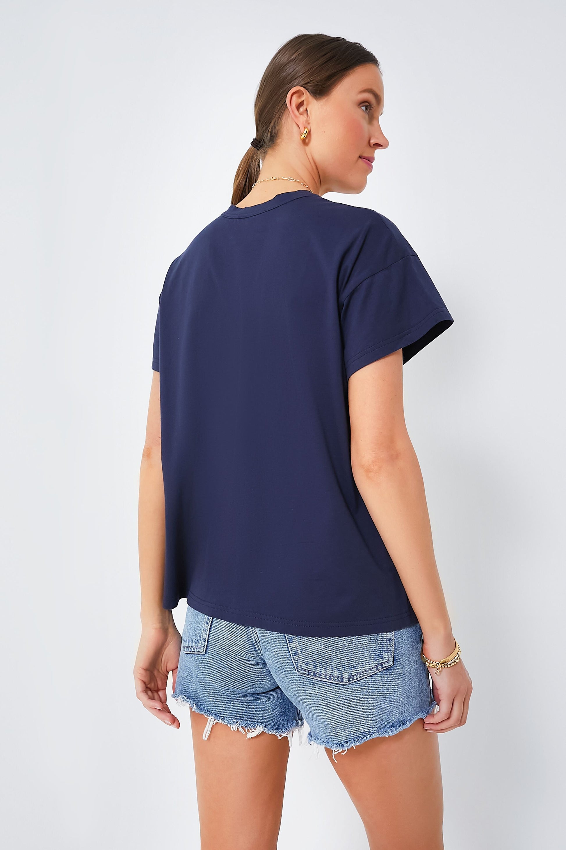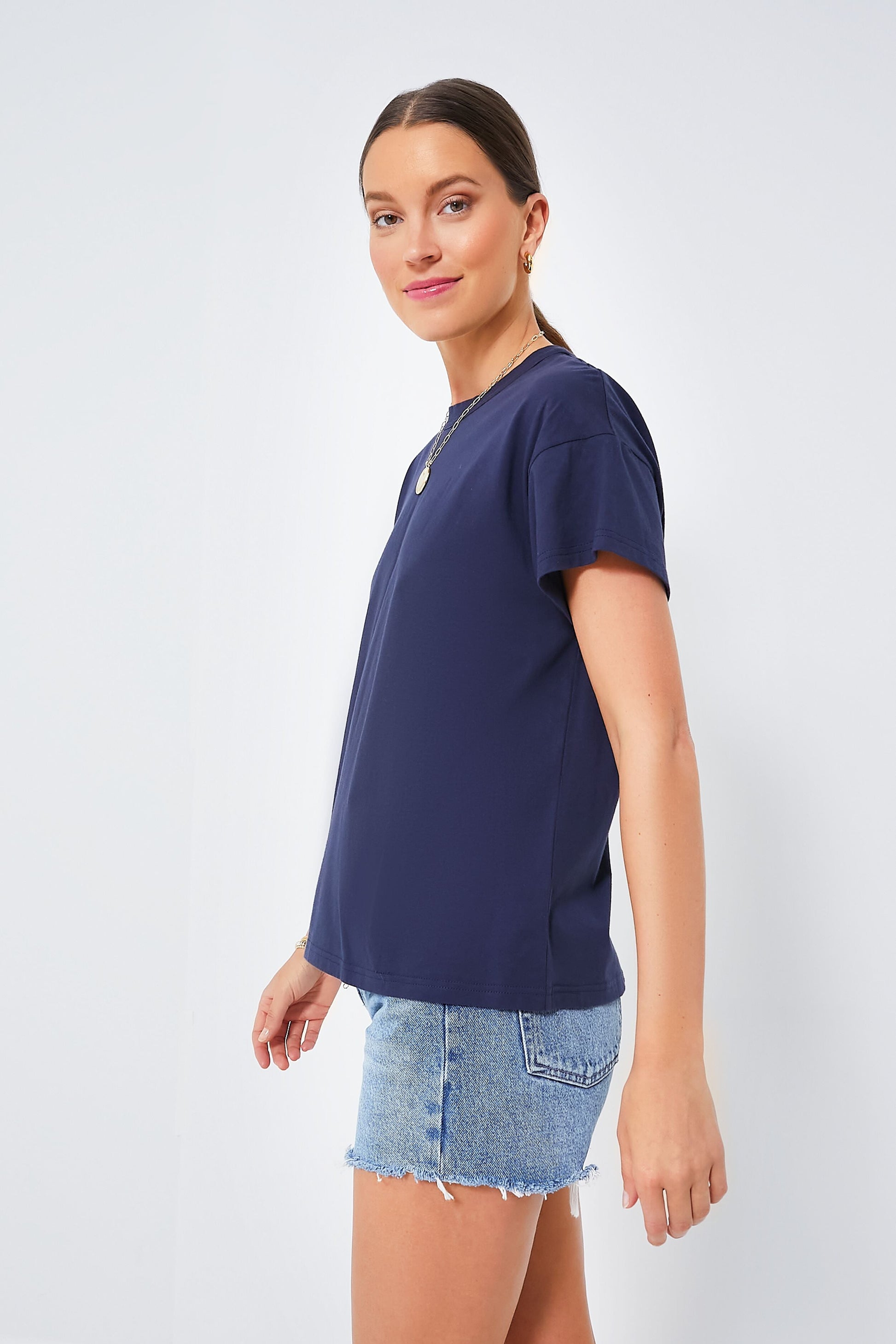 In search of a traditional tee that stands the test of time? Look no further than the Julia. Featuring a crewneck, short wide sleeves, and a relaxed fit that can be tucked in or out to achieve any look, this navy top is for those days when you just don't know what to wear. Throw on a pair of denim, a mini skirt, linen trousers– you name it– the possibilities are endless for this classic wear everywhere number.