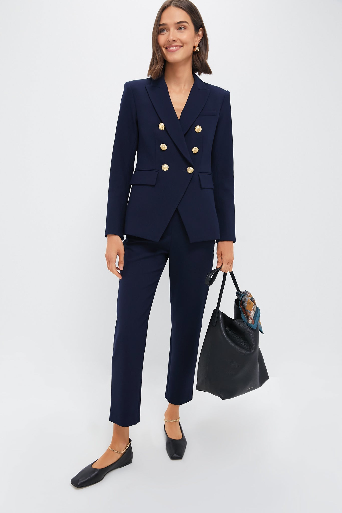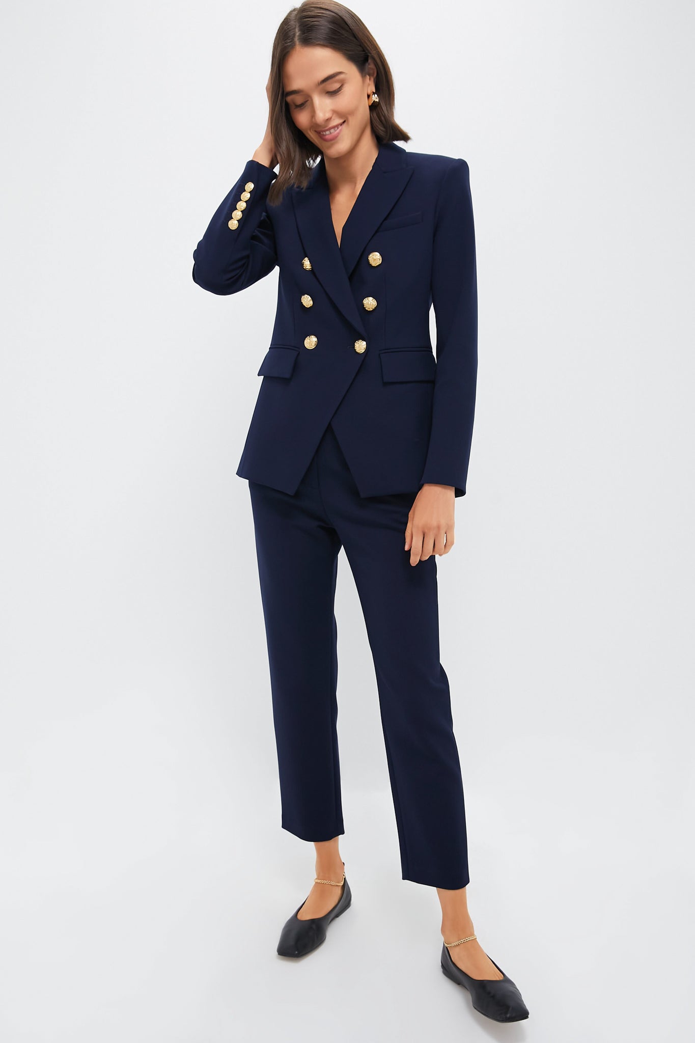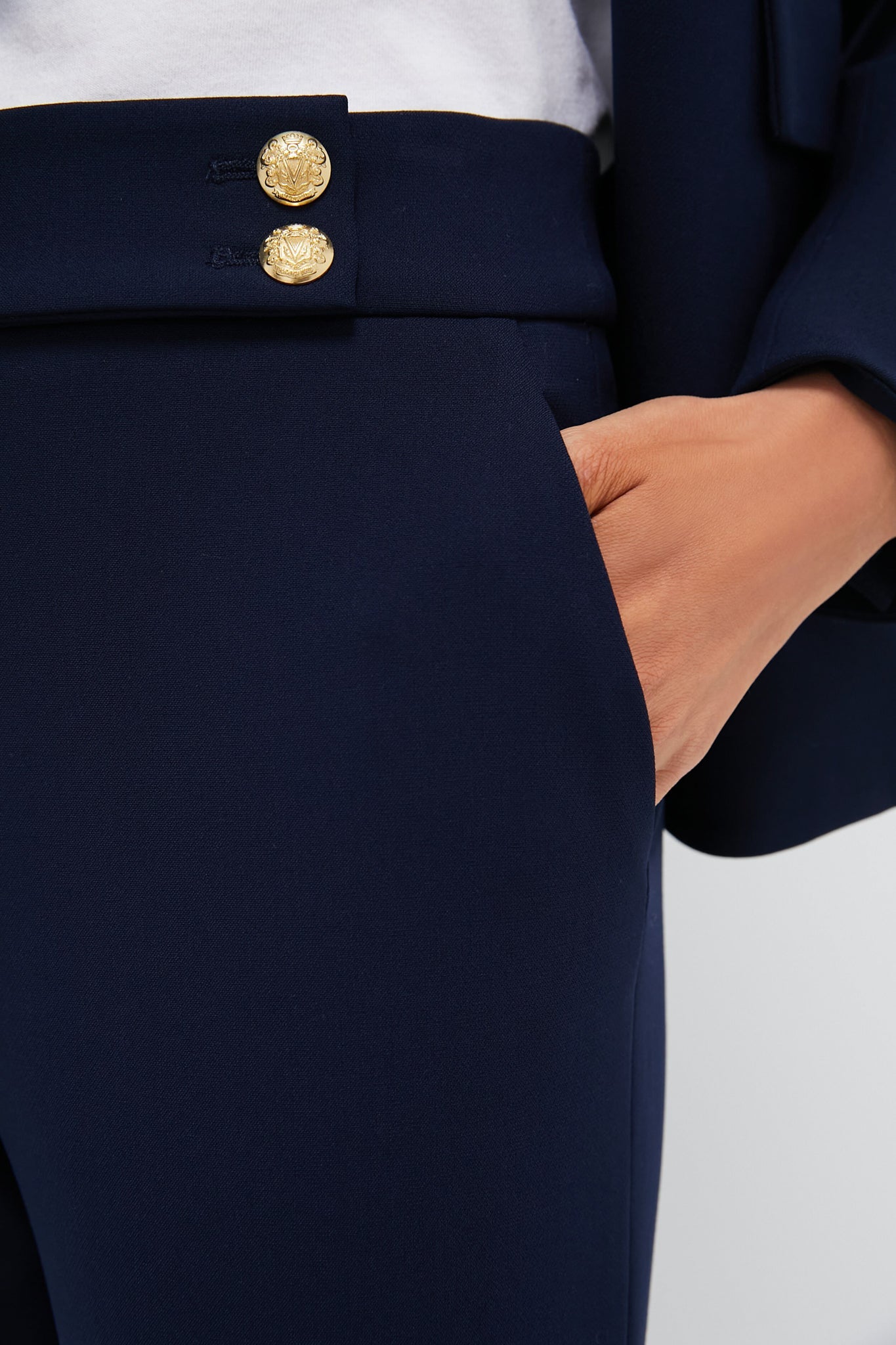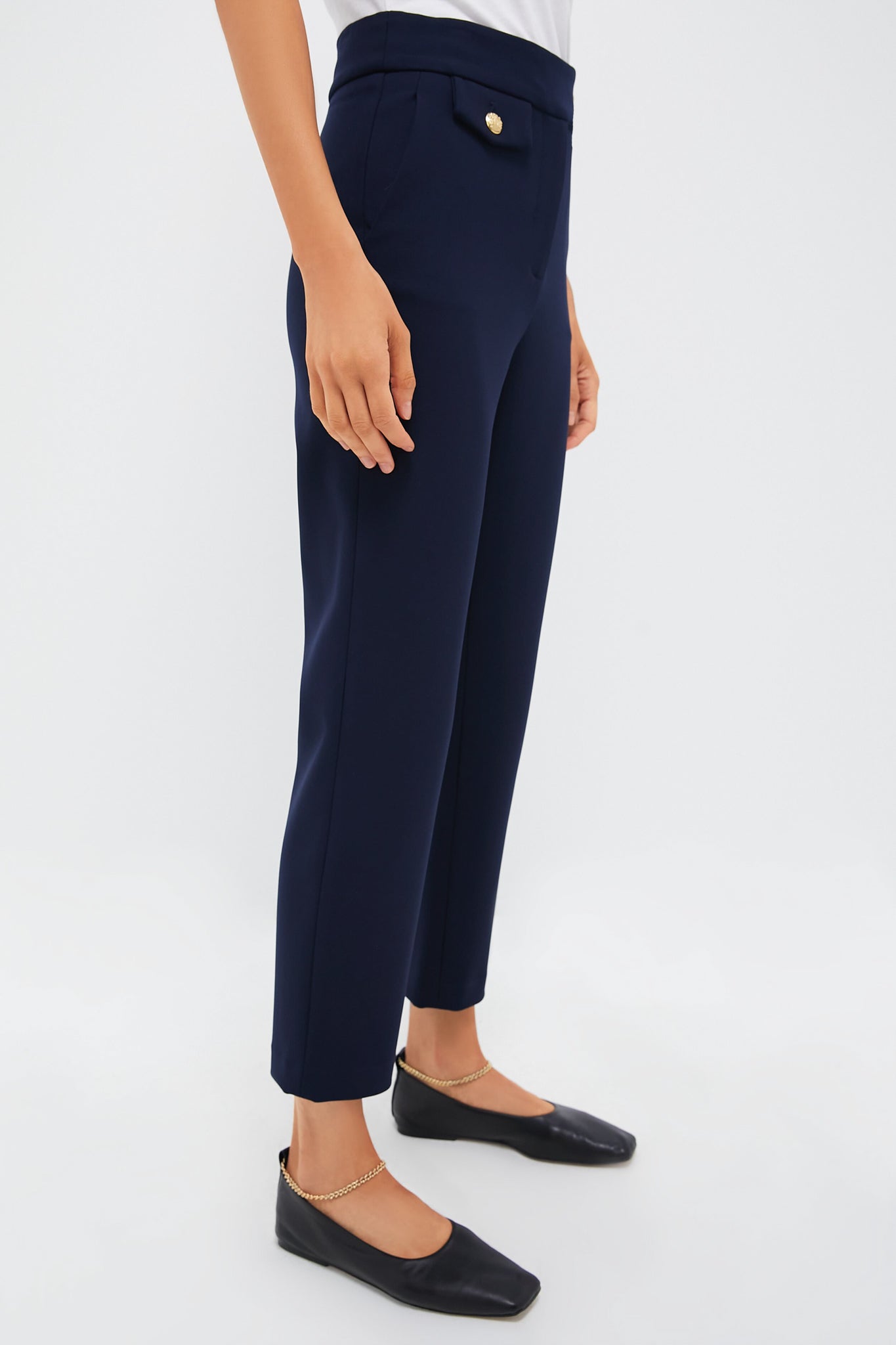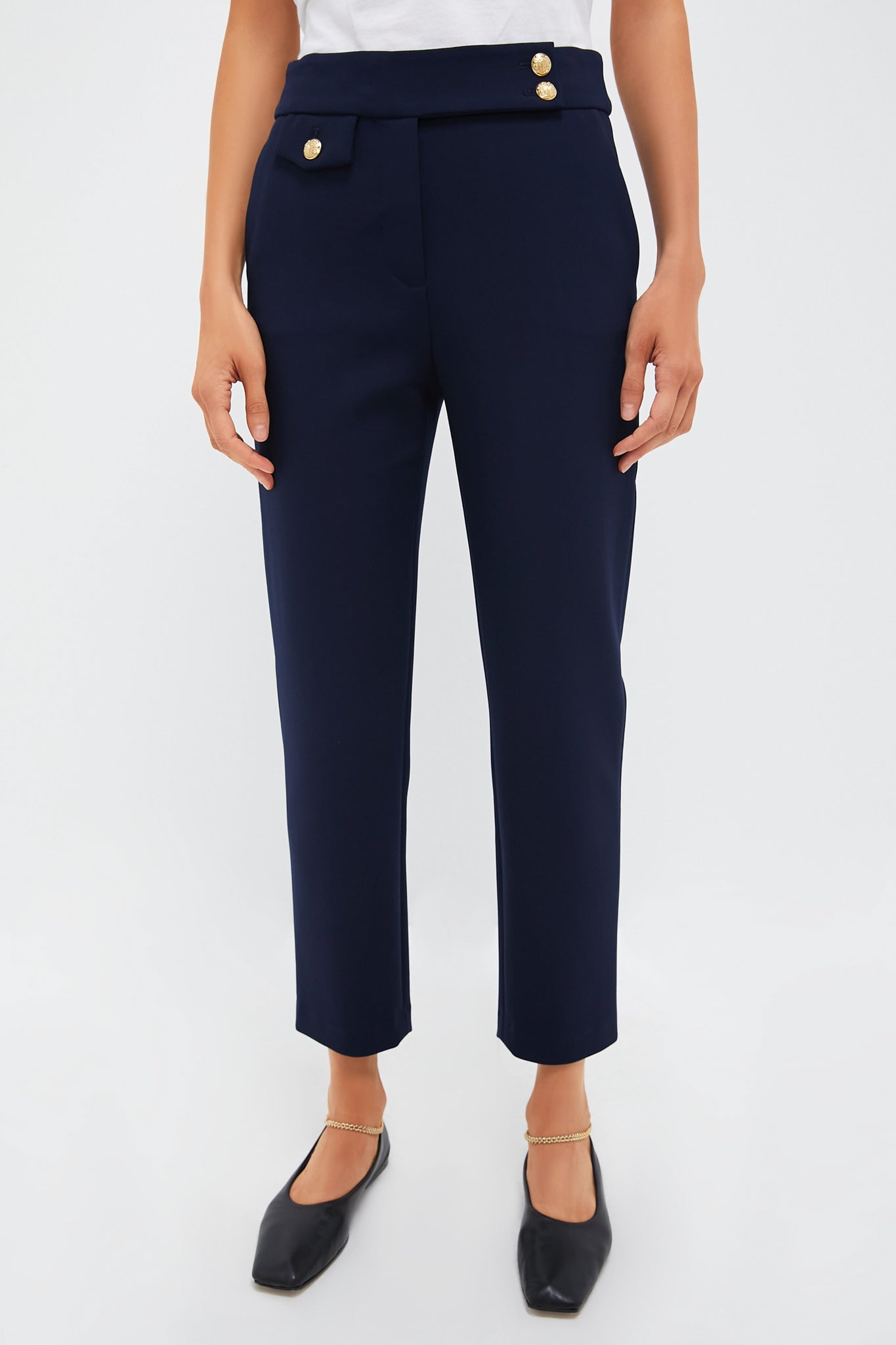 A slim leg and streamlined silhouette make the Navy Renzo Pants our go-to pair for the office. Adorned with stunning gold buttons, these bottoms feature a flattering mid rise, a zip fly with dual button closures, and back slit pockets. Style with a feminine blouse and statement heels for a chic look that never goes out of style, or pair it with a blazer or lady jacket to up the ante.