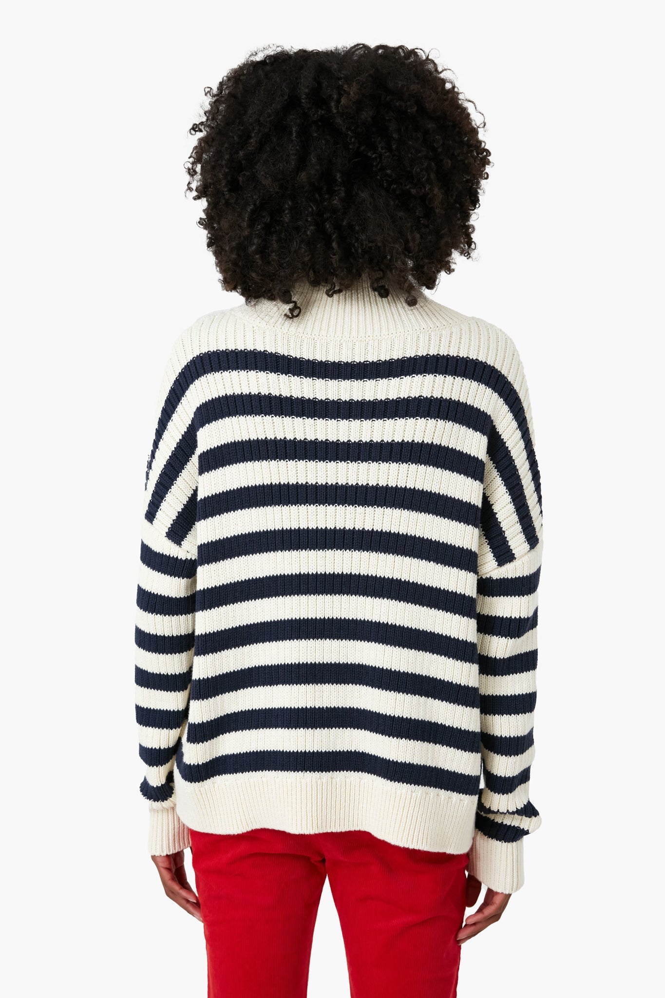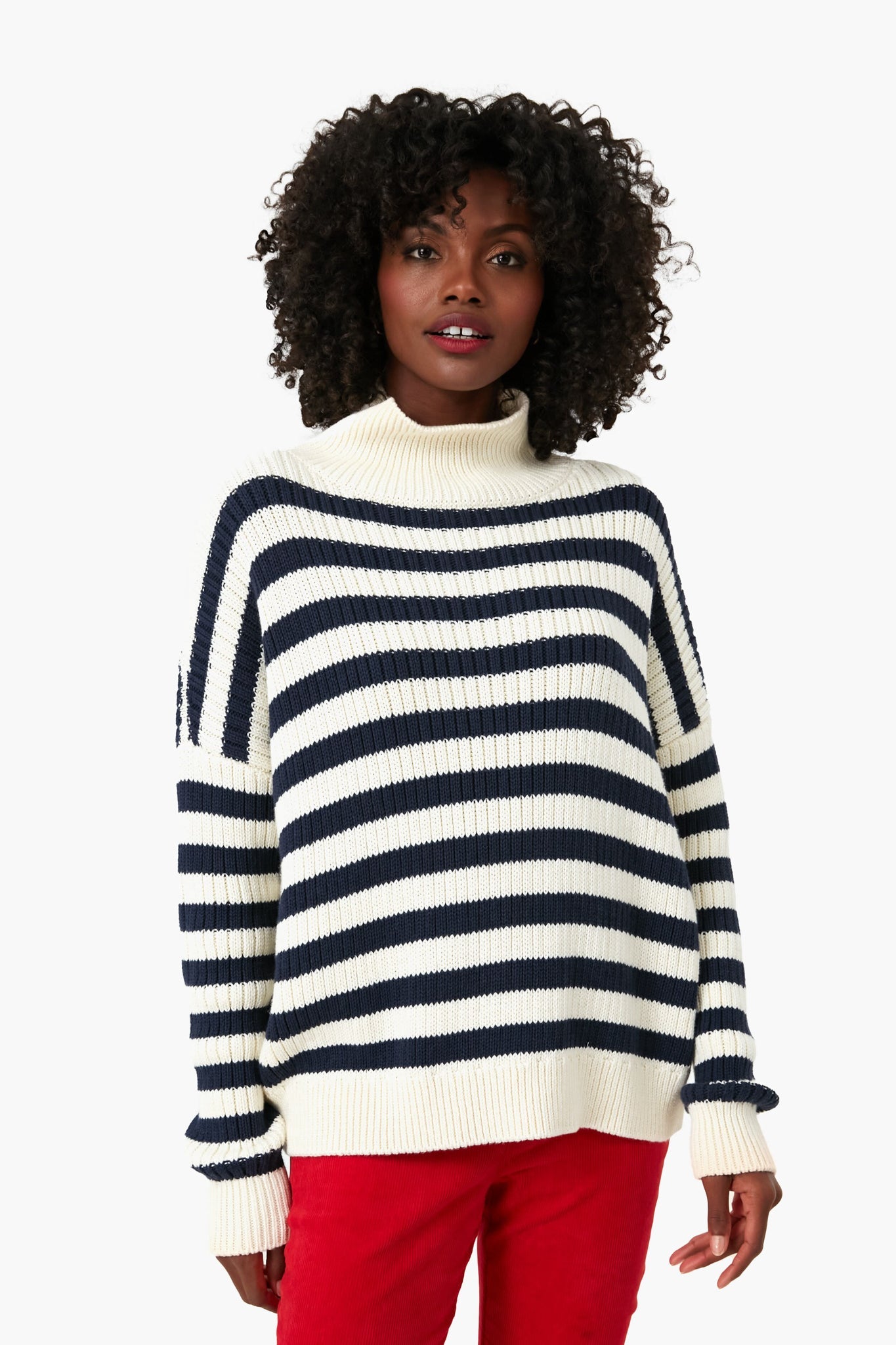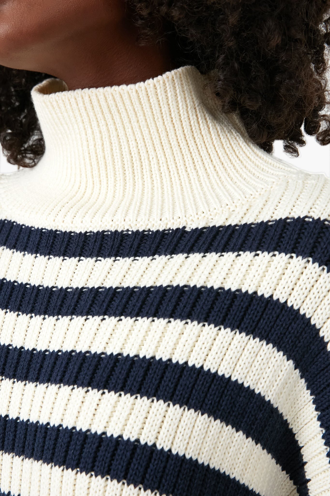 The Navy Stripe Carolyn Funnel Neck Sweater is the timeless turtleneck that you need to get you through the cold weather ahead. With a cozy ribbed knit texture, an organic cotton fabrication, and a contrasting navy and ivory stripe pattern that looks great styled a number of ways, this sweater is truly a no-brainer. Wear this with denim, over a dress, with a mini skirt, with boots, with sneakers, under a wool coat or a puffer jacket…you get the point, it goes with anything.
