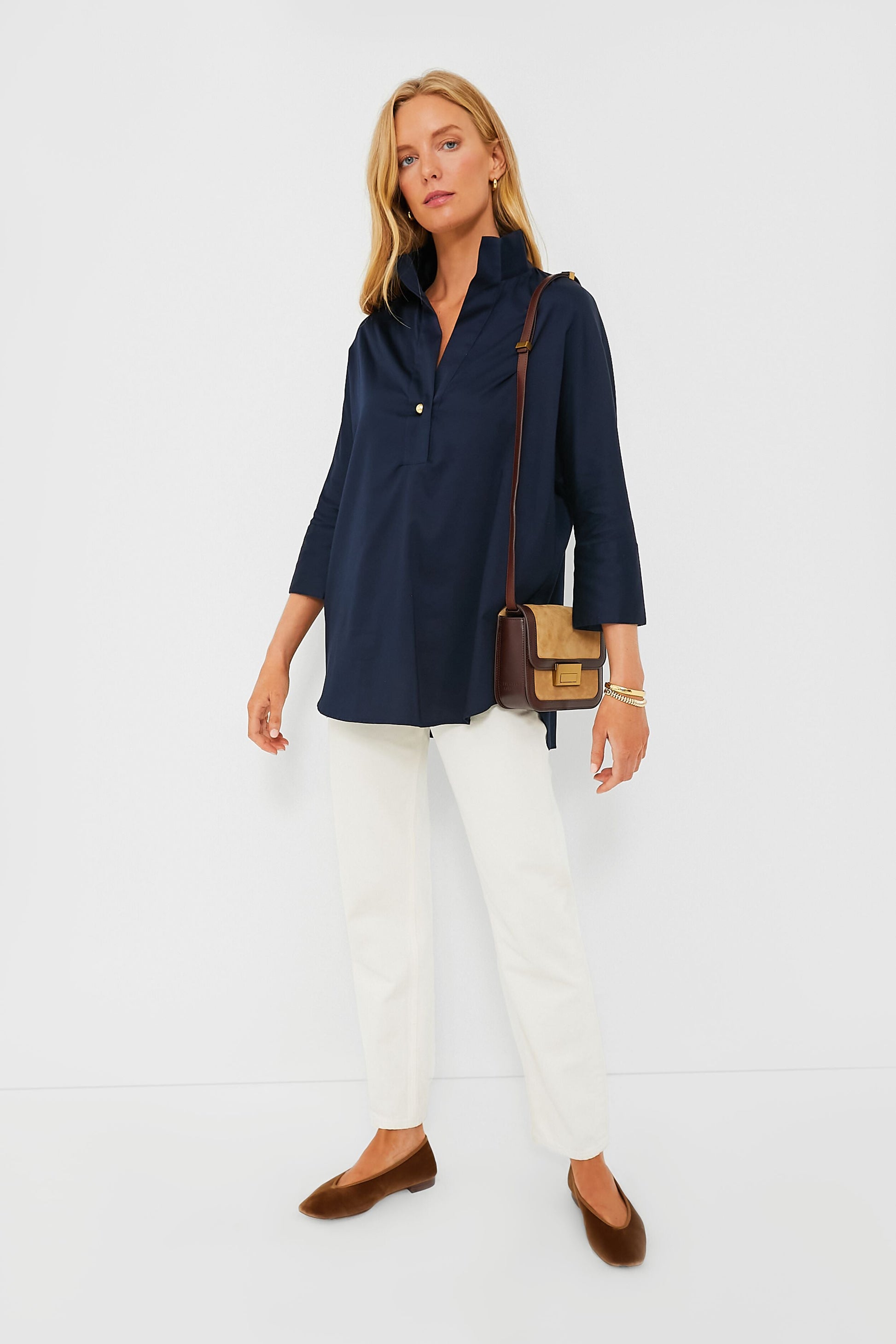 Crafted in a flattering silhouette from a crisp cotton poplin, the Navy Willow Blouse is a must-have. Featuring a front half-placket, stand collar, and high-low hem, this pullover pairs easily with everything from denim to leather all year long.