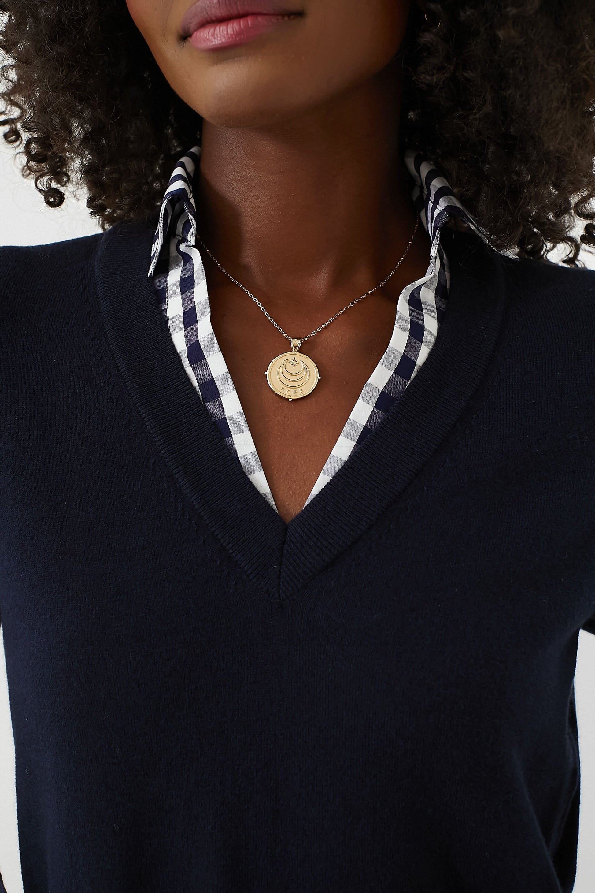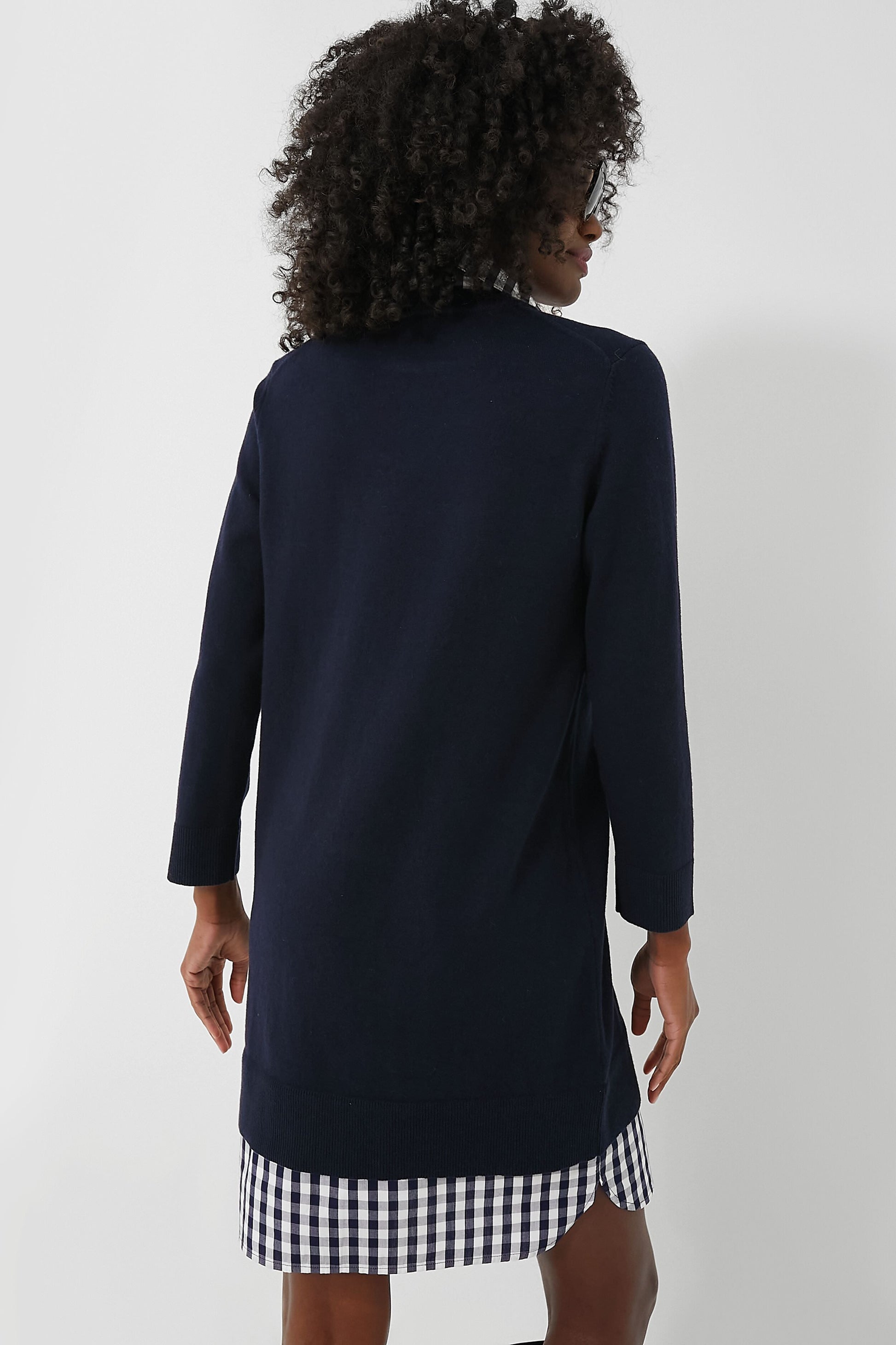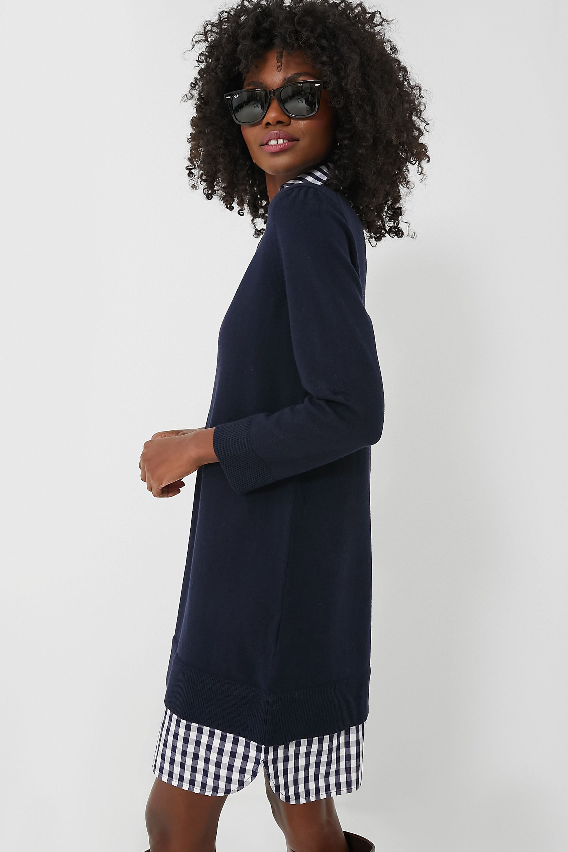 A perfect two in one! The Navy Wool and Cotton Combo Sweaterdress is the perfect fall piece. With a classic checked shirting underlayer and a super-soft merino wool sweater on top, this style is effortlessly chic. Throw this on with flats or leather boots for a cute and casual look, or with slippers for a cozy work from home outfit!
