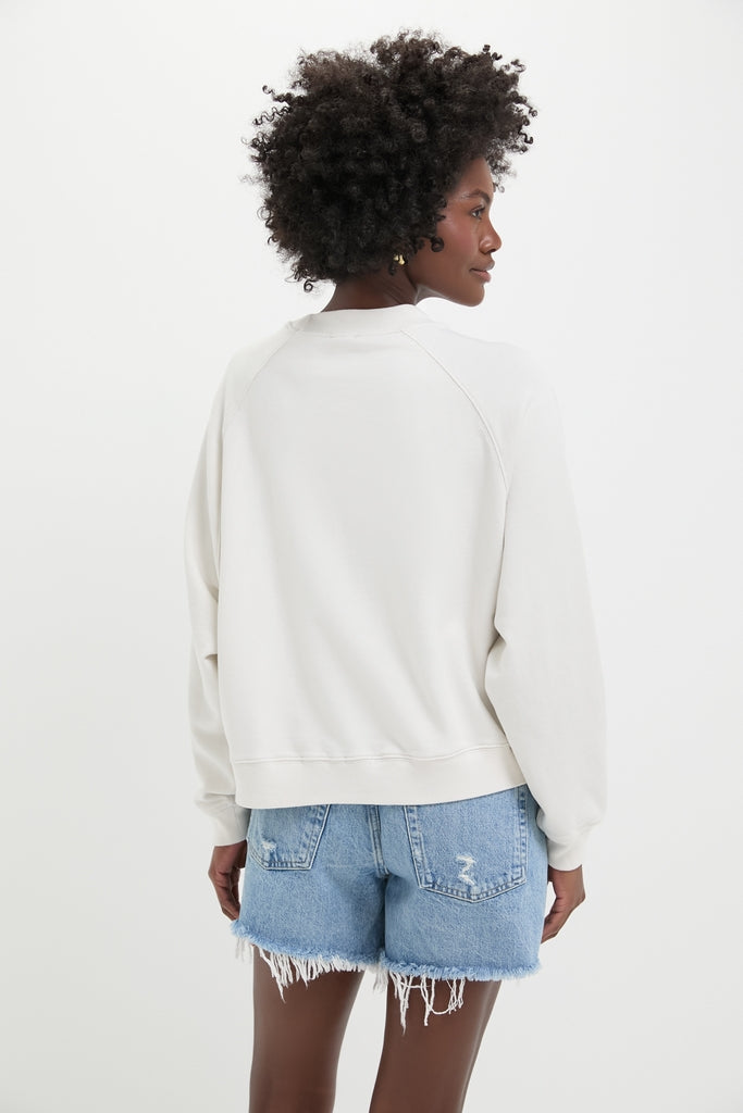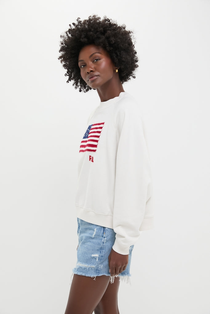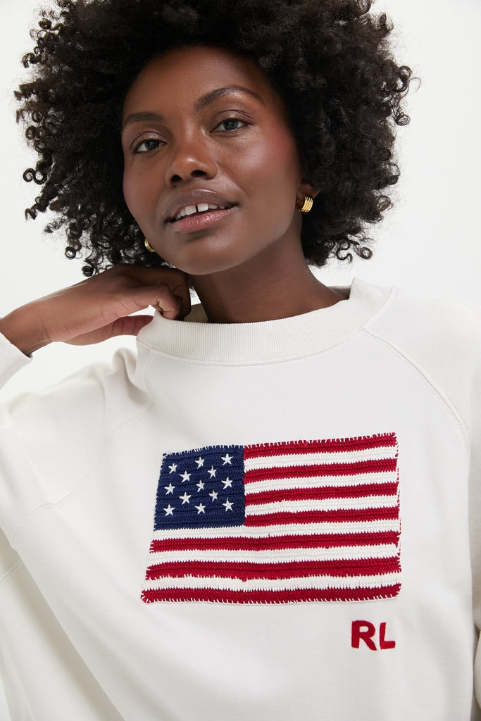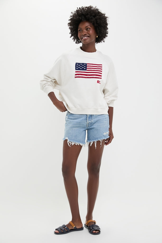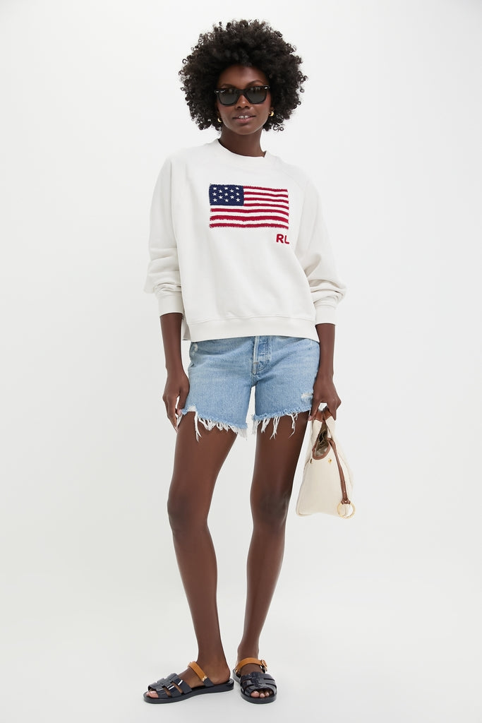 The Nevis American Flag Long Sleeve Sweatshirt is a cotton terry crewneck featuring a crocheted appliqué version of a historical American flag with whipstitching. This classic style can be worn year round, but is perfect for those nights that need an extra layer. We paired it with jean shorts and jelly sandals for a relaxed look, that has effortless style.