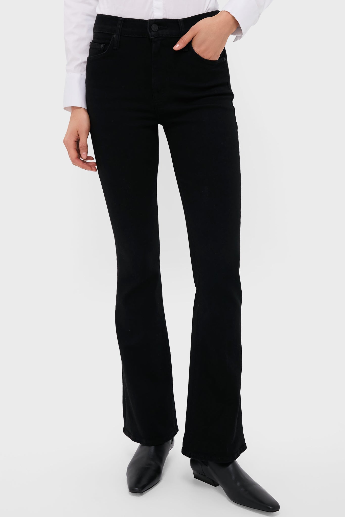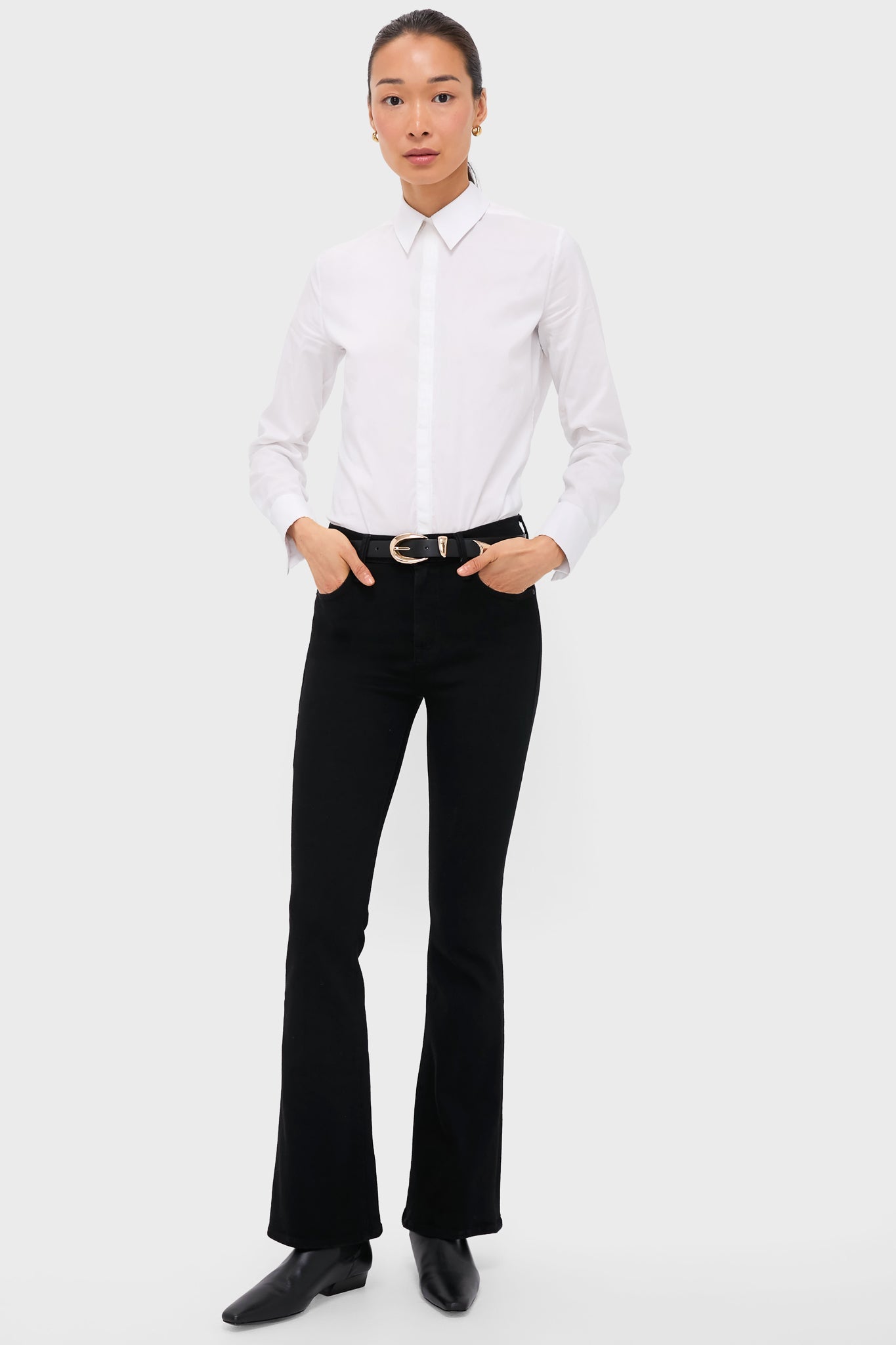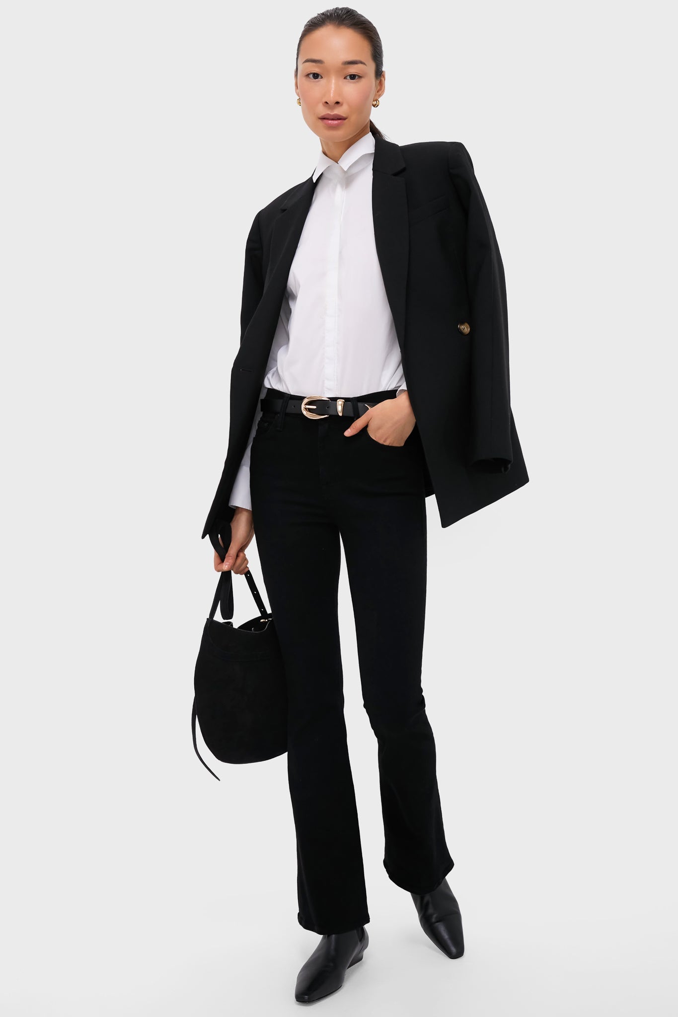 This cult-favorite flare jean has a mid rise, clean hem, and long inseam. Cut from denim with a touch of stretch, Nighty Night is a dark black with tonal hardware. Pair with a button down, blazer, and boots for elevated look.