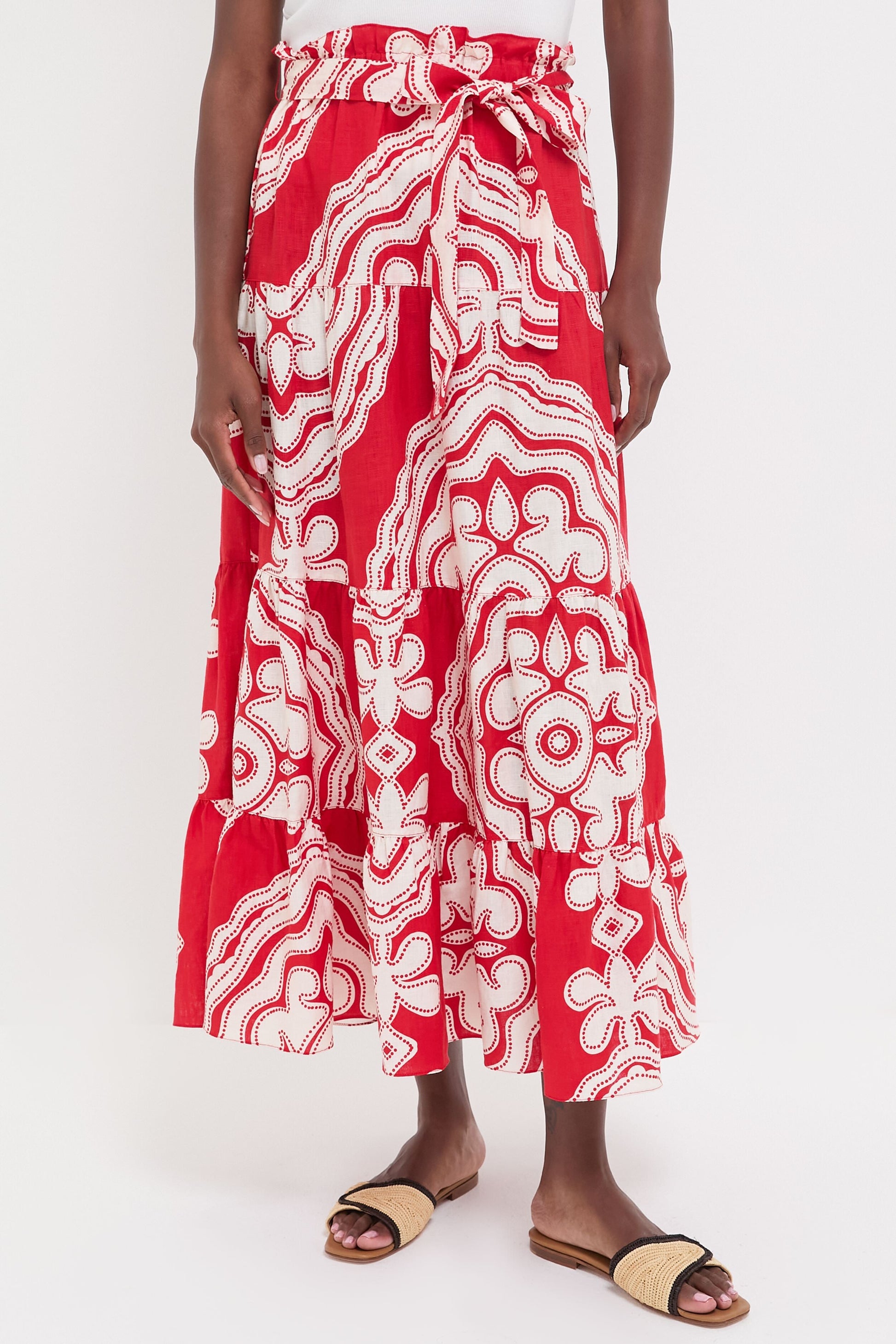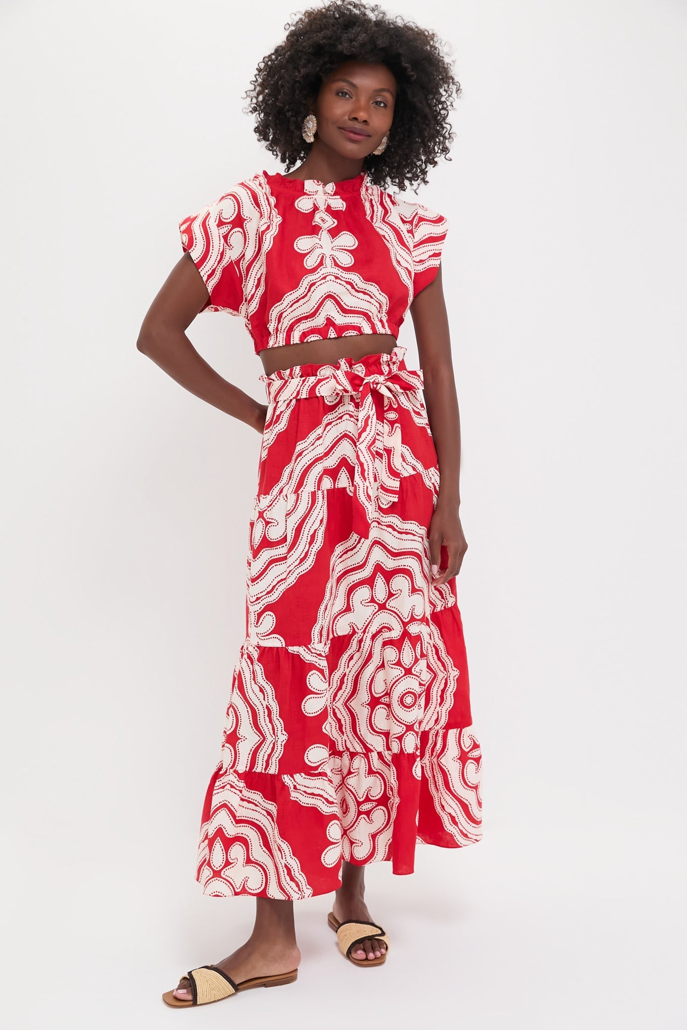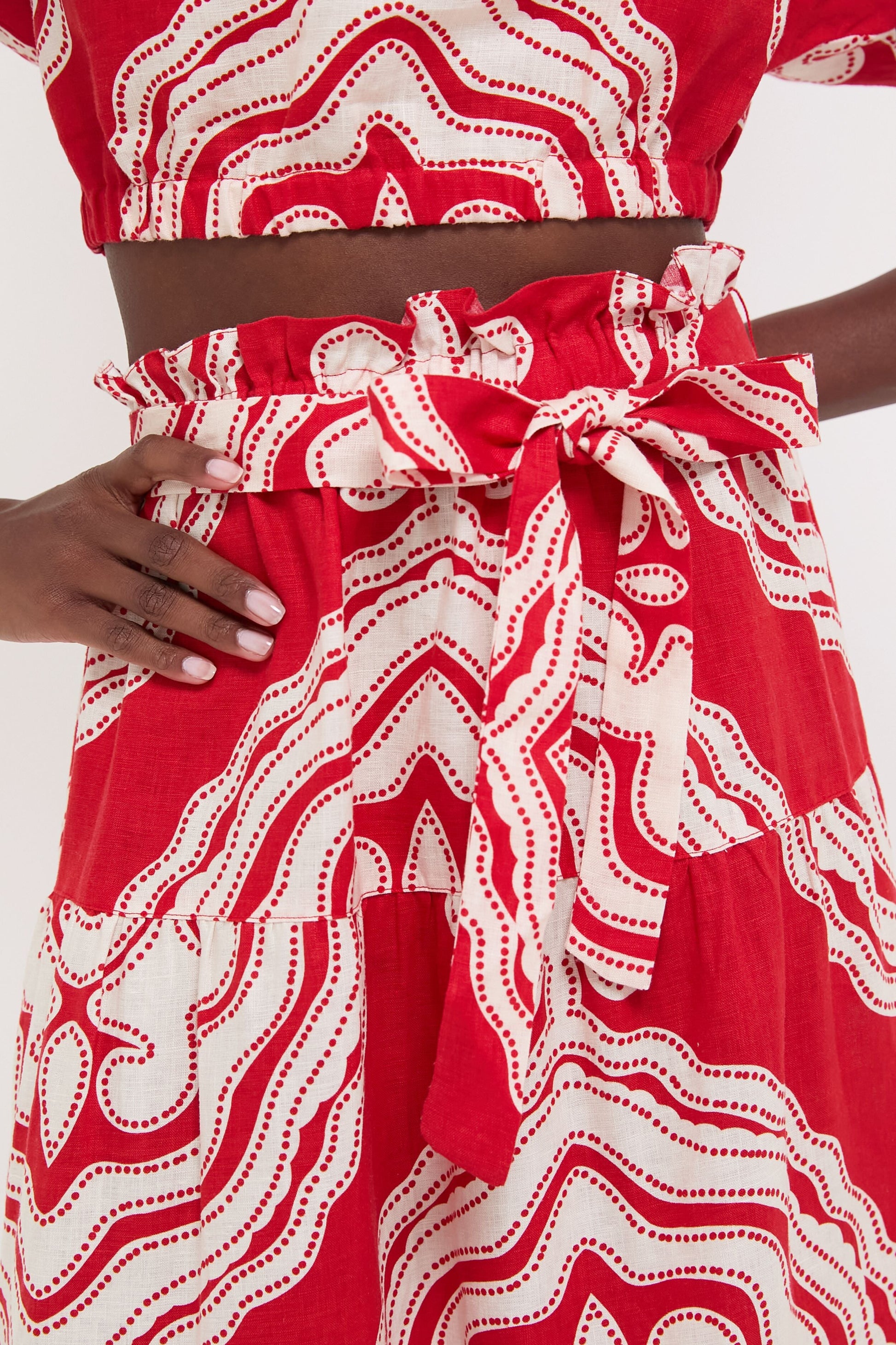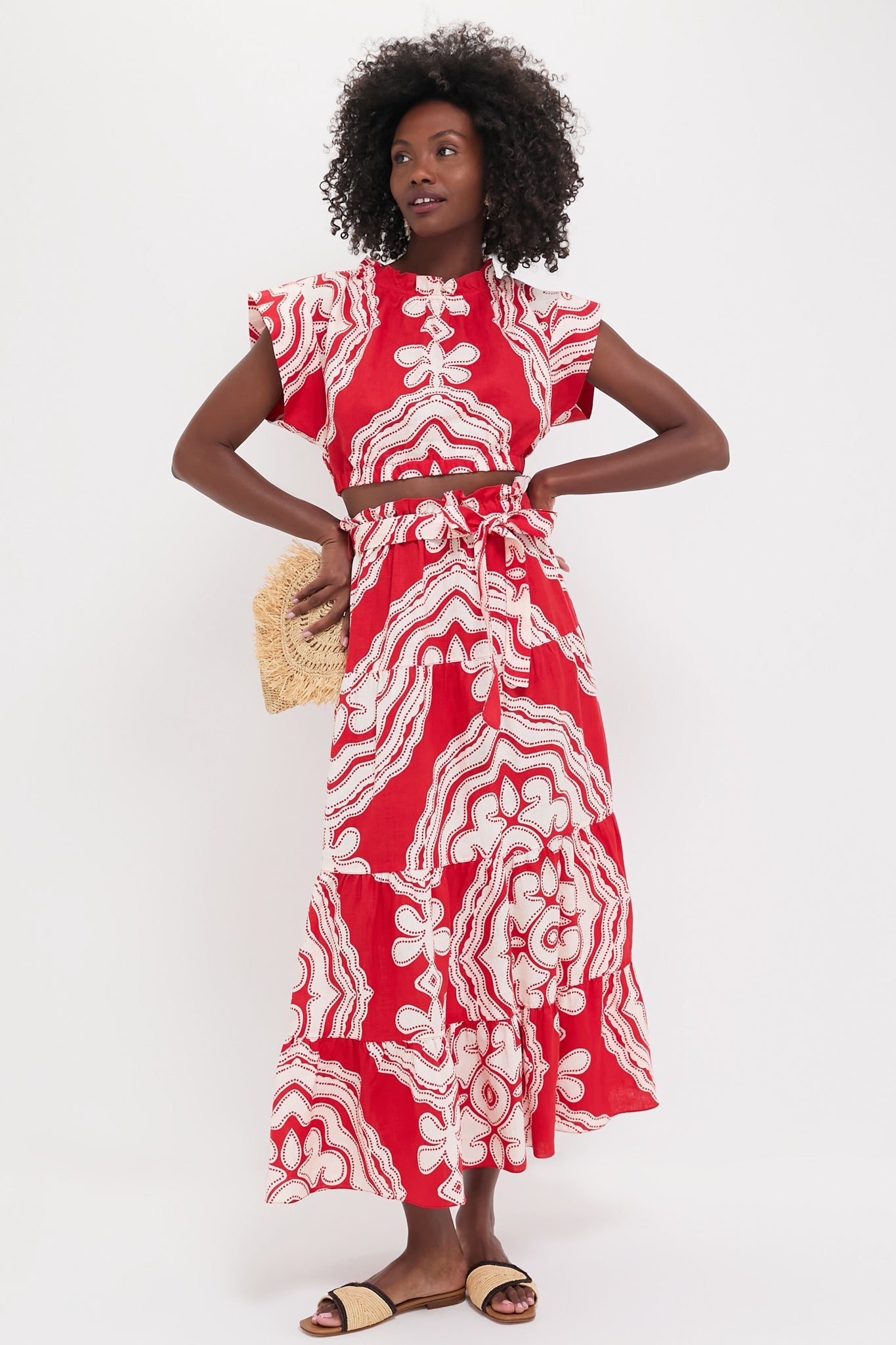 The Nike Red Sanaa Skirt features a custom-designed print inspired by ancient architectural patterns, blending the classic with the contemporary. With a midi length, flattering elastic waistline with a tie belt, and tiered detailing, we recommend pairing this style with the coordinating Niku Red Muna Crop Top, raffia sandals, and a clutch!