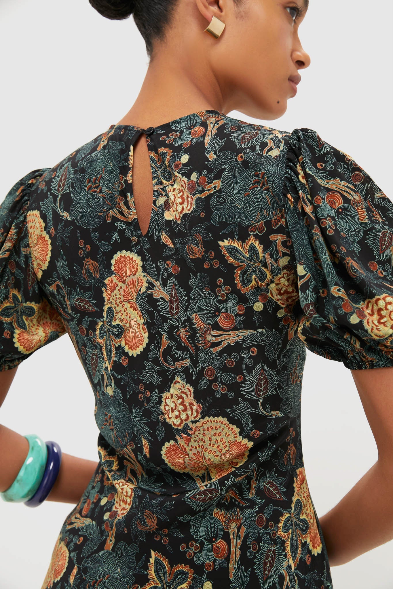 The Ines Dress is sculpted with gently puffed sleeves and has a timeless bias cut that flatters the form. Rendered in silk crepe de chine, this multicolored frock is richly saturated with etched botanicals inspired by a French print from the 19th century. Pair with heels, a clutch, and your favorite jewels for an elevated look.