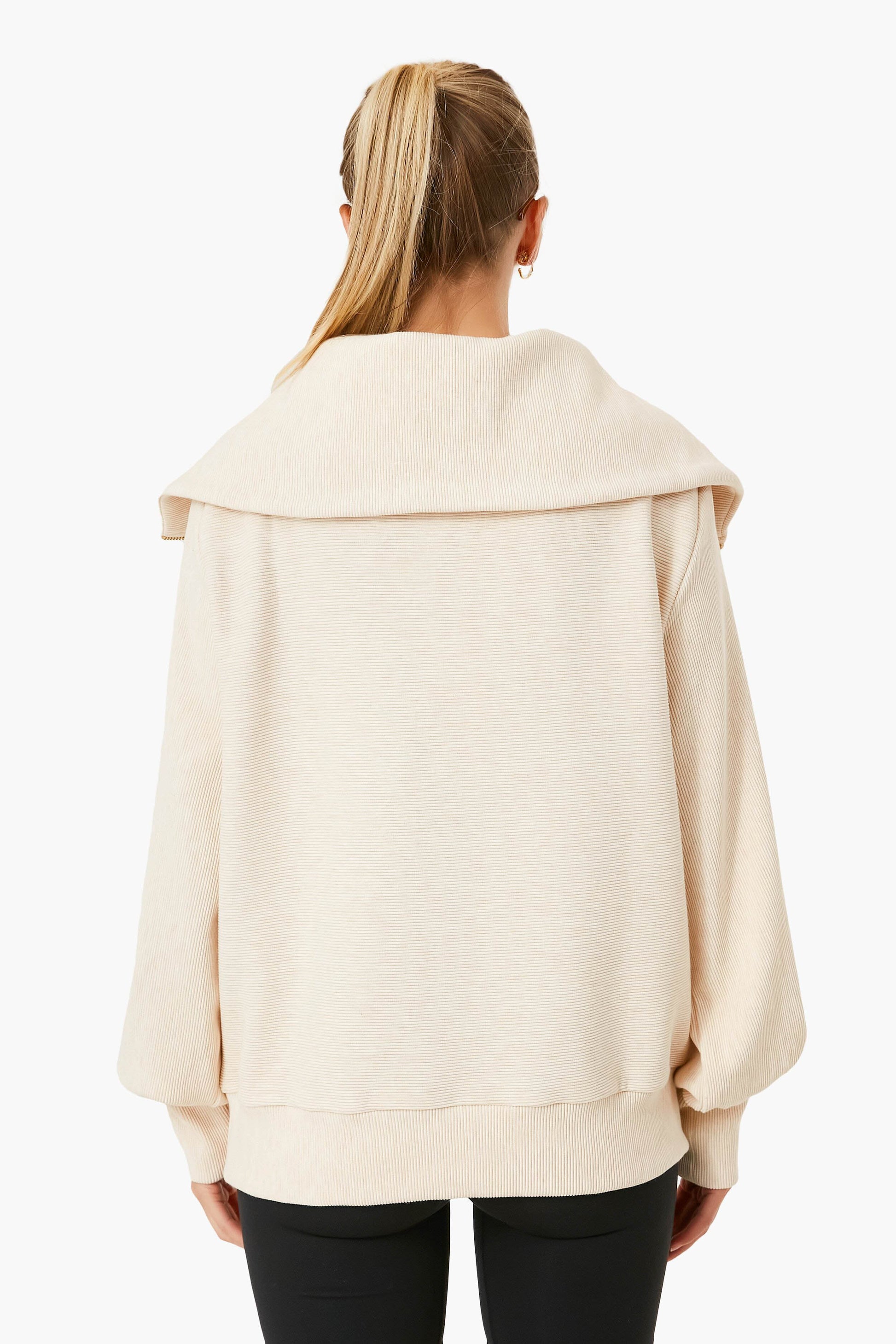 The Oatmeal Marl Vine Half Zip is constructed from ottoman rib fabric and designed to take you from the studio to the street. The exaggerated collar, puff sleeves, and hood zipper add style to this comfortable yet contemporary pullover. Throw over leggings post-workout or jeans for an easy weekend look.