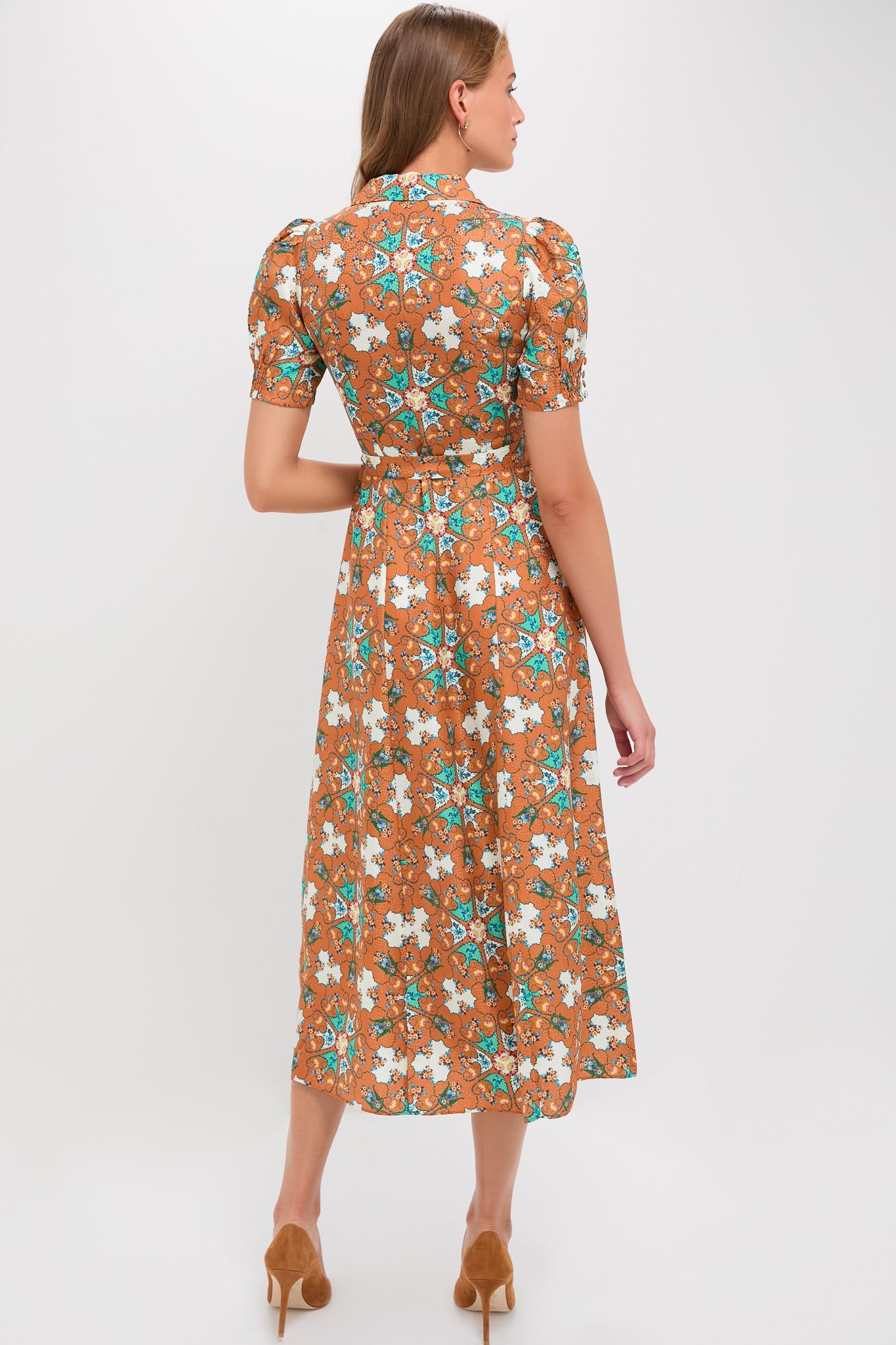 This sophisticated midi boasts short sleeves with smocked cuffs, a front button placket, and a removable waist belt. The fresh, classic A-line silhouette easily transitions from day to evening with flats or heels, perfect for endless occasions.