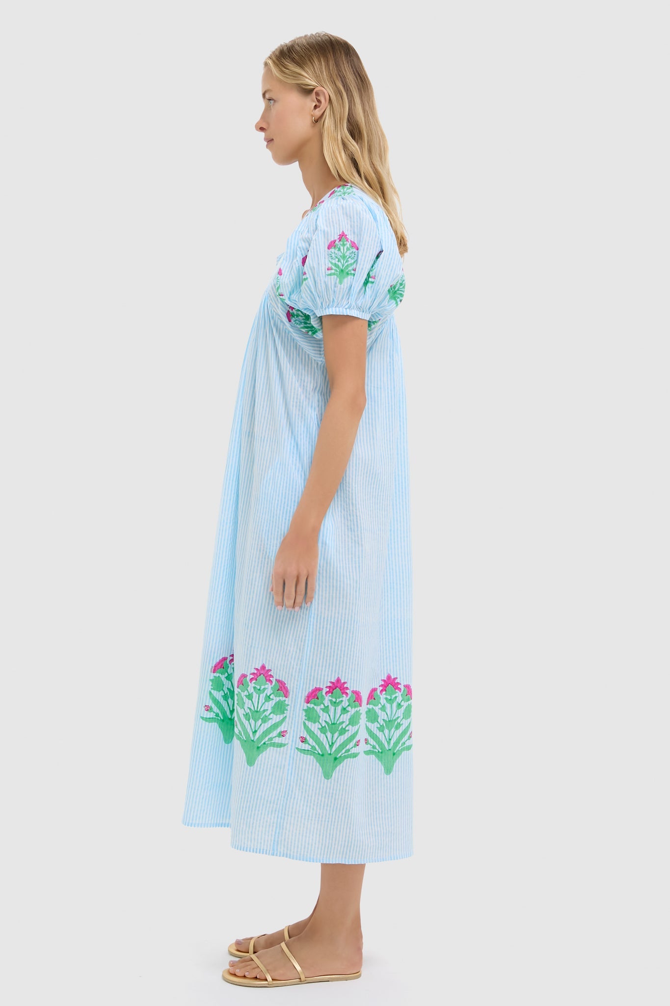 The Sai Dress is a breezy maxi with a feminine puffed sleeves and gathered yoke detail. The classic blue and white striped background is elevated with playful block-printed florals that take this look to the next level. Pair with sandals or heels for endless occasions this season!