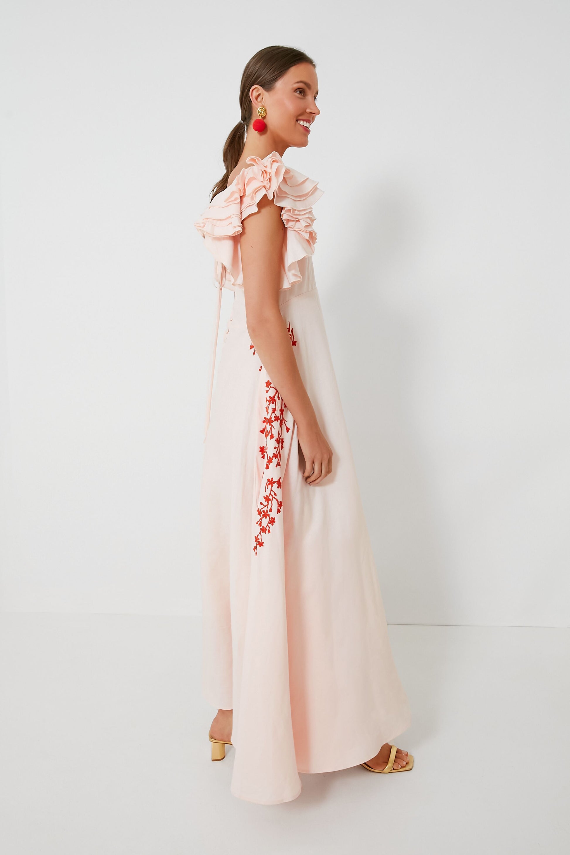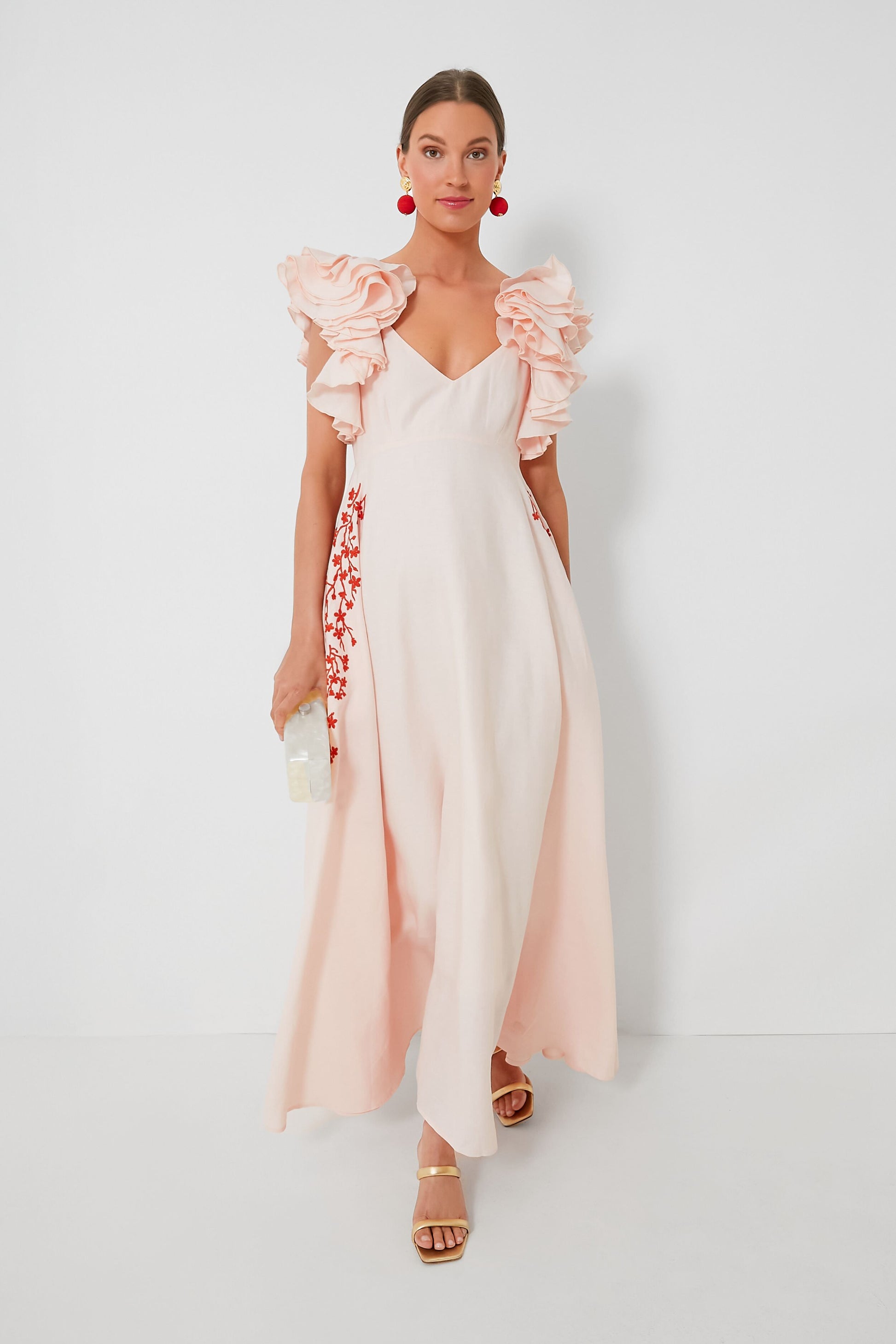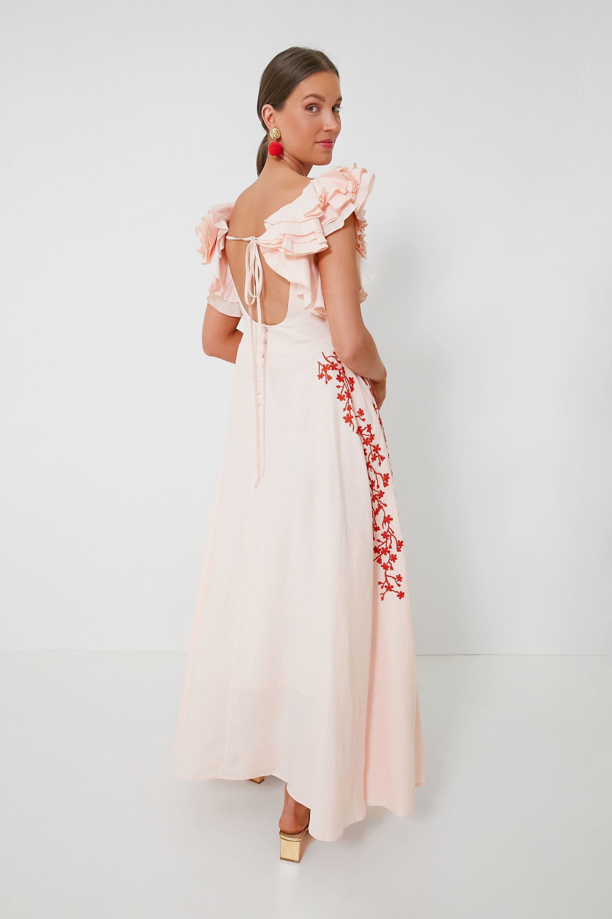 The Peach Essen Dress is the sweet and feminine silhouette we have been searching for to complete our warm-weather wardrobes. Full of elevated details like ruffled flutter sleeves that add some dimension, embroidered flowers across the sides and hips, and a scoop back with a bow detail, this maxi definitely brings out the flirty and romantic. An easy choice for any occasion and so easily dressed up with the addition of a clutch and heels, you'll reach for this style over and over again.