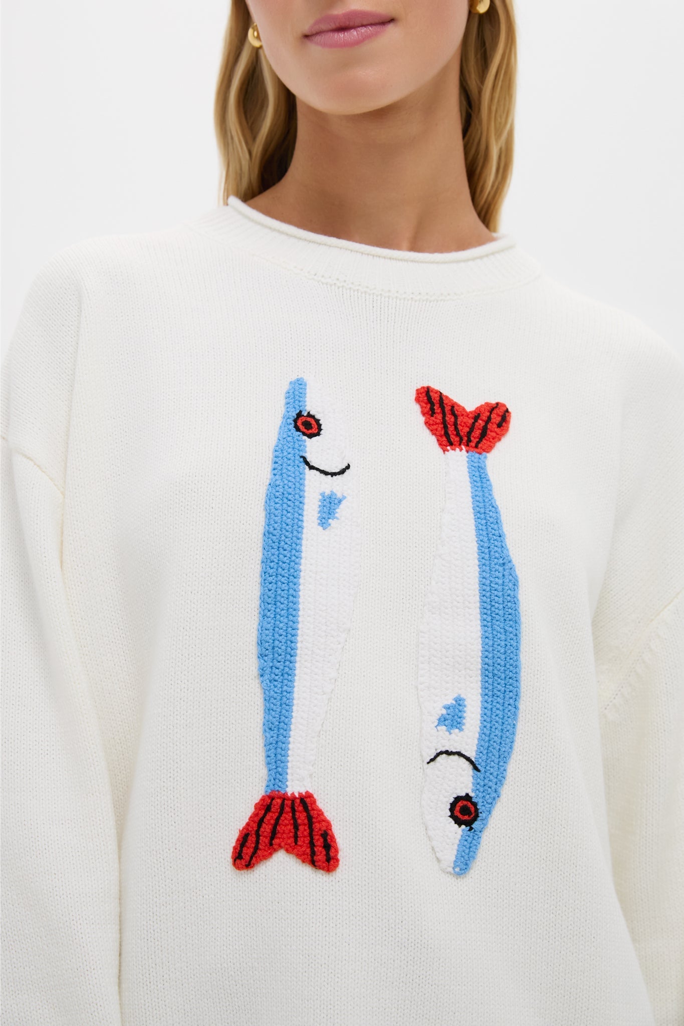 The Pier Ivory Giada Sweater is a fun summer sweater inspired by the sea. With a relaxed fit, jacquard fish motif, and ribbed knit finishes, this sweater is perfect for throwing on when the sun goes down over a dress, or pairing with denim shorts for a casual weekend look by the water!