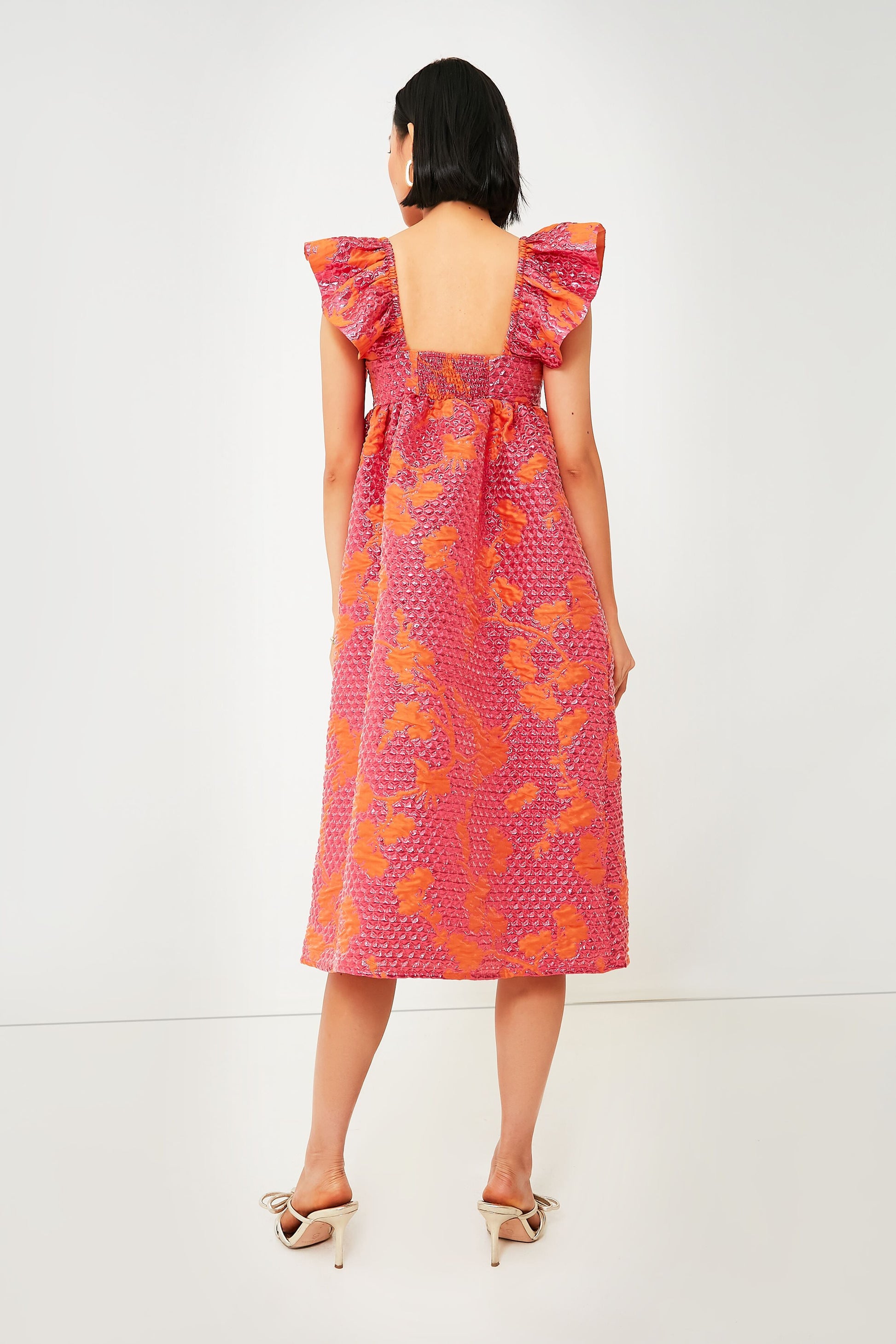 Talk about a statement silhouette! Crafted from a stunning metallic jacquard fabric that is sure to turn some heads, the Pink Bubble Astraea Dress features structured flutter sleeves, an empire waist, and a puffed skirt with side pockets. Modern with a touch of princess-like feel, this magnificent midi is the ultimate event style. Let it be the center of attention by pairing it simply with heels and a clutch for a feminine and fresh look.