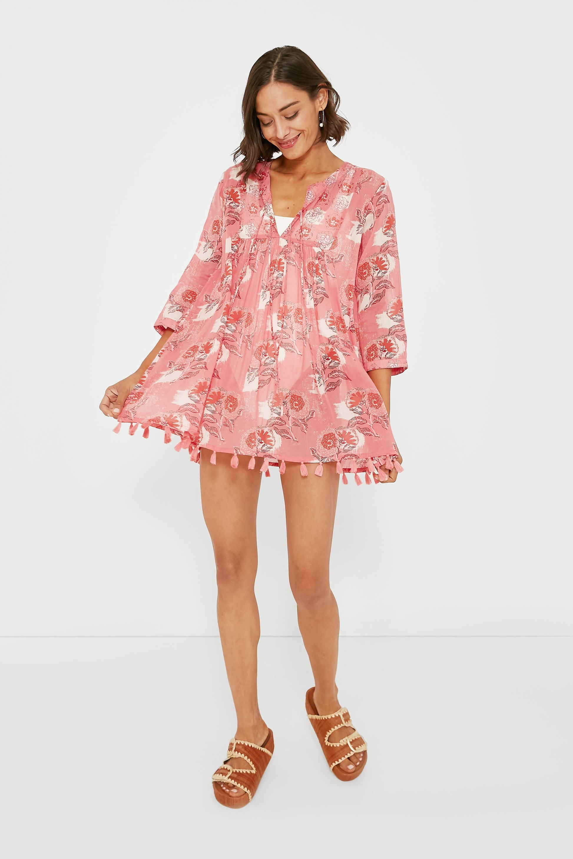 Crafted from light and breezy cotton, the Pink Denmark Seychelles Dress is the definition of vacation-ready! With a flattering open neckline, fun tassel ties, and a pompom trimmed hem, this mini length cover-up is airy, effortless, and super boho-chic. Pair with a swimsuit, sandals, and raffia earrings for a sunny day spent by the sea or relaxing poolside.