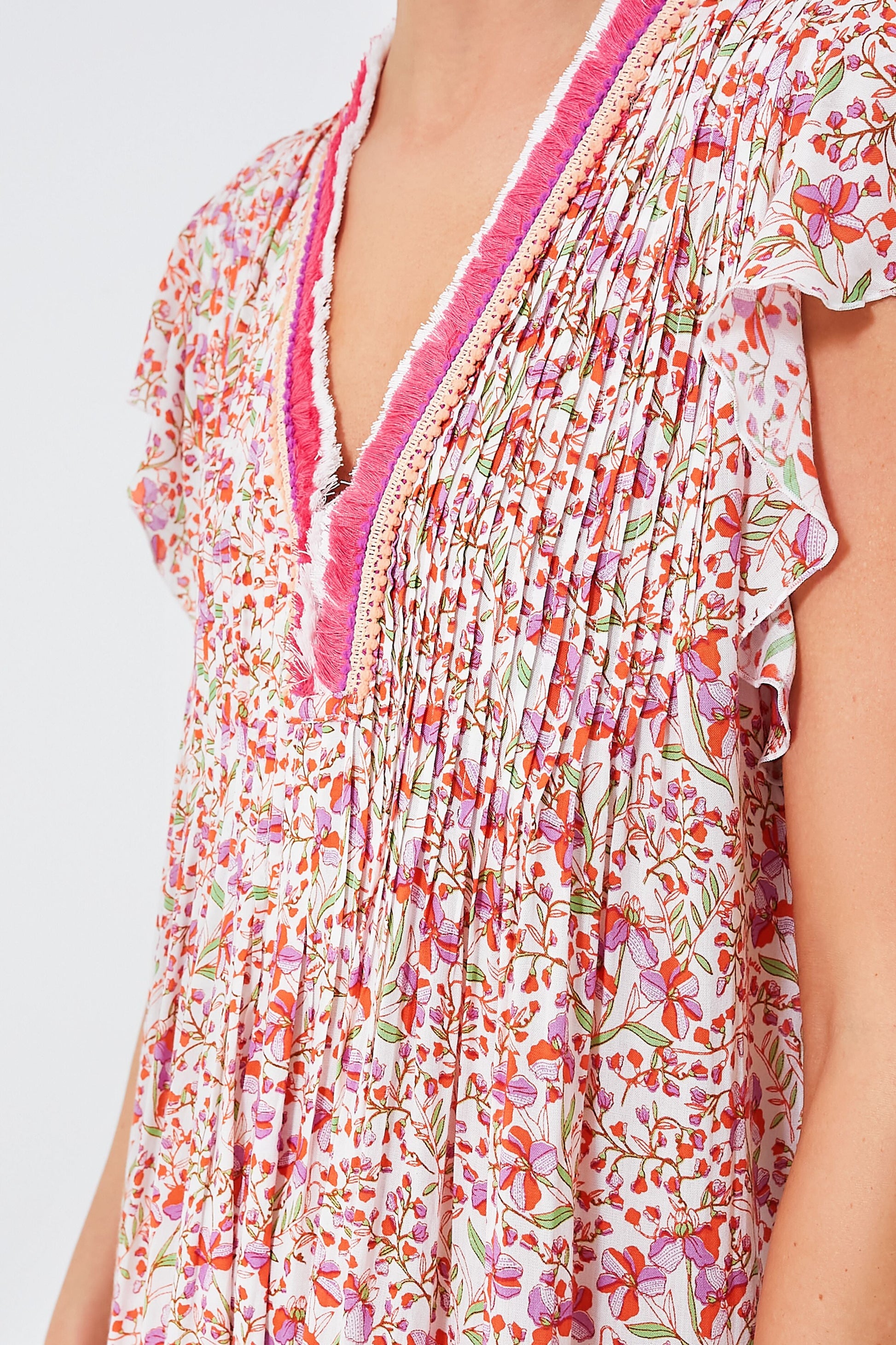 Have you ever seen a silhouette more suited for sunshine than the Pink Jonquille Sasha Dress? We sure haven't! Beautiful bohemian details such as a contrast fringed neckline, a delicate pintucked bodice, and flutter sleeves create a flirty and light mini that has a ton of character while still feeling easy and care-free. This breezy style works just as well over a swimsuit to head down to the beach as it does with sandals and sunglasses for a coffee run; take it along with you on your next warm weather adventure.