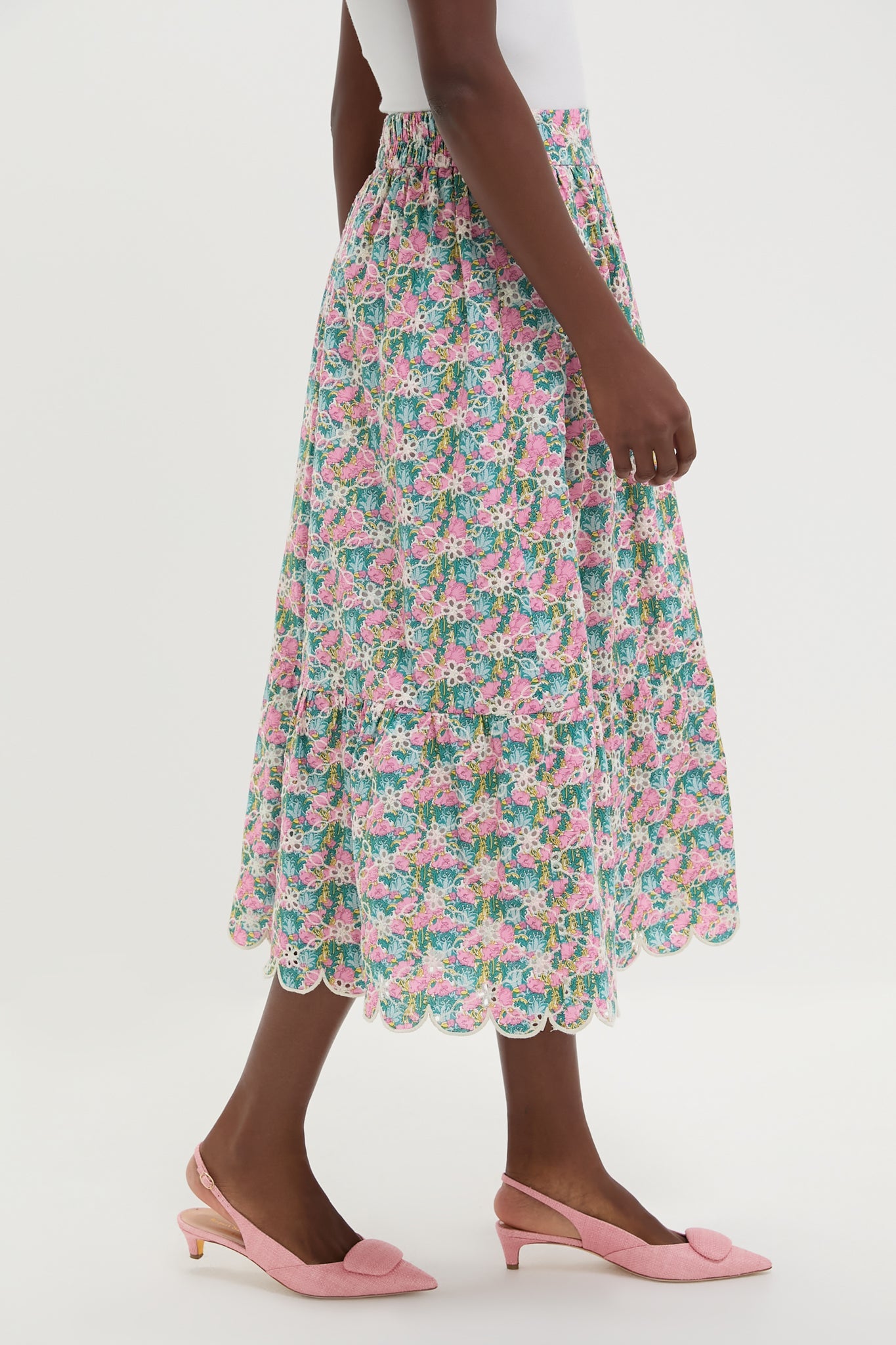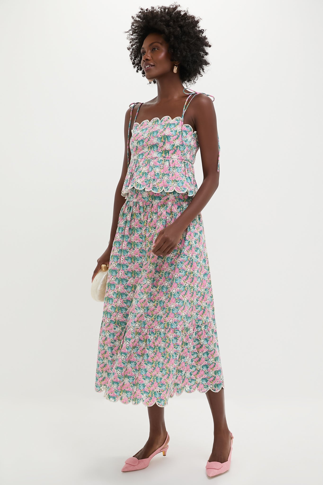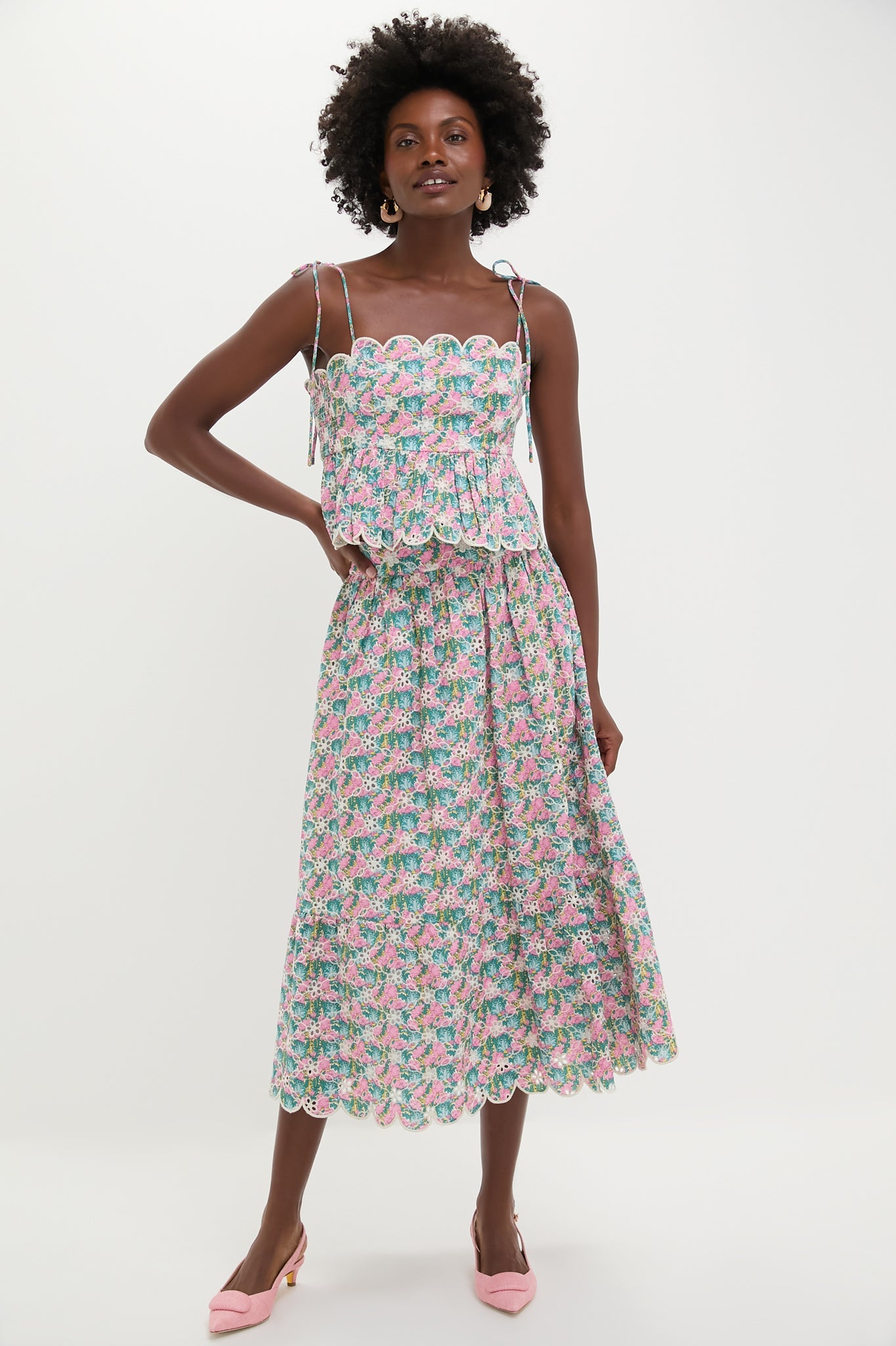 The Pink Multi Floral Scalloped Carter Midi Skirt is a romantic style with feminine details such as the wide ruffle hem, all-over eyelet embroidery, and scalloped hem. Perfect for warm-weather events, we are styling it with the matching Pink Multi Floral Scalloped Calla Top and heels!