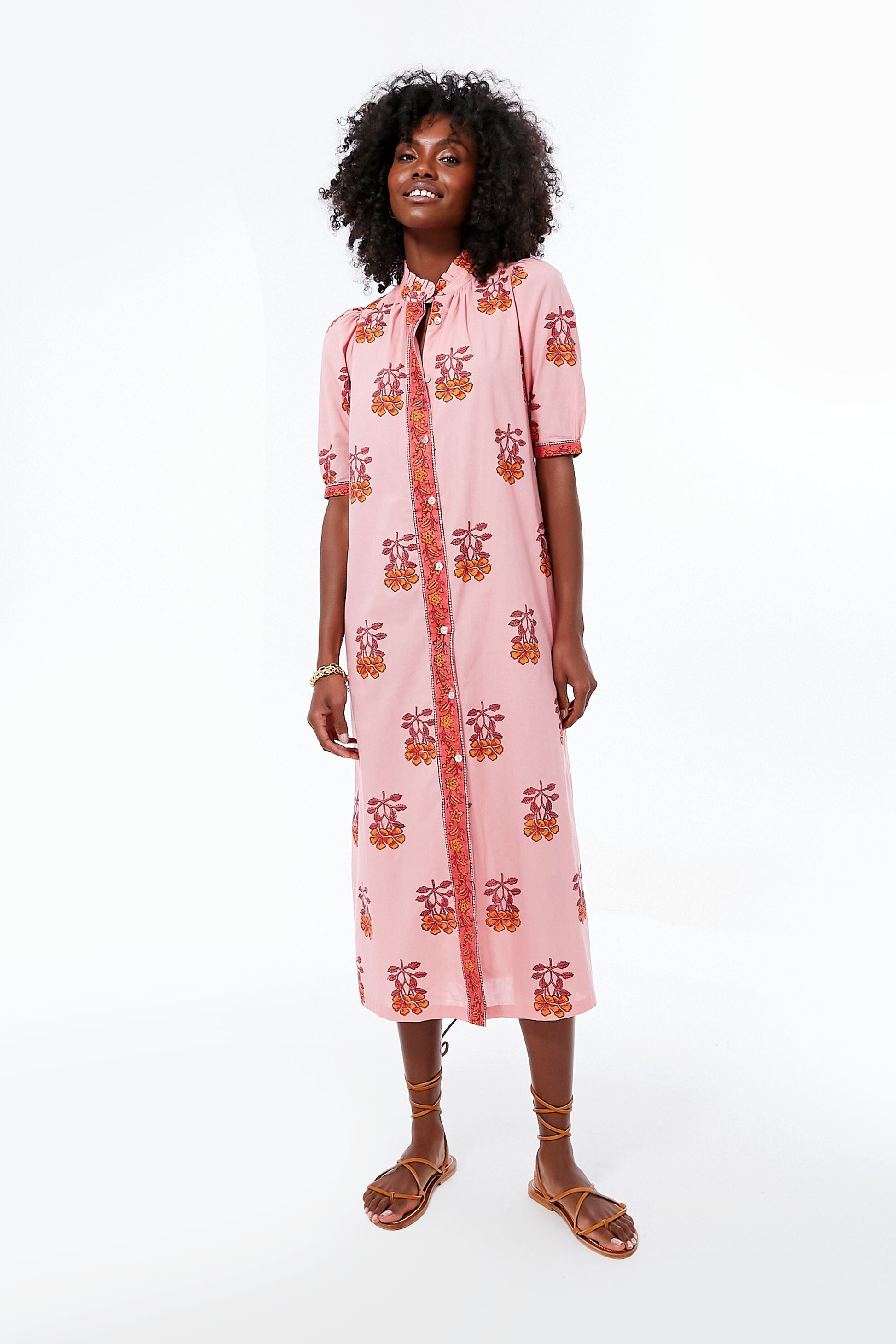 Need a pop of color to brighten up your life? The Pink Punch Remi Peony Dress does just that with its hand block printed florals and shining mother of pearl buttons. A ruffled stand collar, button front placket with a contrasting pattern, and a self-tie waist that can be tied in the front or the back all add special details to this lovely, feminine silhouette that you will treasure season after season. Style with strappy sandals and a tote for a beachside bohemian look that is absolutely perfect for those dreaming of a getaway.