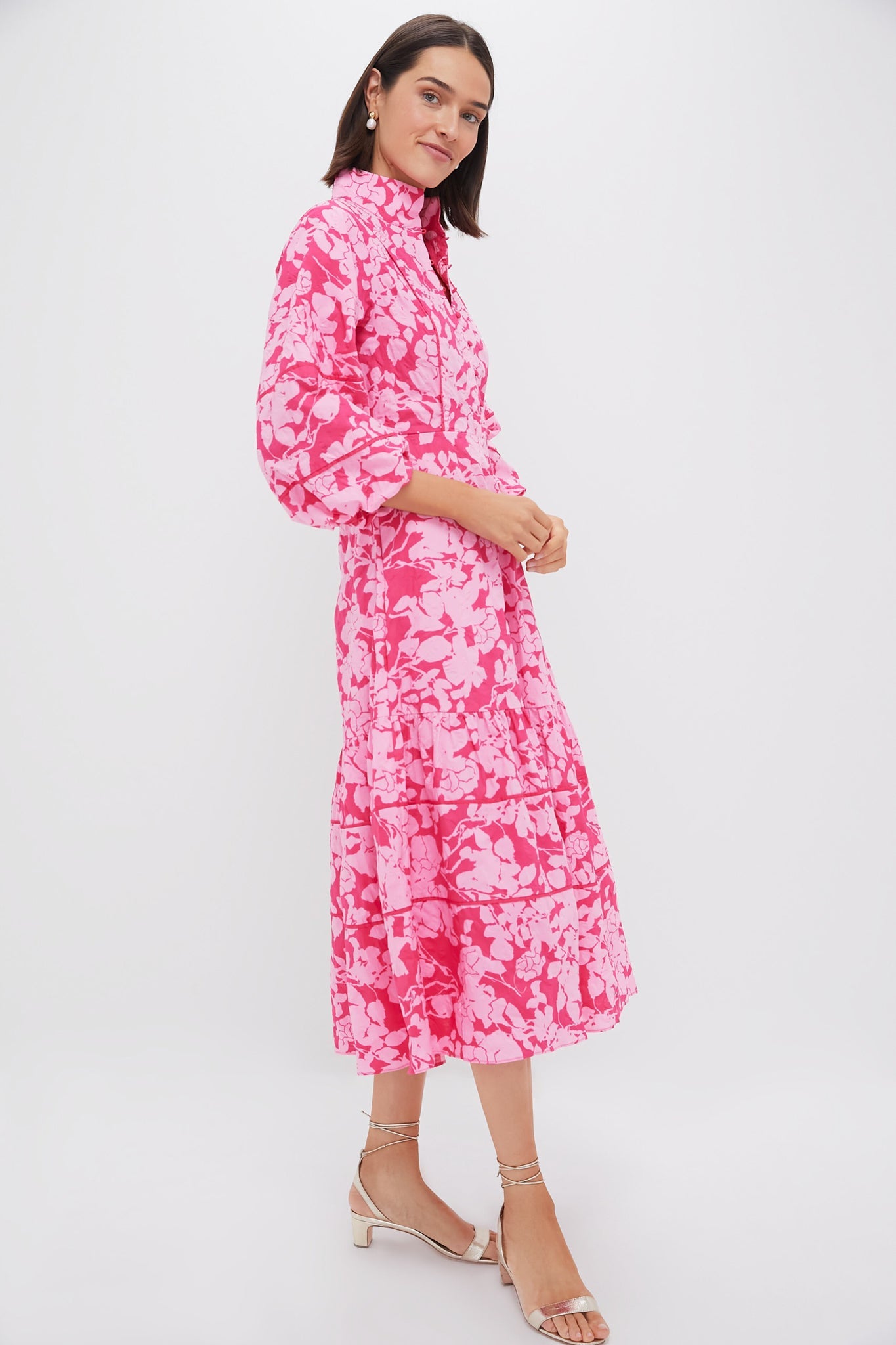 The Pink Textured Floral Hillsborough Midi Dress is perfect for warm days spent out and about. This midi boasts three-quarter length puff sleeves, a fit and flare silhouette, and a tiered skirt with piping panels. The eye-catching design and textured fabric are the cherries on top! Pair with heels and a clutch, or simple sandals and gold jewelry.