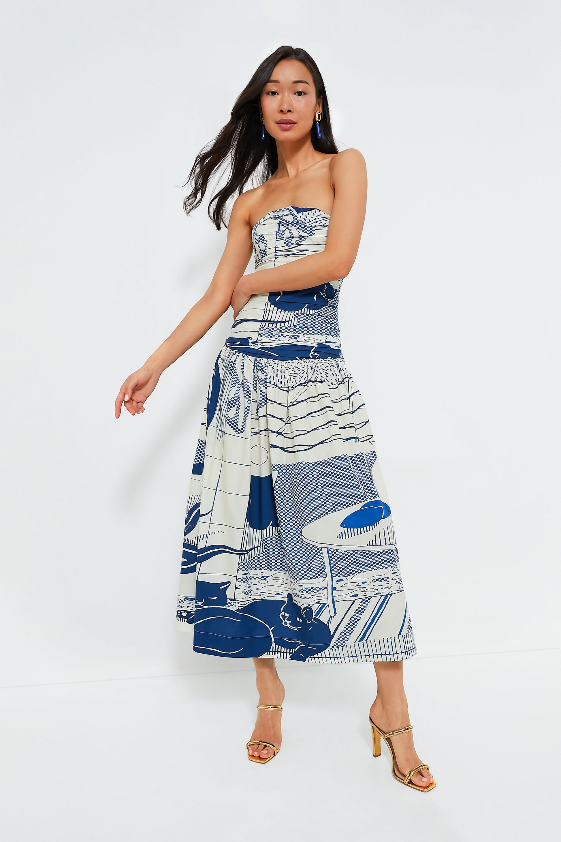 The Playa Print Maia Dress is a piece of artwork that you can wear. This modern, elegant maxi boasts a fitted ruched bodice, a strapless neckline, and a drop waist with a pleated A-line skirt. Made in collaboration with French artist Henriette Arcelin, the eye-catching pattern is sure to make a statement. Pair with heels and bold jewelry for a graceful event look.