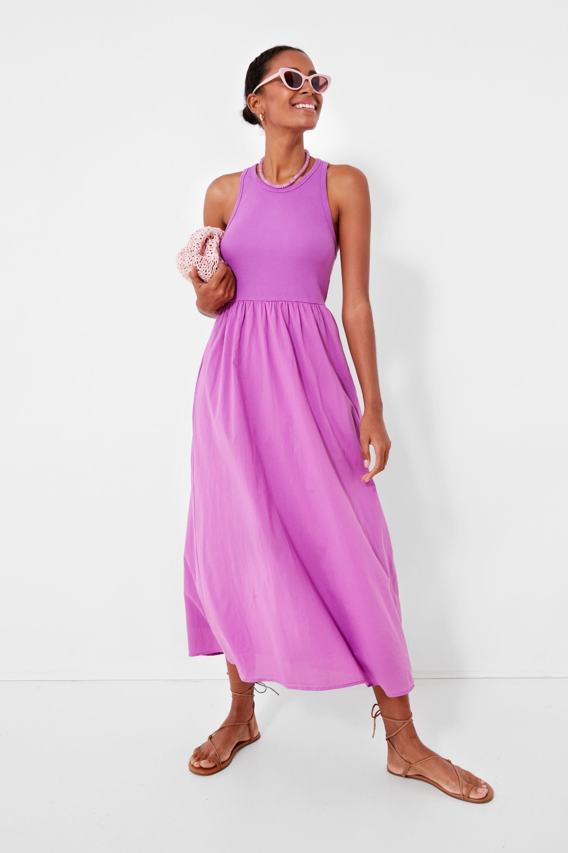 The Purple Orchid Flynn is the dress up, dress down number of your dreams. Made in their classic lightweight woven cotton poplin, this midi has a lived-in look and feel. Our favorite features include the contrast rib knit racerback tank, full skirt, and side seam pockets for all your little essentials. Add sandals for a casual daytime strolls or elevate it with a block heel and gold accessories for date night!