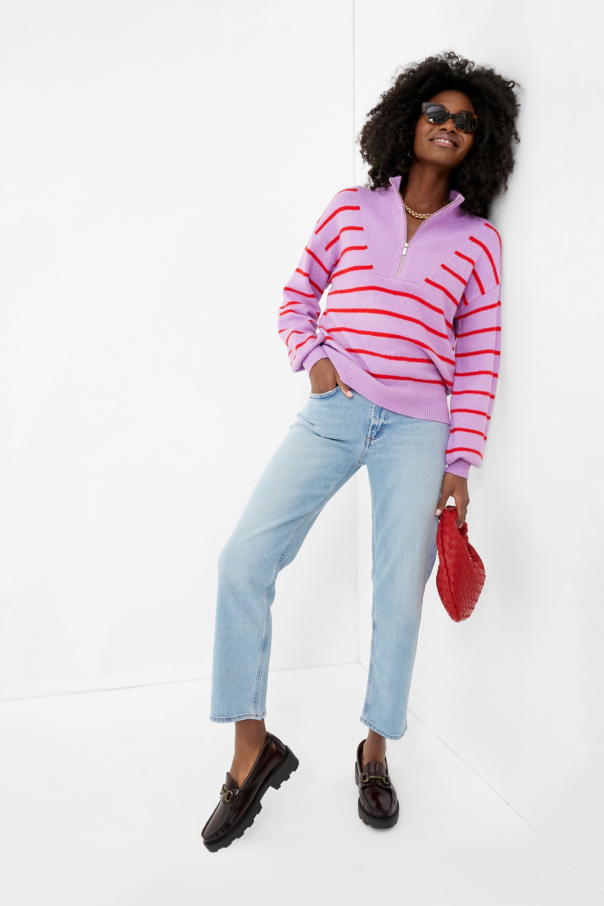 Get in line. The Purple Striped Quarter Zip takes the classic nautical vibes we know and love, and gives them a fresh update with bright hues! Complete with a mock neckline, a zippered front placket, and a cozy relaxed fit, you're sure to love this soft sweater for all seasons — pair it with leggings and boots, shorts and sandals, denim and a tote, or over your shoulders with a dress.