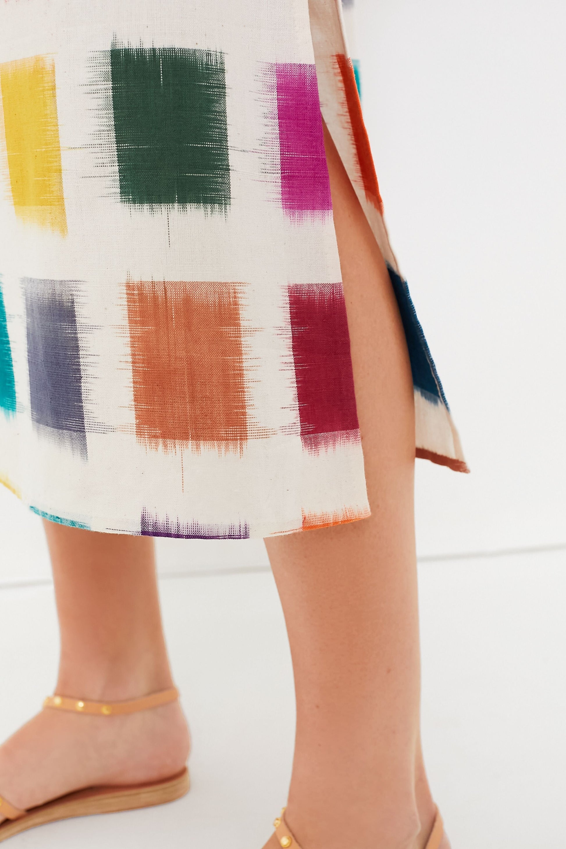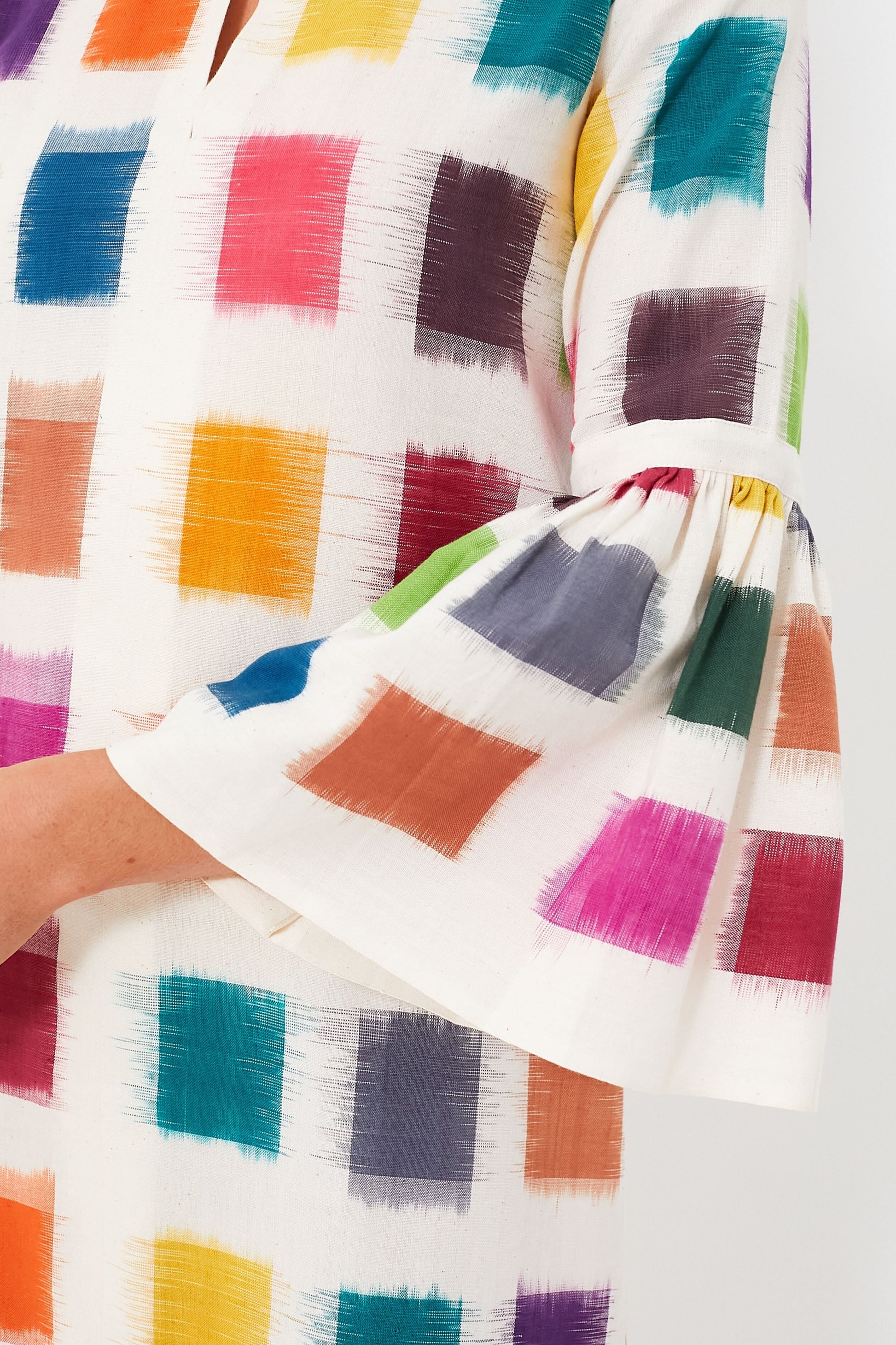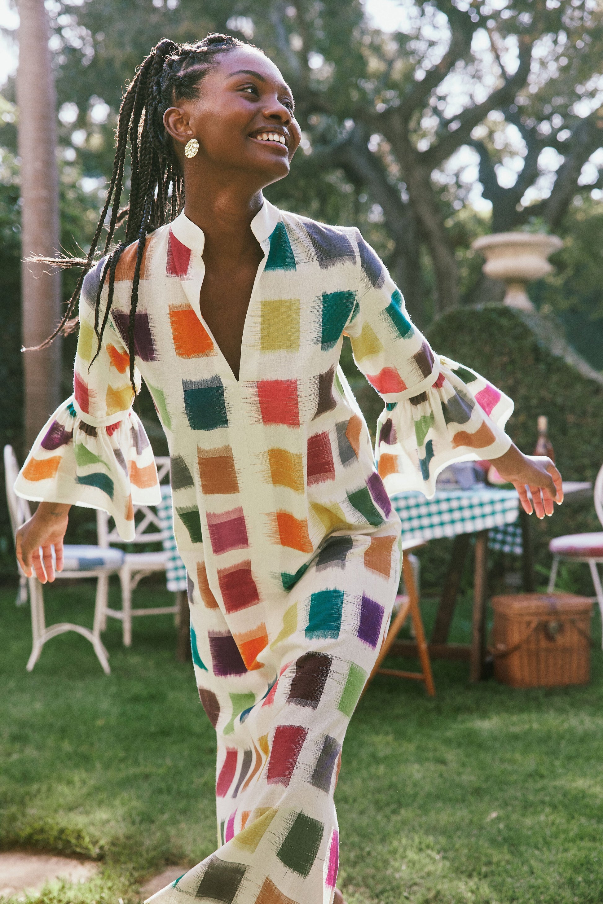 Taking 'pop of color' to a whole new level! The Rainbow Parampara Dress is crafted from soft, organic cotton and woven entirely by hand in the south of India for a silhouette that feels ultra-luxe. This midi features an elegant stand collar, bell cuffs for a little drama, and side slits for added movement to catch those warm breezes ahead. Add sandals and gold jewelry for daytime, then swap them out for wedges and a clutch to take it into evening.