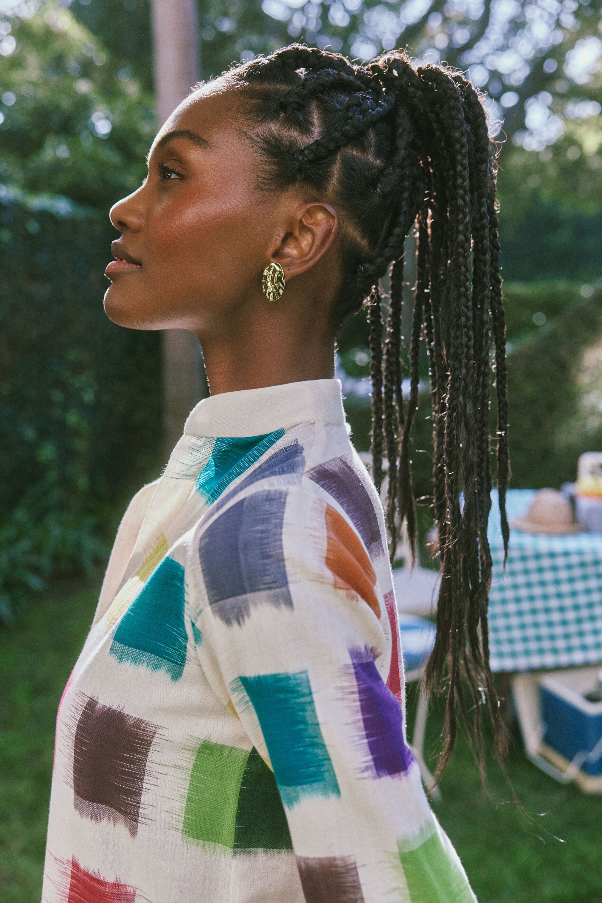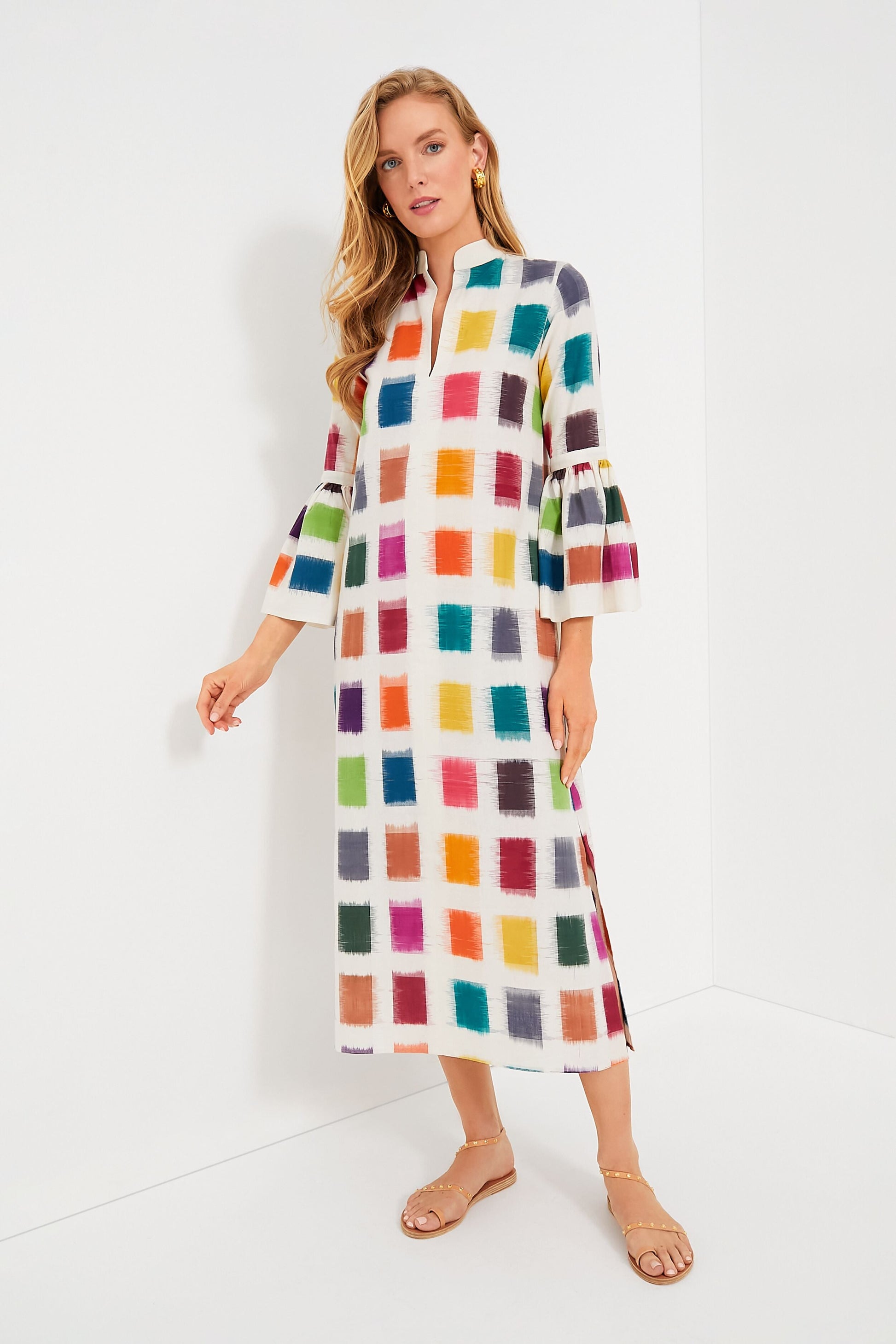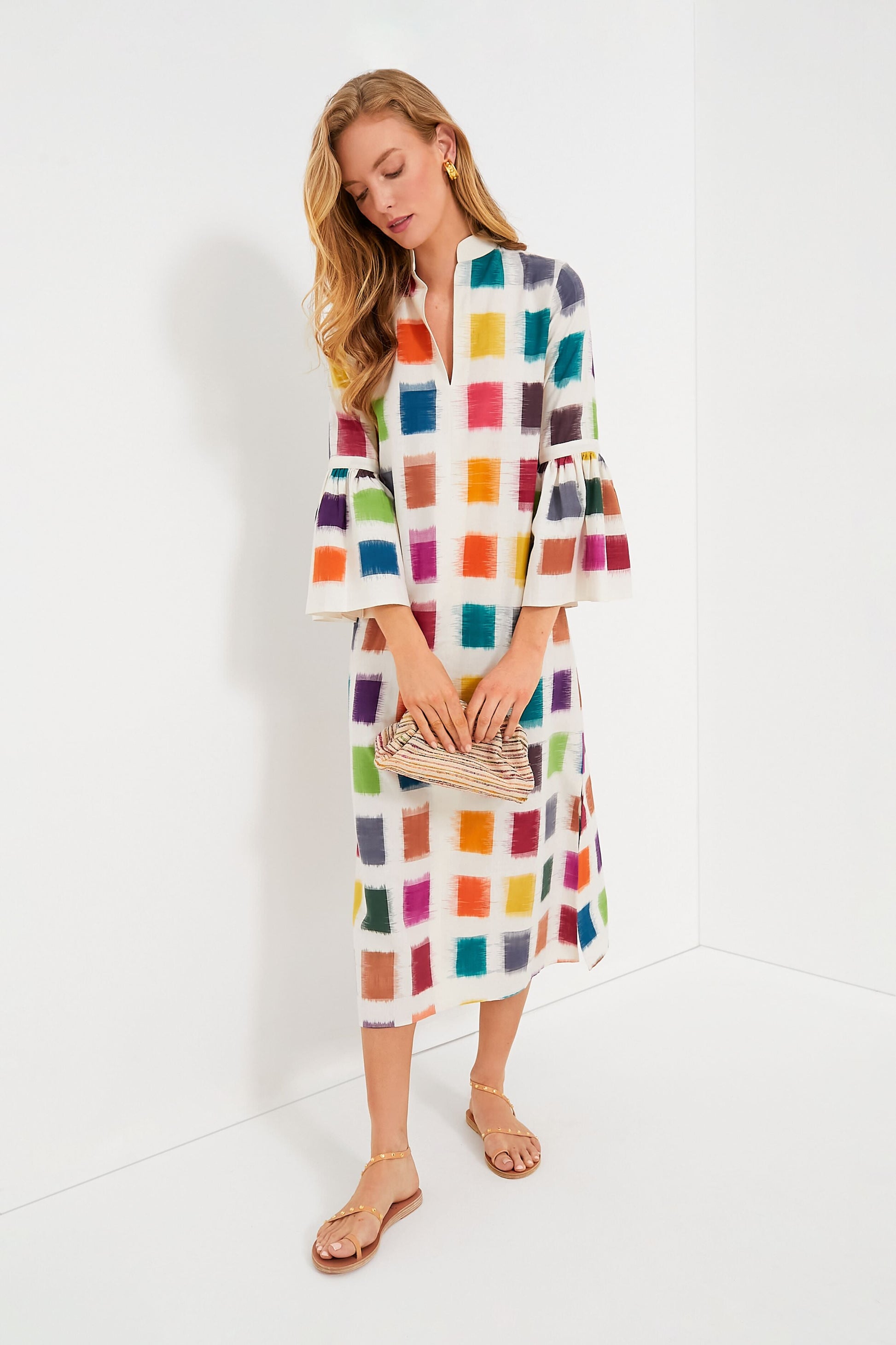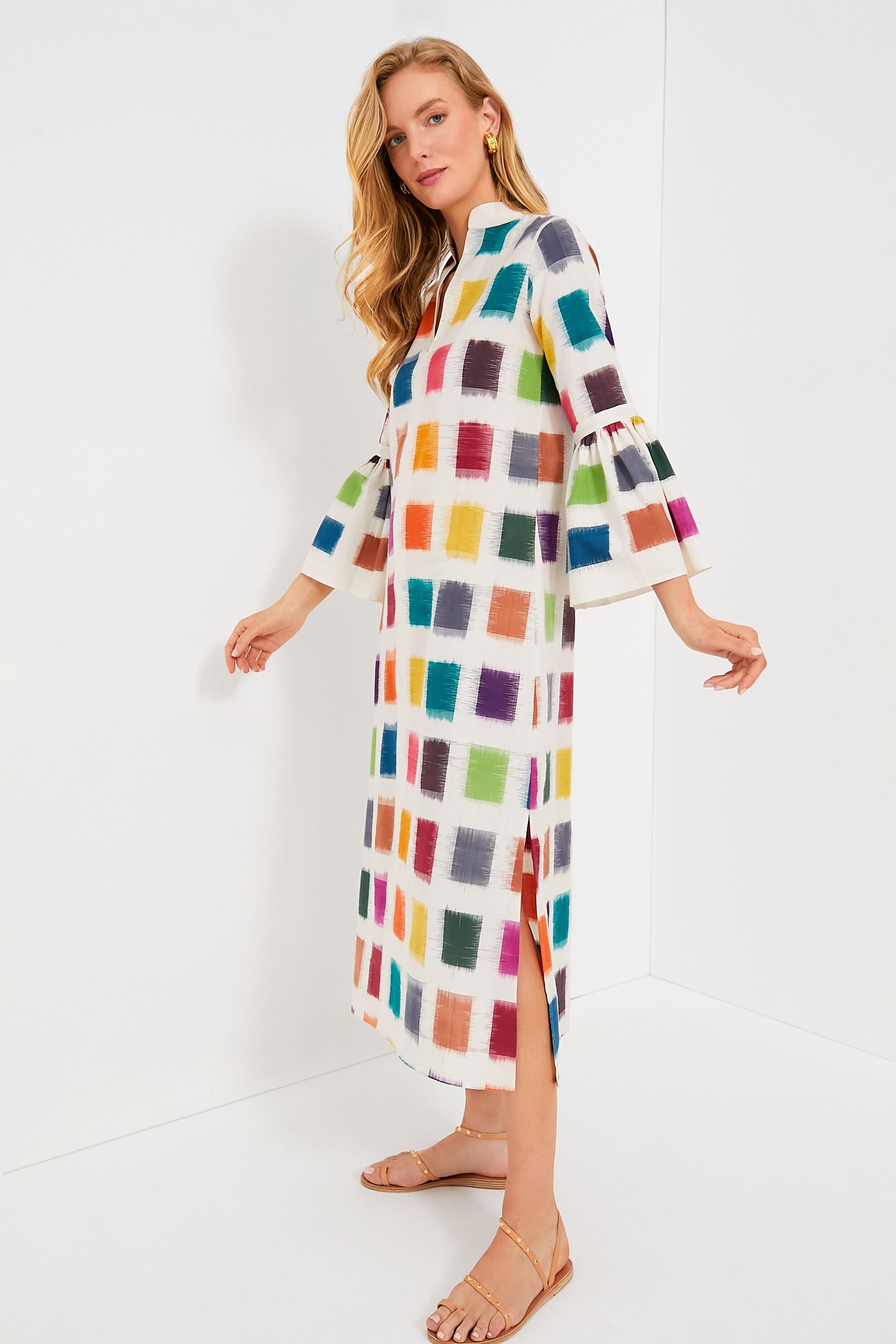 Taking 'pop of color' to a whole new level! The Rainbow Parampara Dress is crafted from soft, organic cotton and woven entirely by hand in the south of India for a silhouette that feels ultra-luxe. This midi features an elegant stand collar, bell cuffs for a little drama, and side slits for added movement to catch those warm breezes ahead. Add sandals and gold jewelry for daytime, then swap them out for wedges and a clutch to take it into evening.