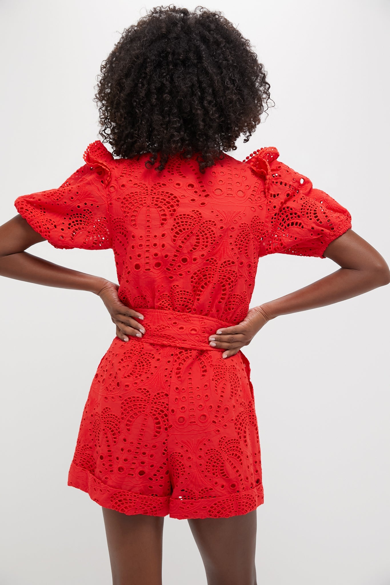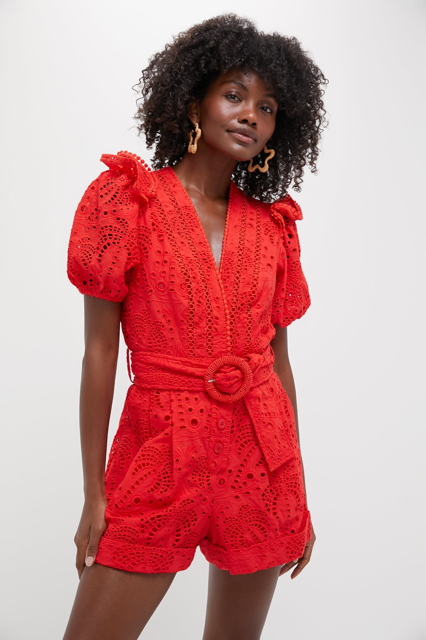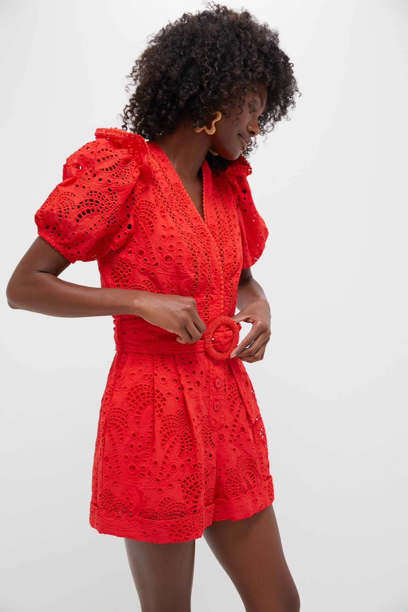 Step into elegance with the Red Eyelet Beaded Belt Romper by FARM Rio.