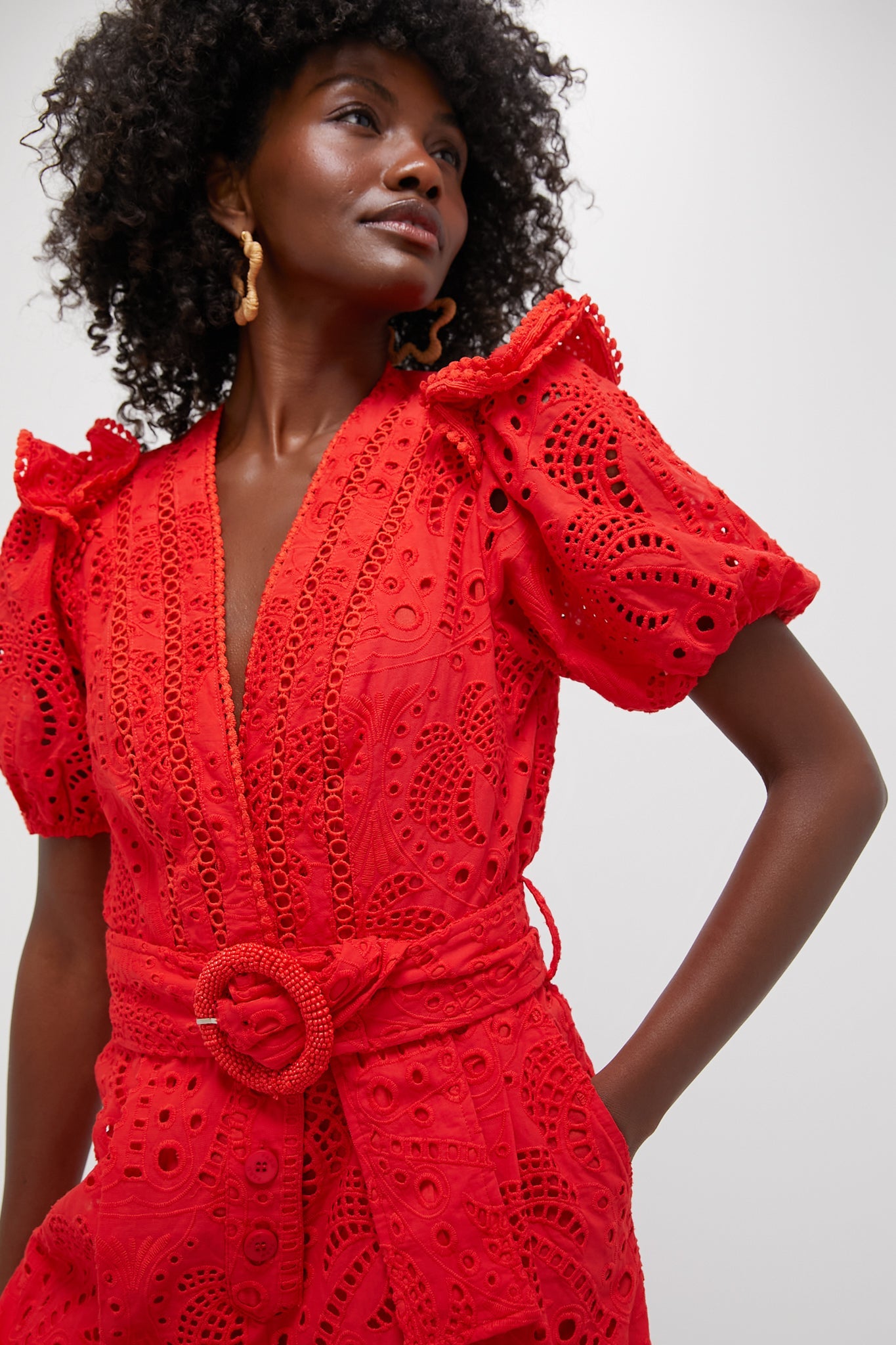This piece combines playful eyelet fabric with a striking V neckline, creating a silhouette that's both bold and feminine. The puffed sleeves add a touch of romance, while the intricately beaded belt cinches the waist, enhancing its playful flair. Perfect for any occasion where style and charm are paramount, this romper radiates warmth and sophistication.