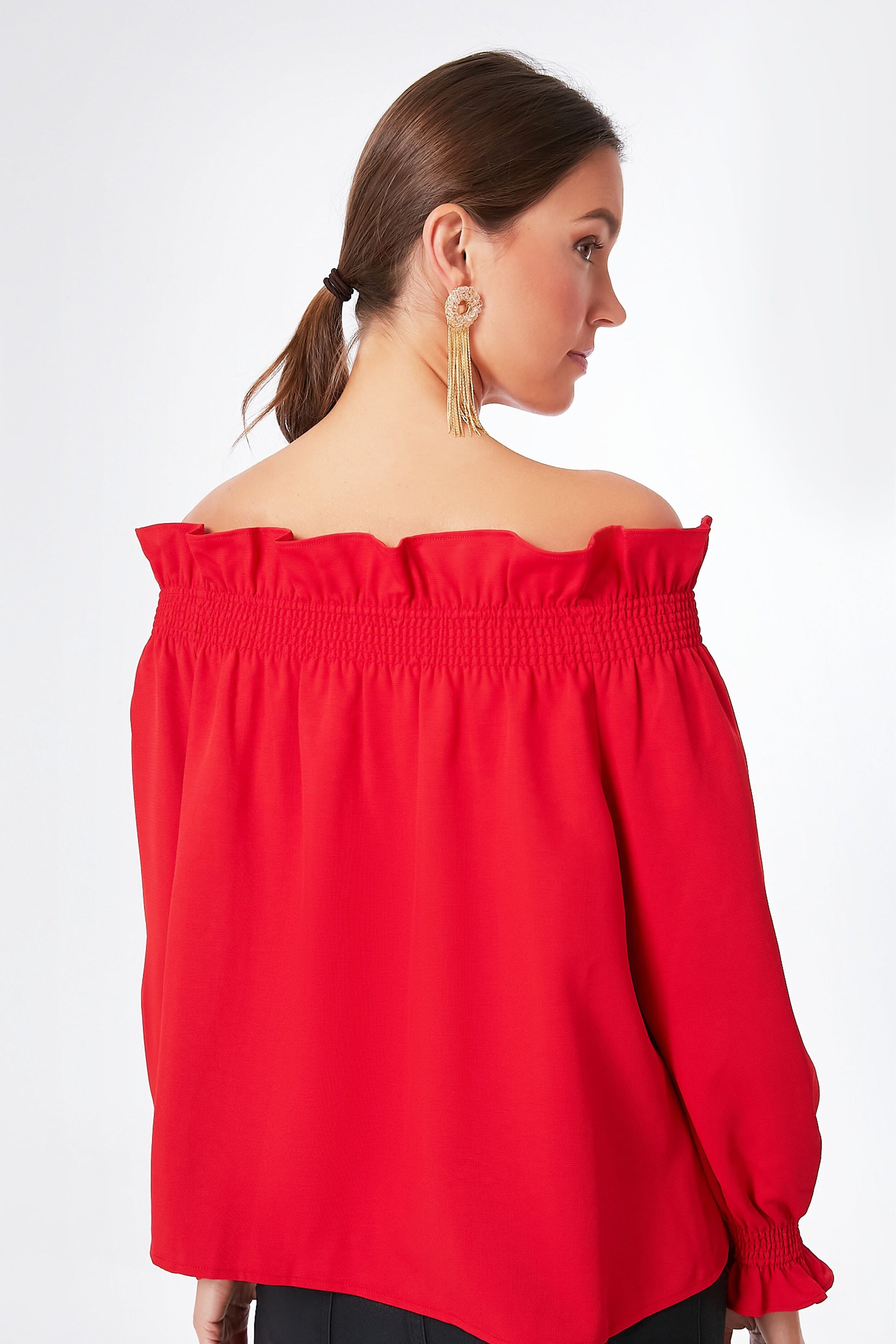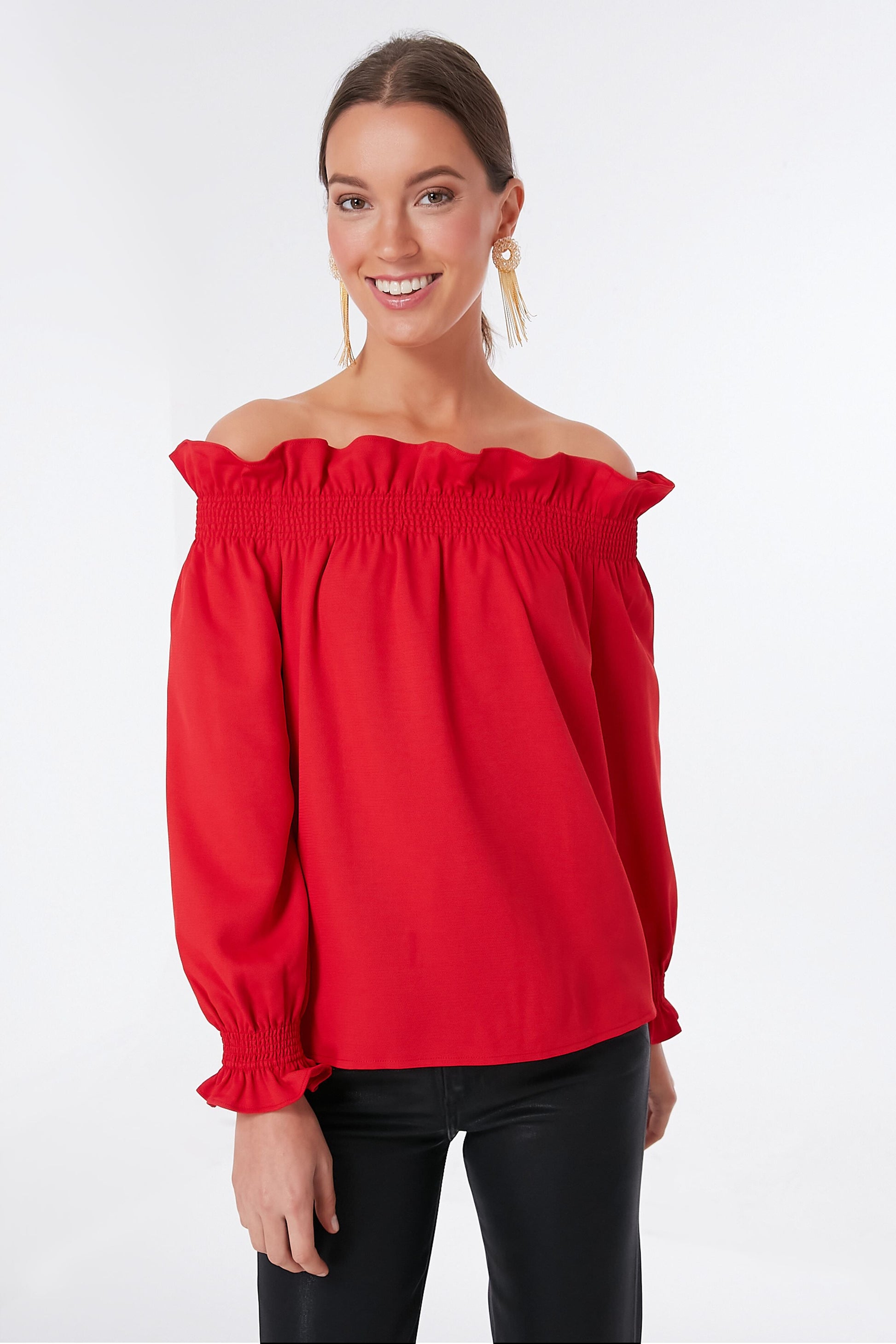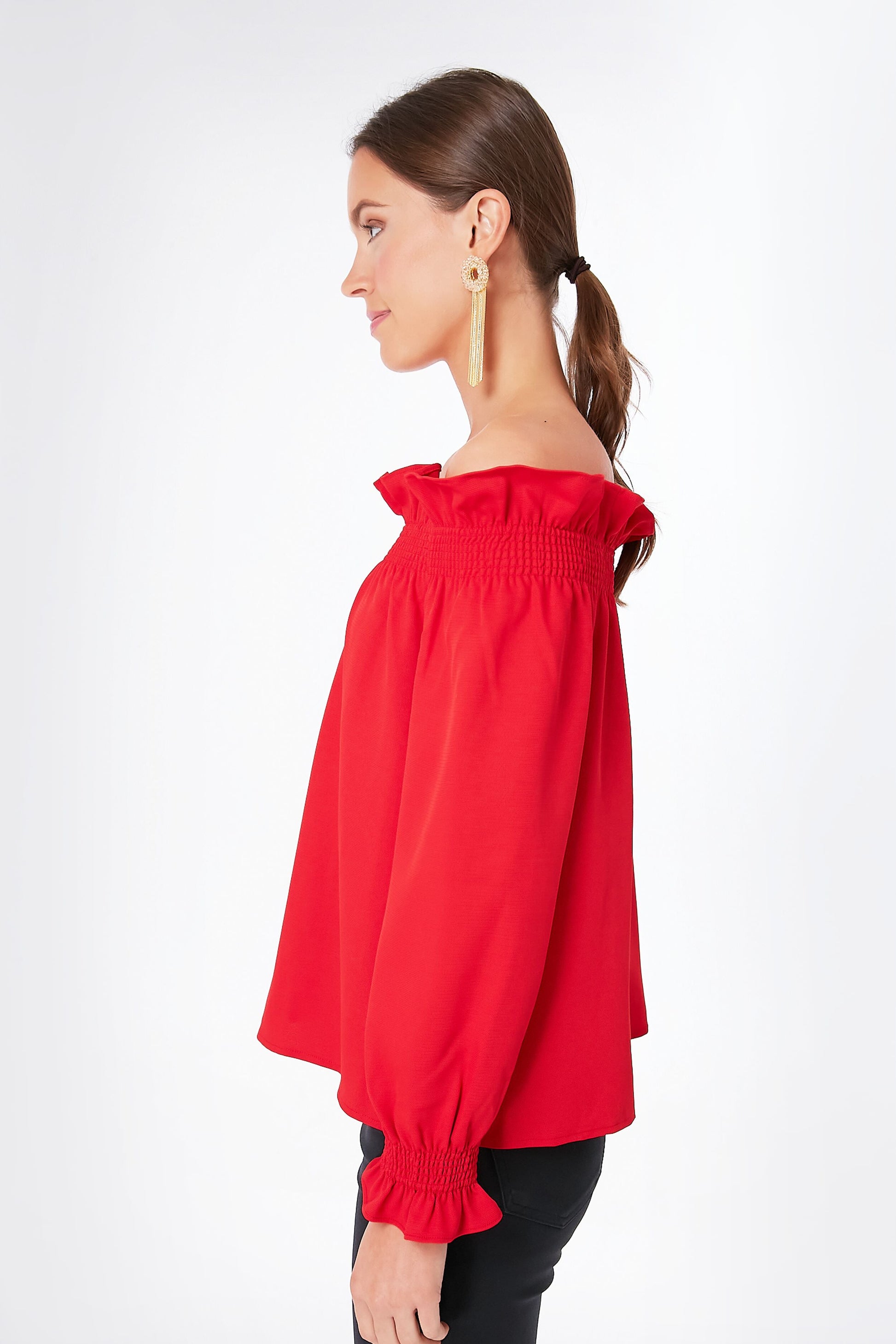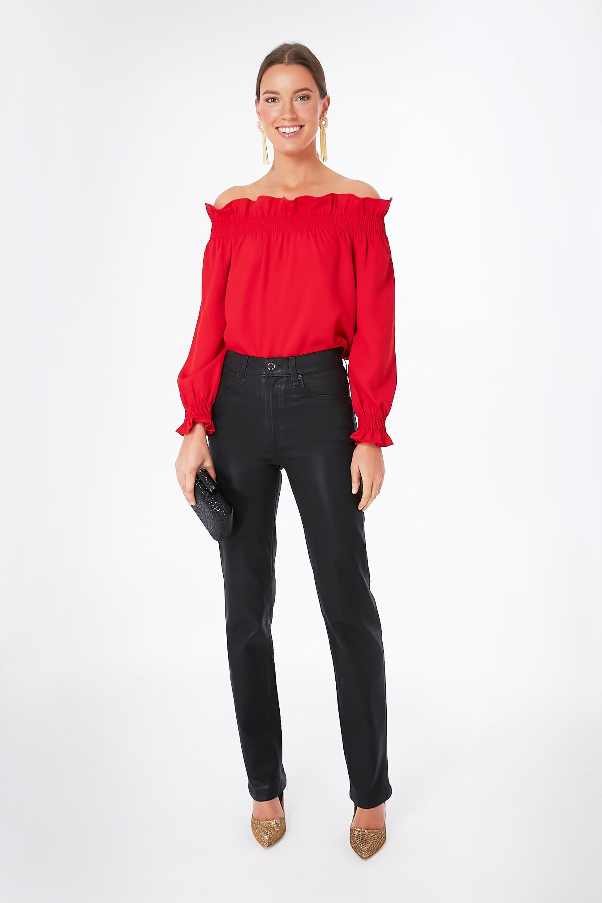 Our favorite lady, Marguerite, is back and better than ever in a spicy red colorway. Add a bit of off the shoulder sass to your look with a structured ruffle neckline and cuffs. We are styling this top with bold statement earrings and heels for date night and happy hour with friends.