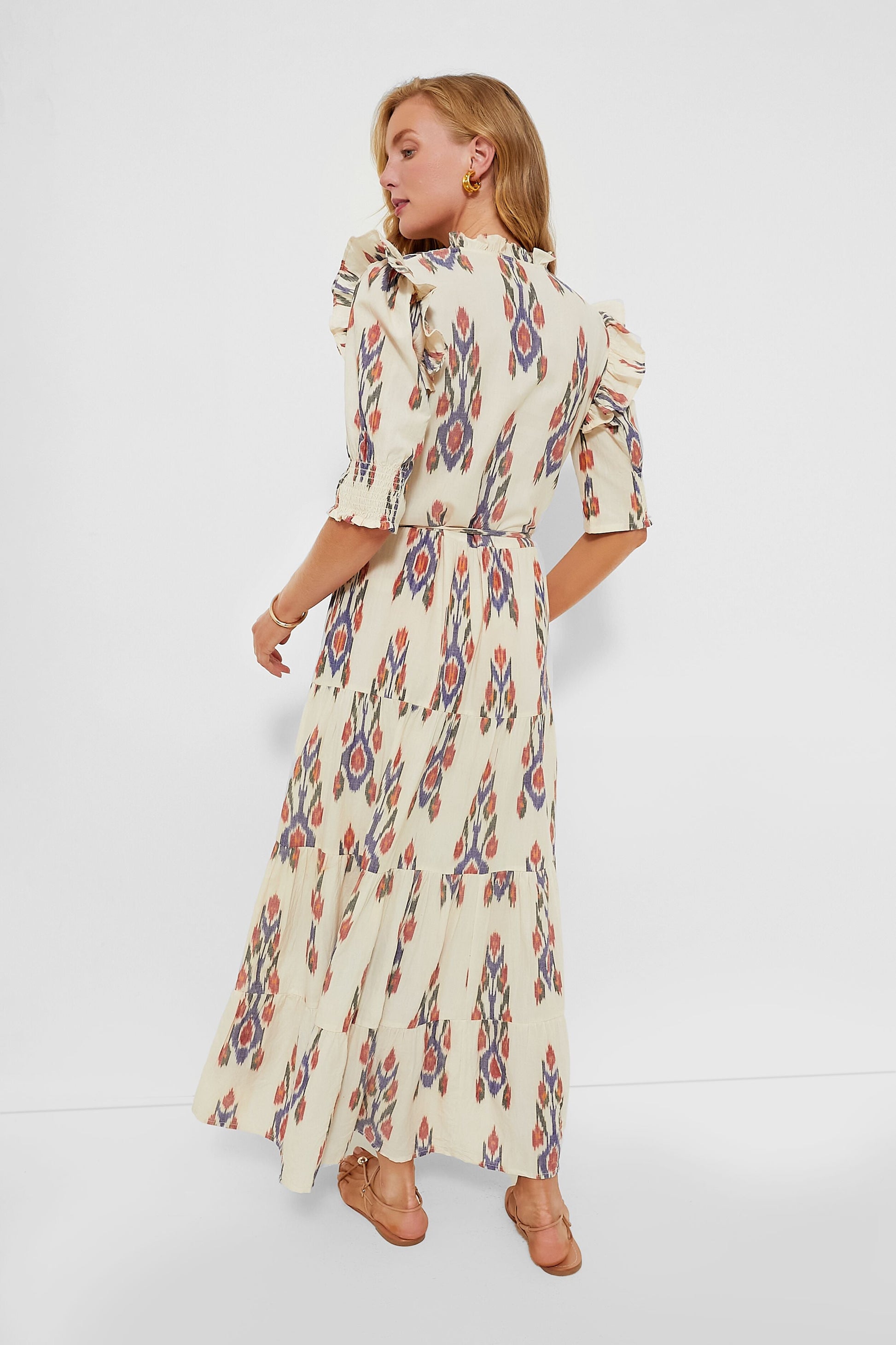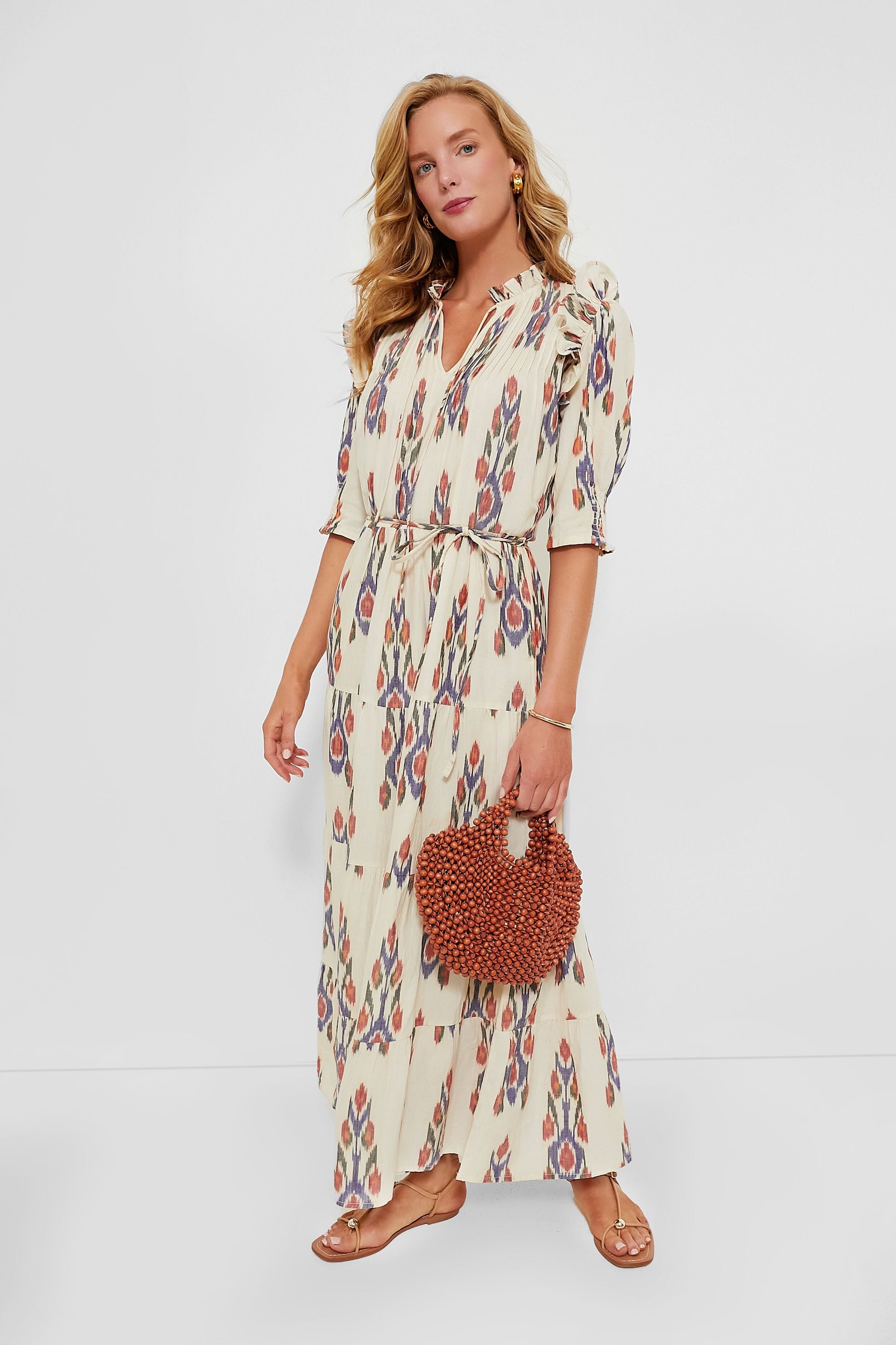 The Sanford Cream Cinched Pintuck Maxi Dress is a chic style with feminine details and an eye-catching print. This maxi features ruffle shoulders, half-length puff sleeves, and a tiered body. Pair with sandals and a tote for days spent wandering around town, or dress up with statement earrings and heels.