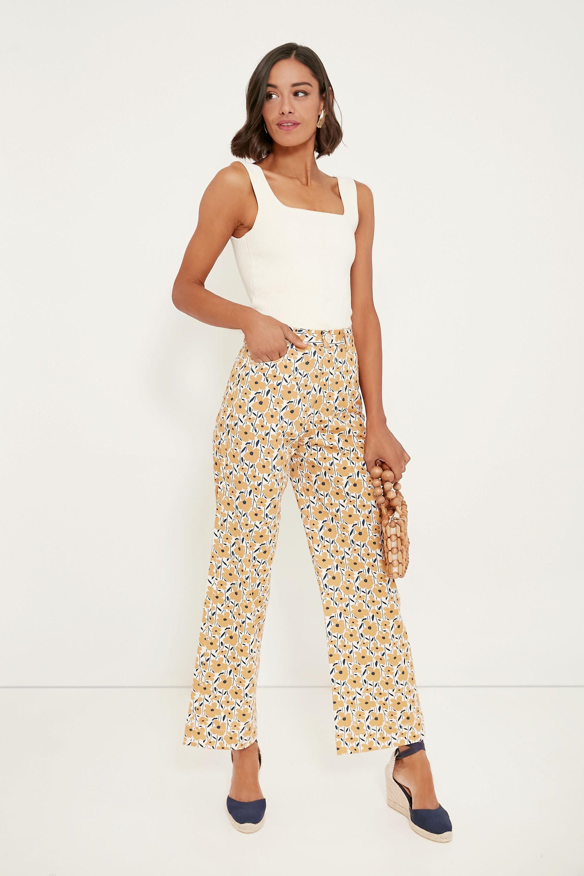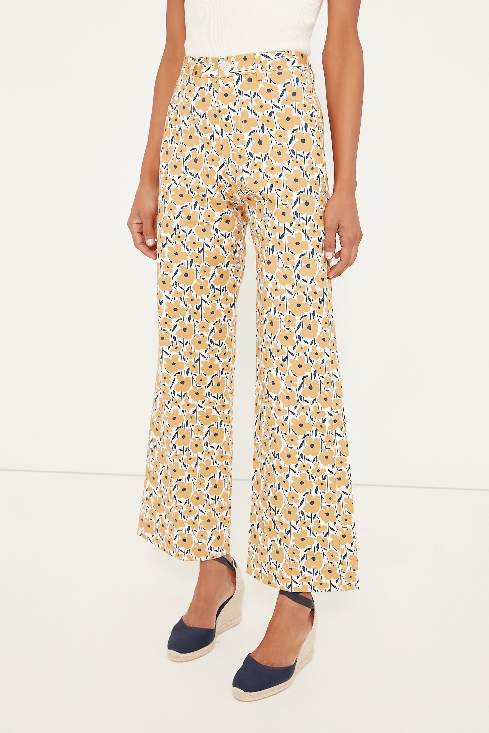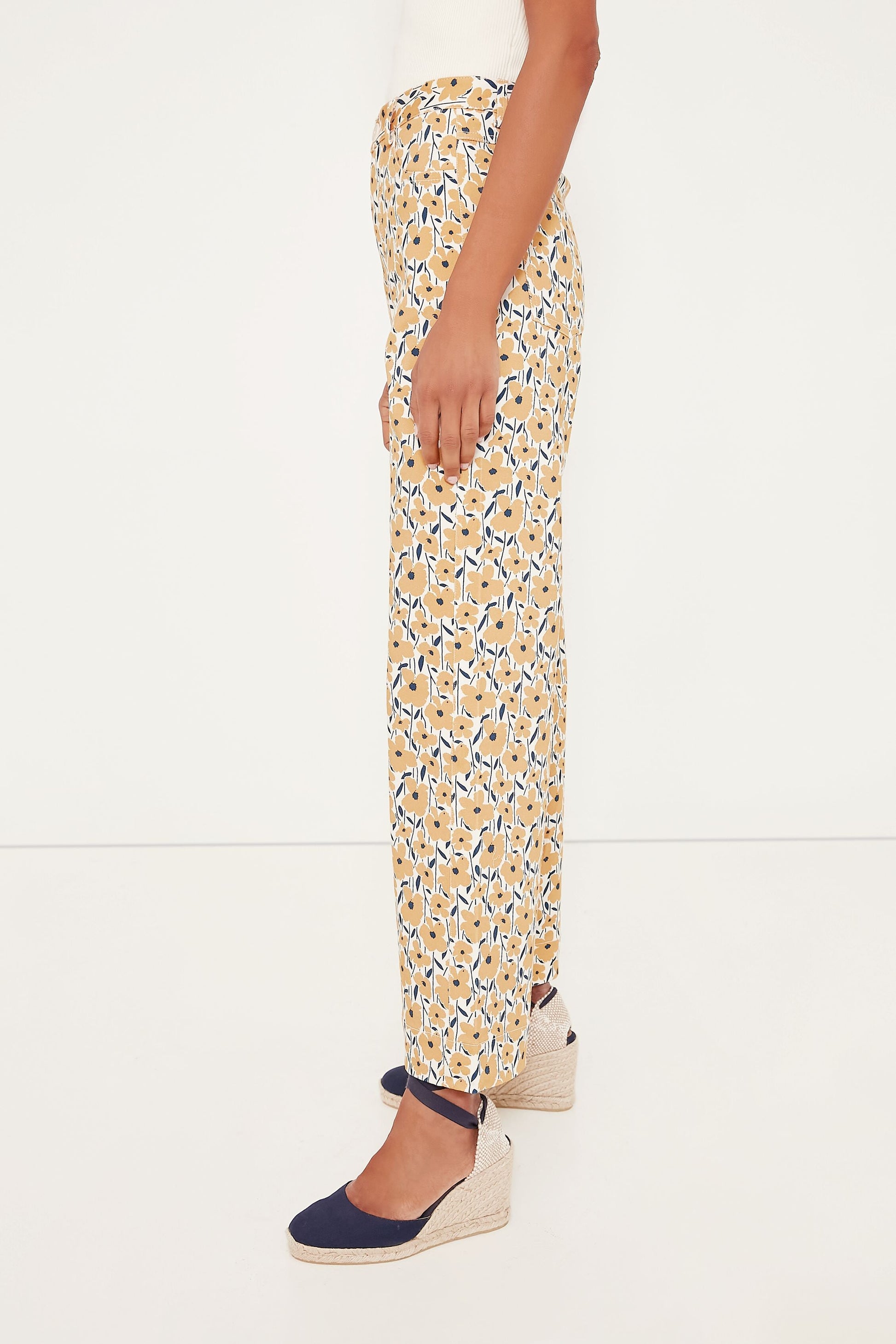 Savor the sunshine in the Sharon's Flowers Gold Everyday Pant. Made from a comfortable stretch cotton twill printed with adorable yellow wildflowers, these bottoms feature a flattering high rise, a straight leg, and a kick flared hem with a wide cuff for a cute and casual touch. Complete your look by pairing with a basic tee and a tote bag to grab some fresh produce from your local market, or go for a blouse and espadrilles to meet your girls for post-work palomas!